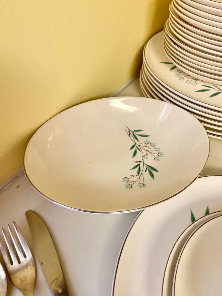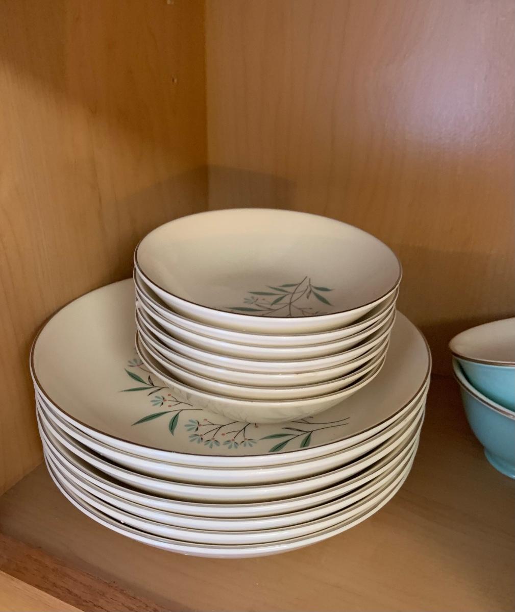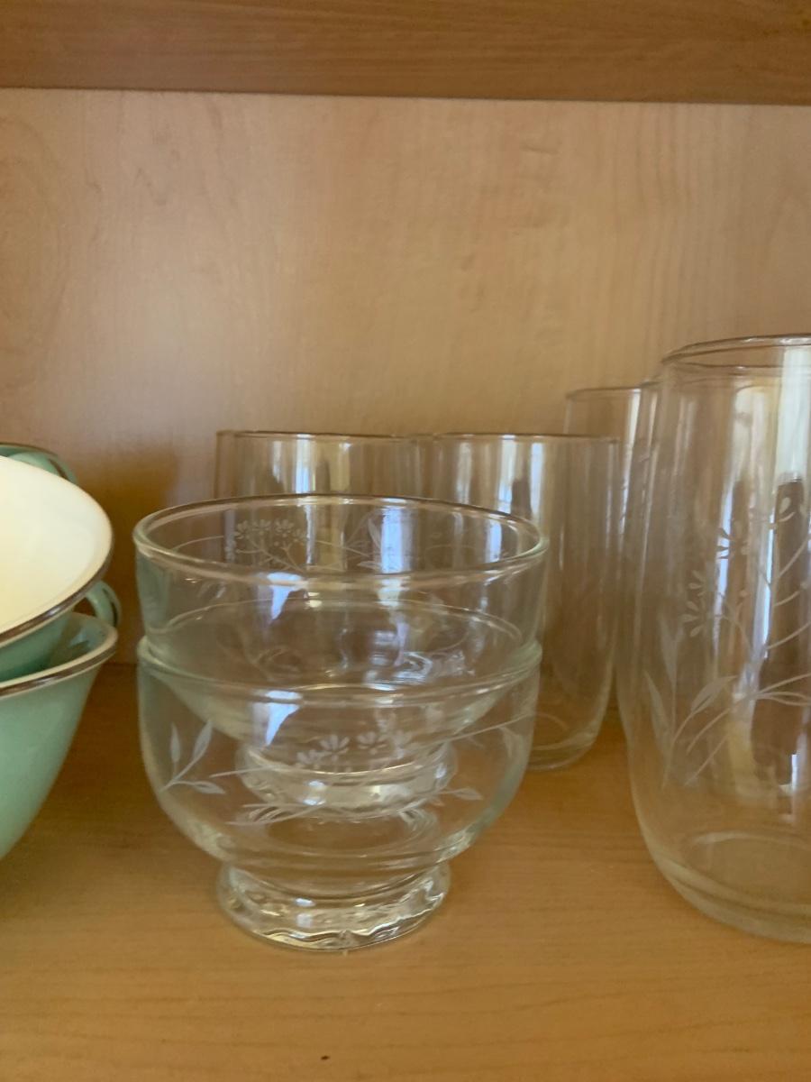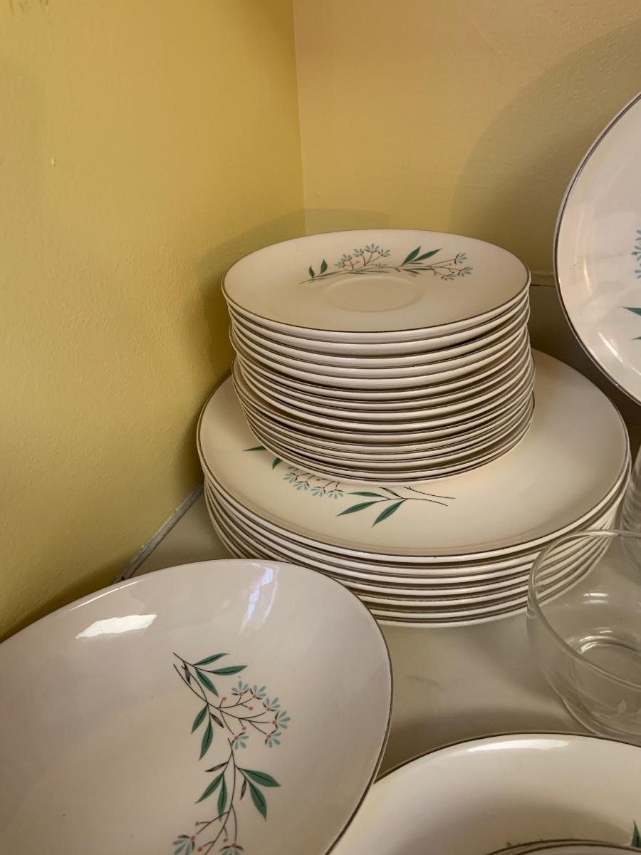LOT:126G: Taylor Smith Taylor - Petal Lane 1959 Homemaker Set (Not Complete) Includes Dishes Bowls, Cups Glasses and Flatware. 46 Pieces of China, 16 Pieces of Glassware and 16 Pieces of Flatware