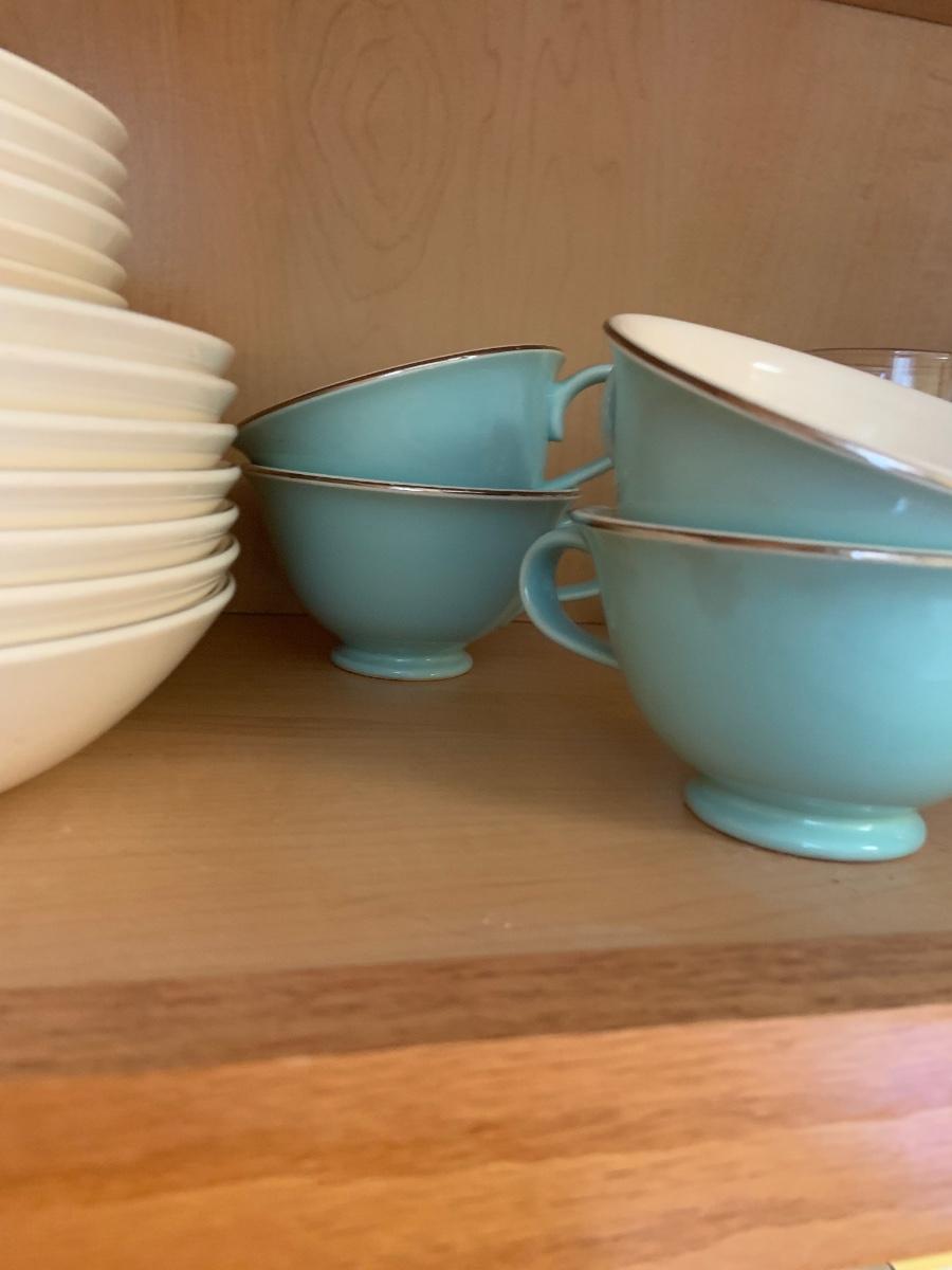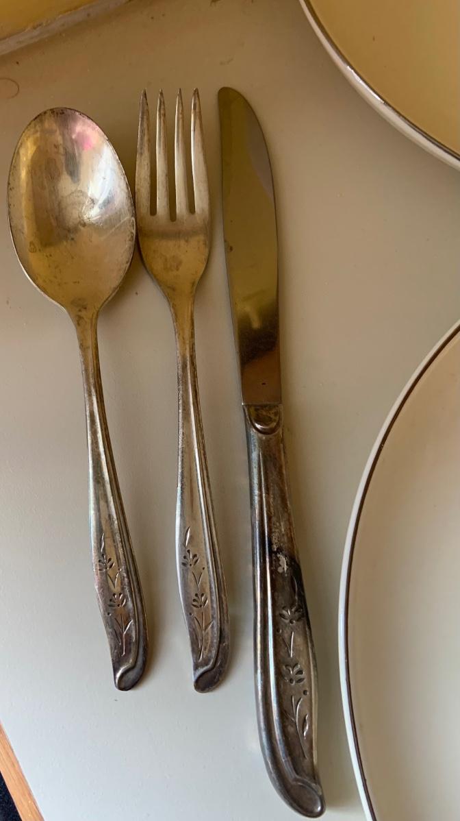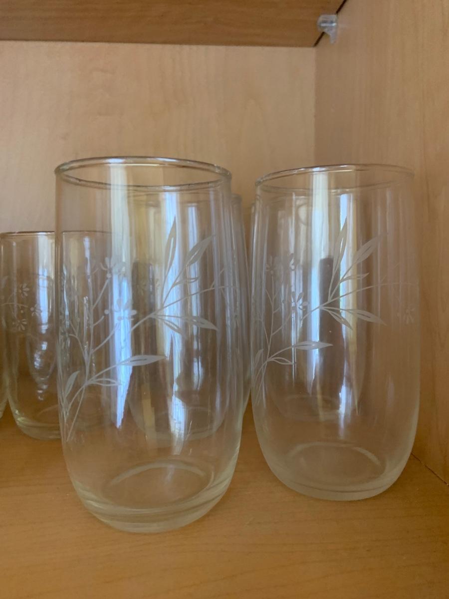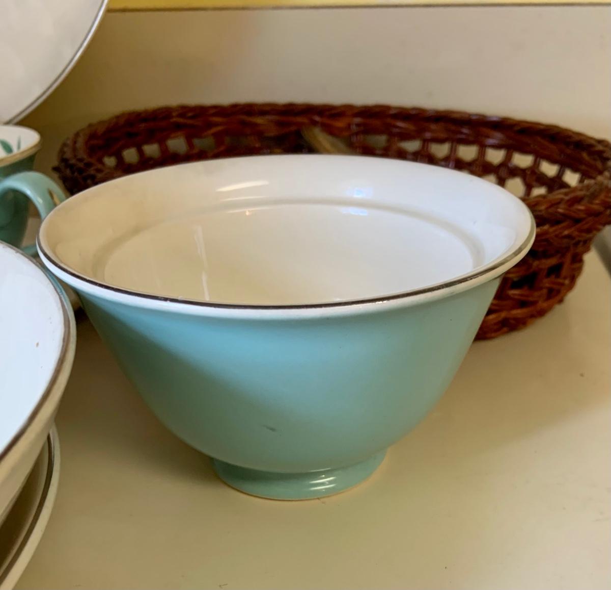 LOT:126G: Taylor Smith Taylor - Petal Lane 1959 Homemaker Set (Not Complete) Includes Dishes Bowls, Cups Glasses and Flatware. 46 Pieces of China, 16 Pieces of Glassware and 16 Pieces of Flatware