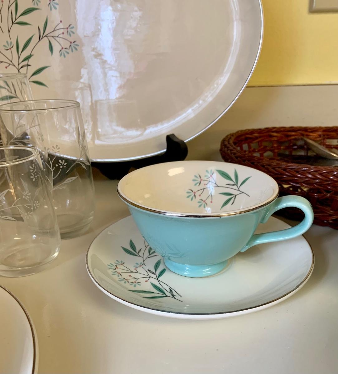 LOT:126G: Taylor Smith Taylor - Petal Lane 1959 Homemaker Set  (Not Complete) Includes Dishes Bowls, Cups Glasses and Flatware.  46 Pieces of China, 16 Pieces of Glassware and 16 Pieces of Flatware