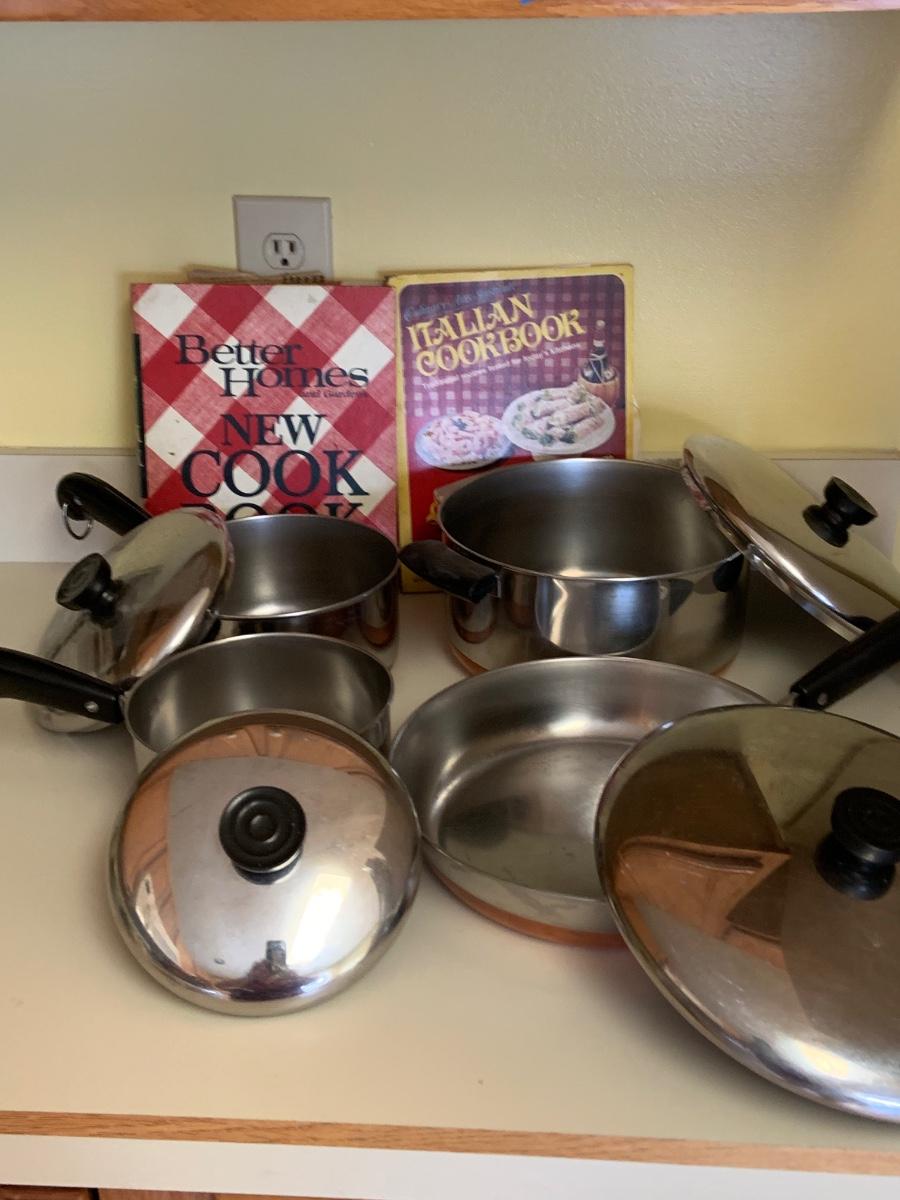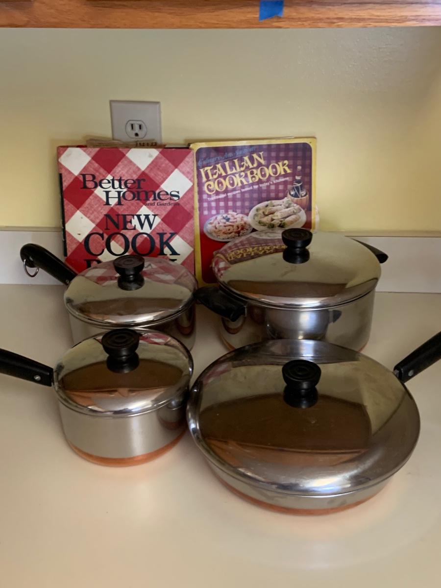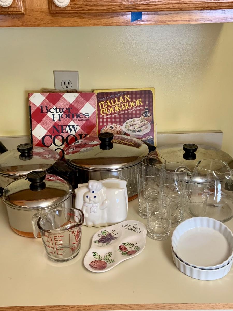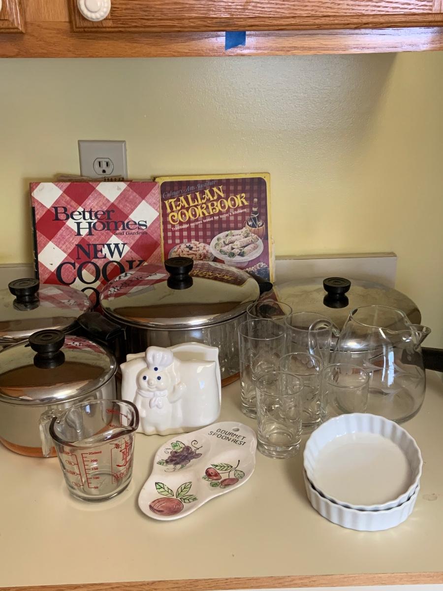 LOT:130: Kitchen Esentials Including Revere Copper Bottoms Pots and Pan with Lids Anchor Hockings  Measuring Cup, Princess House Glasses and Pitcher, Pilsbury Doughboy Napkin Holder Cookbooks and More