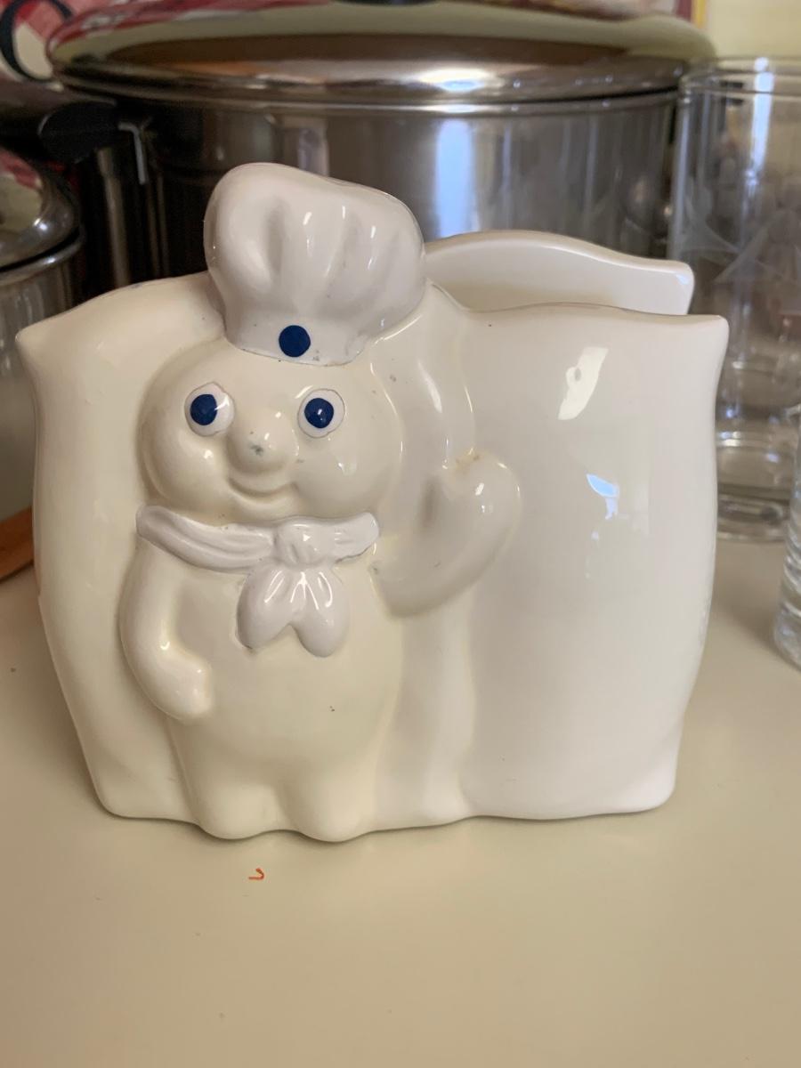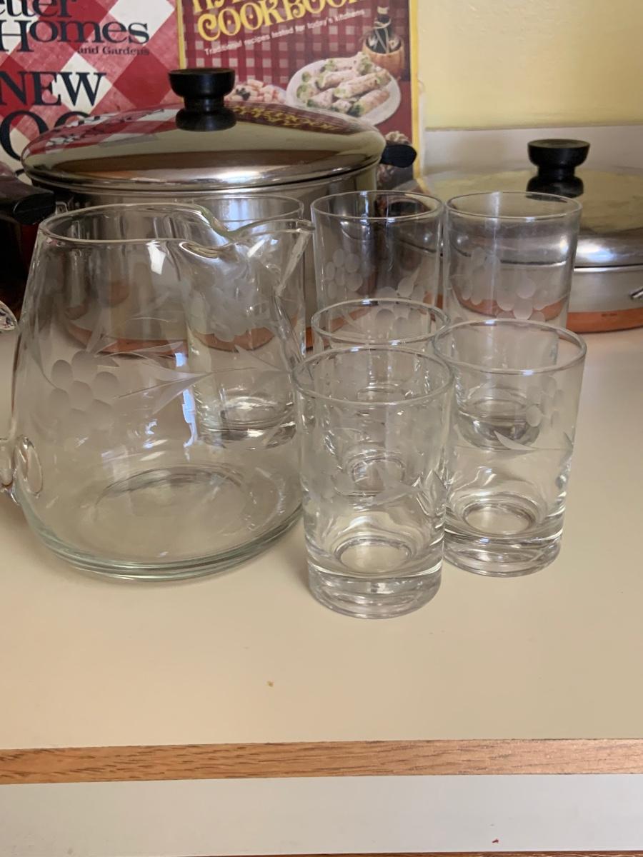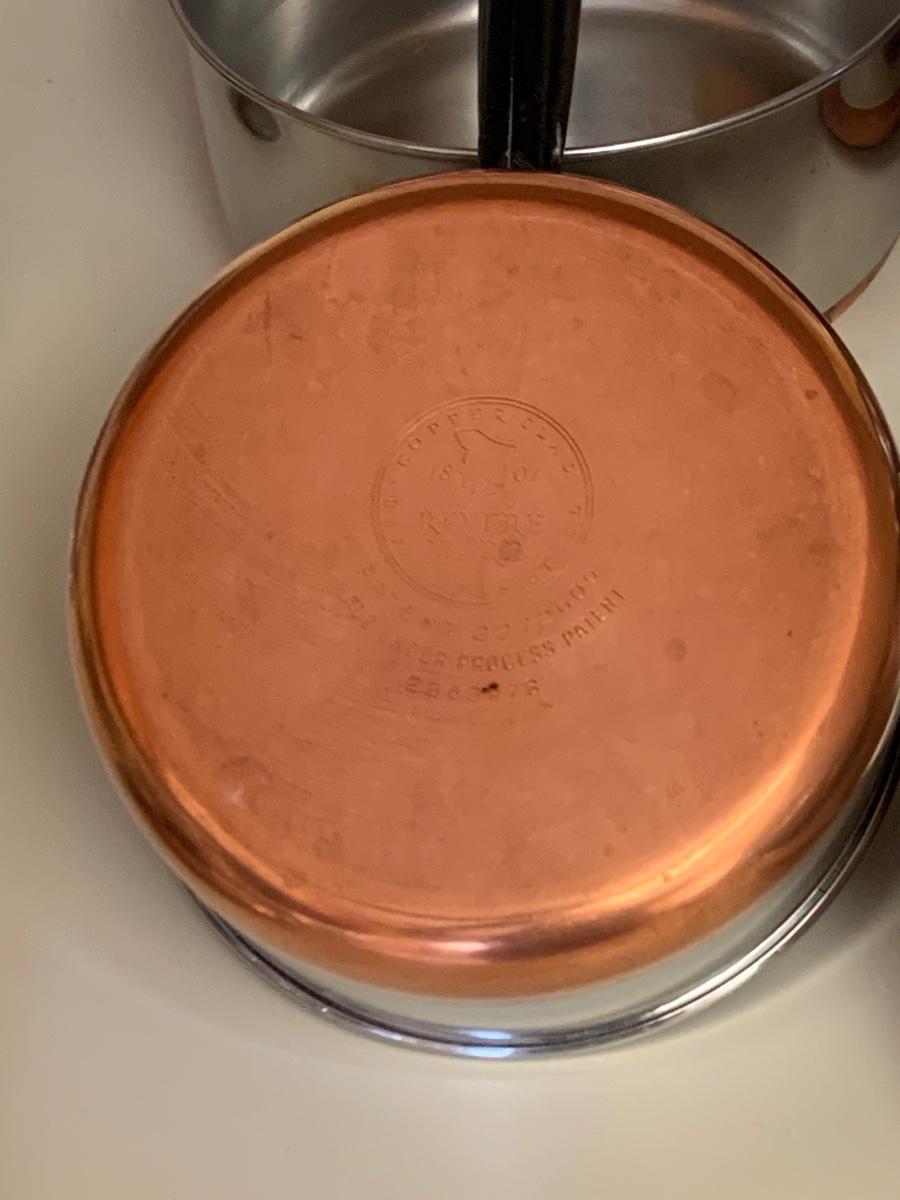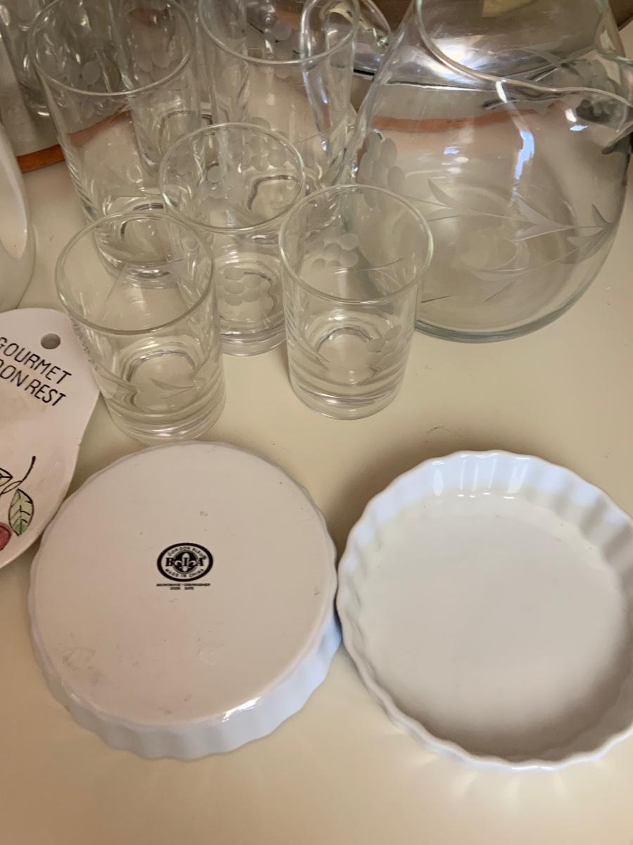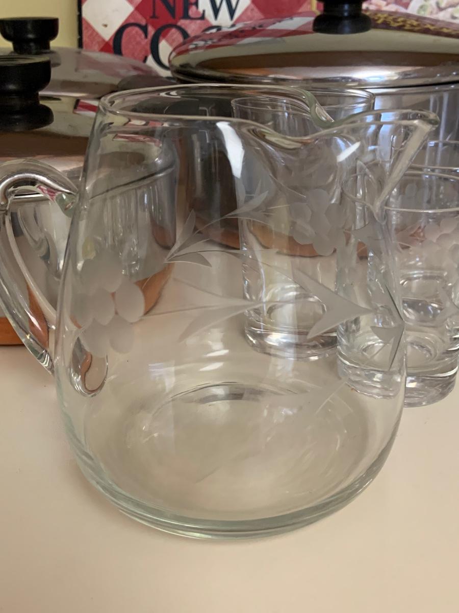 LOT:130: Kitchen Esentials Including Revere Copper Bottoms Pots and Pan with Lids Anchor Hockings  Measuring Cup, Princess House Glasses and Pitcher, Pilsbury Doughboy Napkin Holder Cookbooks and More
