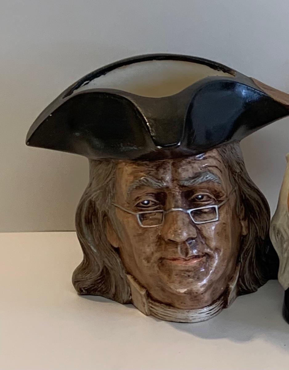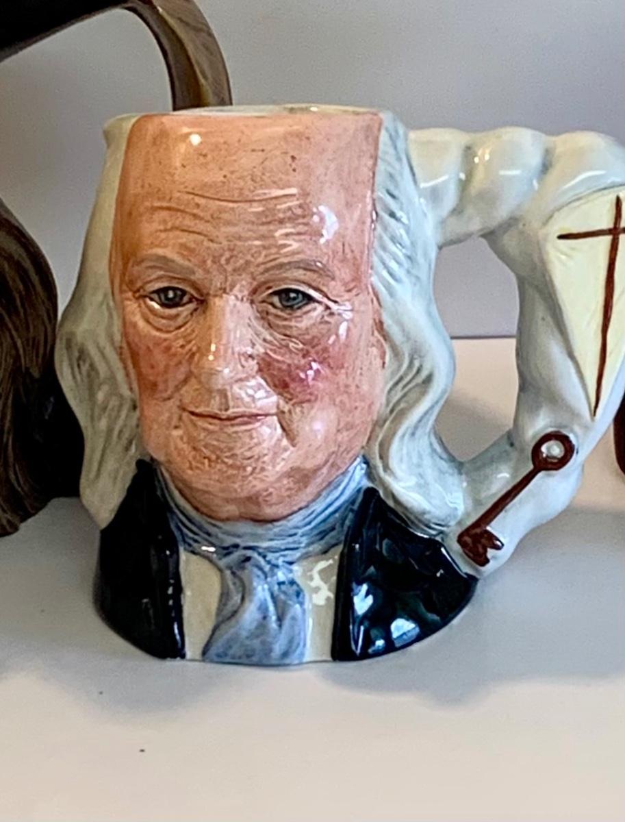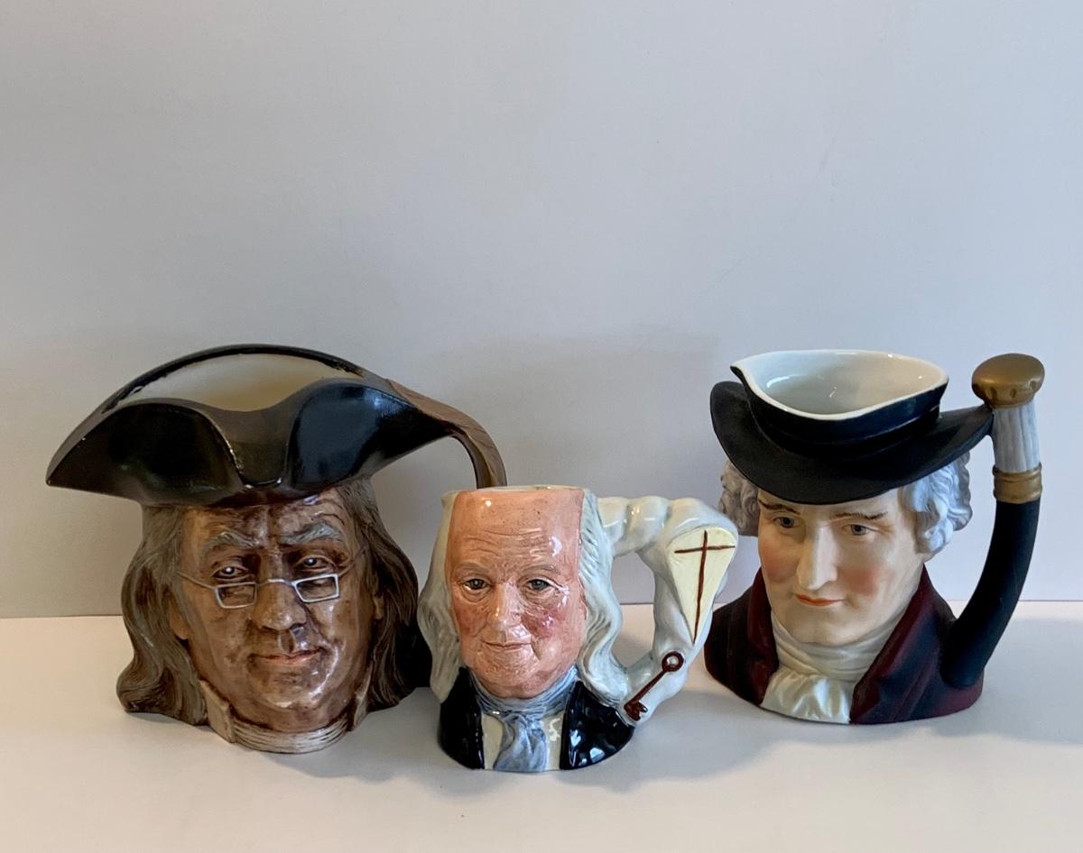 LOT:132G: Founding Fathers Charactor Mugs/Jugs - 1982 Royal Doulton Benjamin Franklin 3" Toby Mug; Lefton George Washington Charactor Jug and an Unbranded Ben Franklin Jug