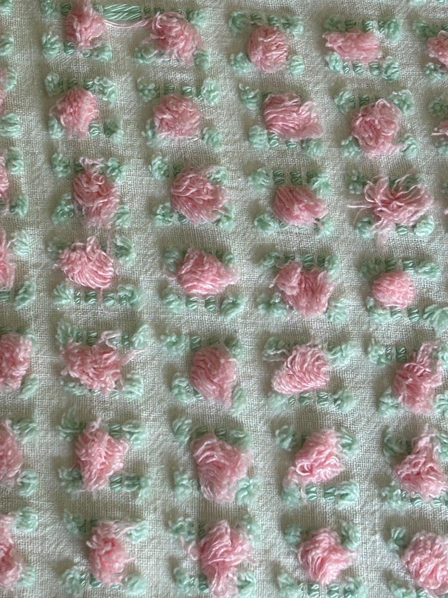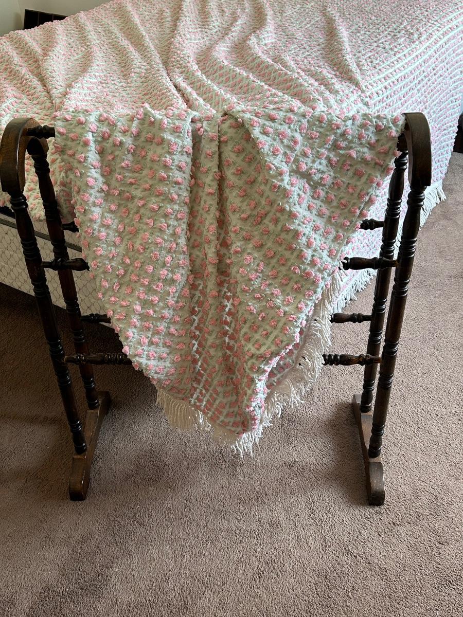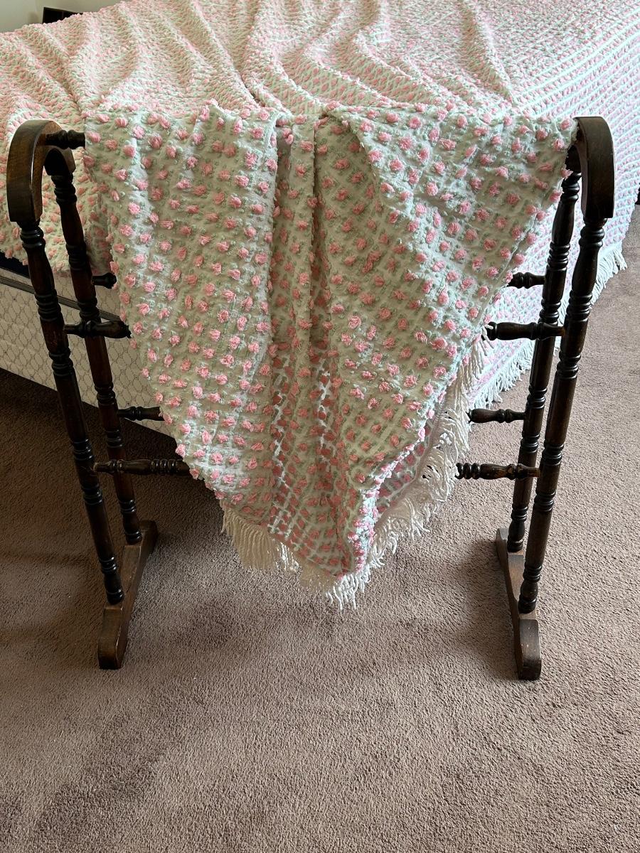 Vintage bedspread with rose details. Quilt rack measures 28"x7"x33'.
