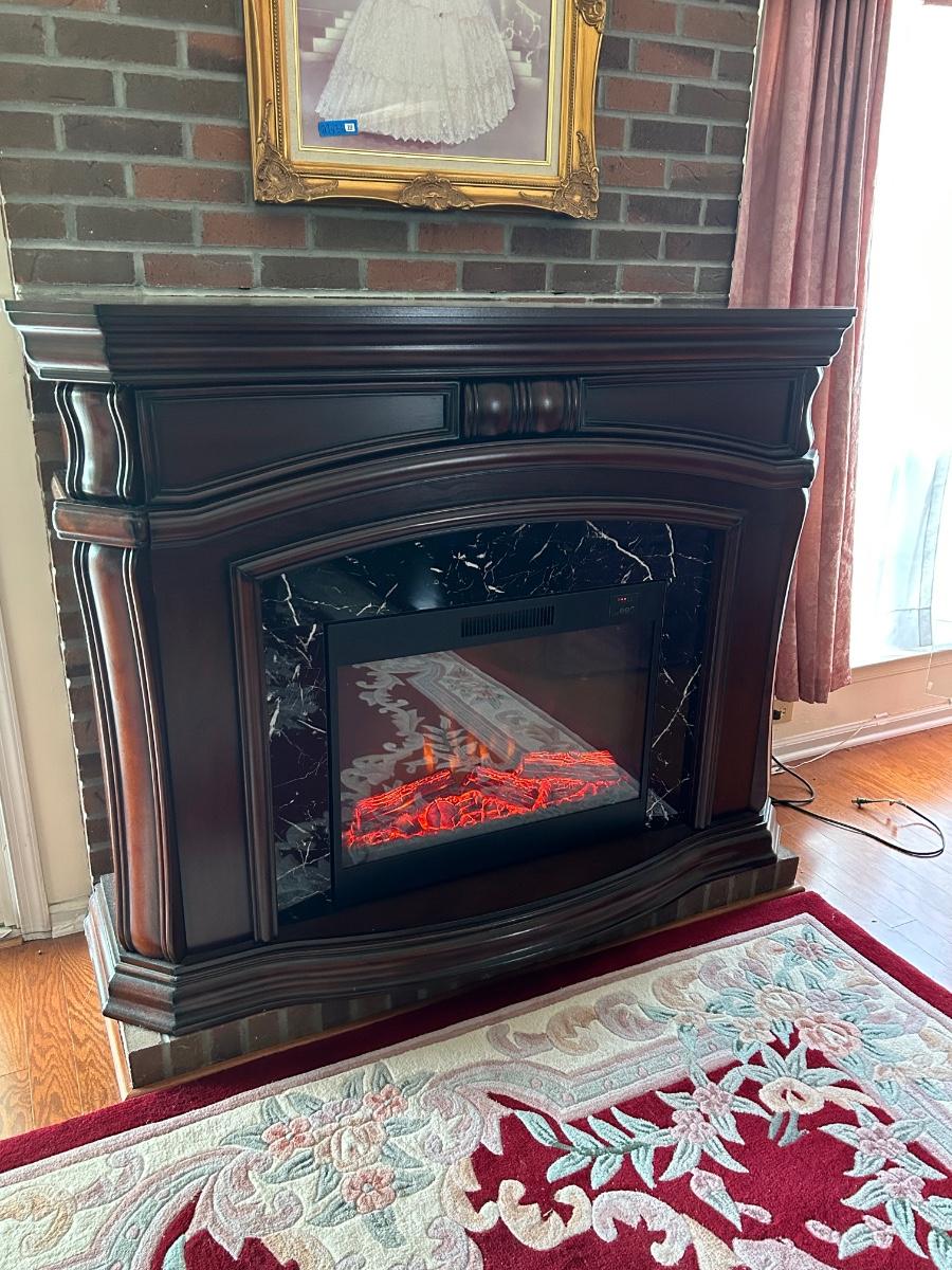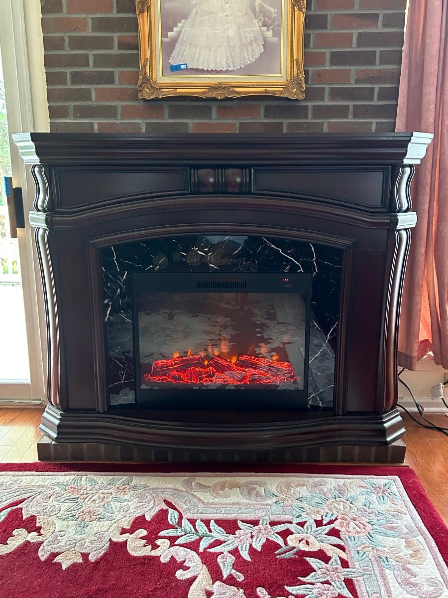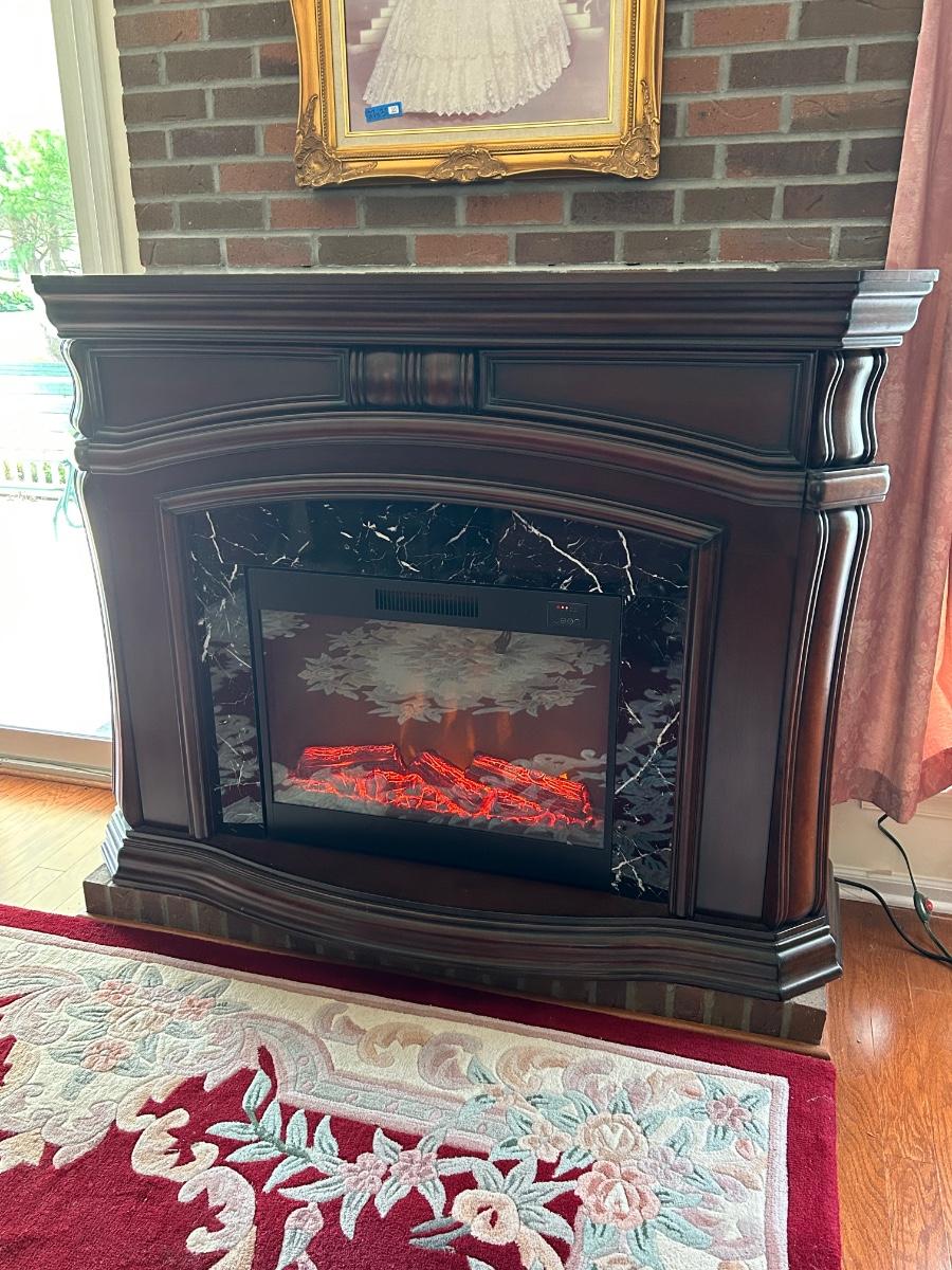 Cherry wood tone and marble look insert. 62"x17"x48" in size. Fireplace is a room heater and has glowing artificial fire.