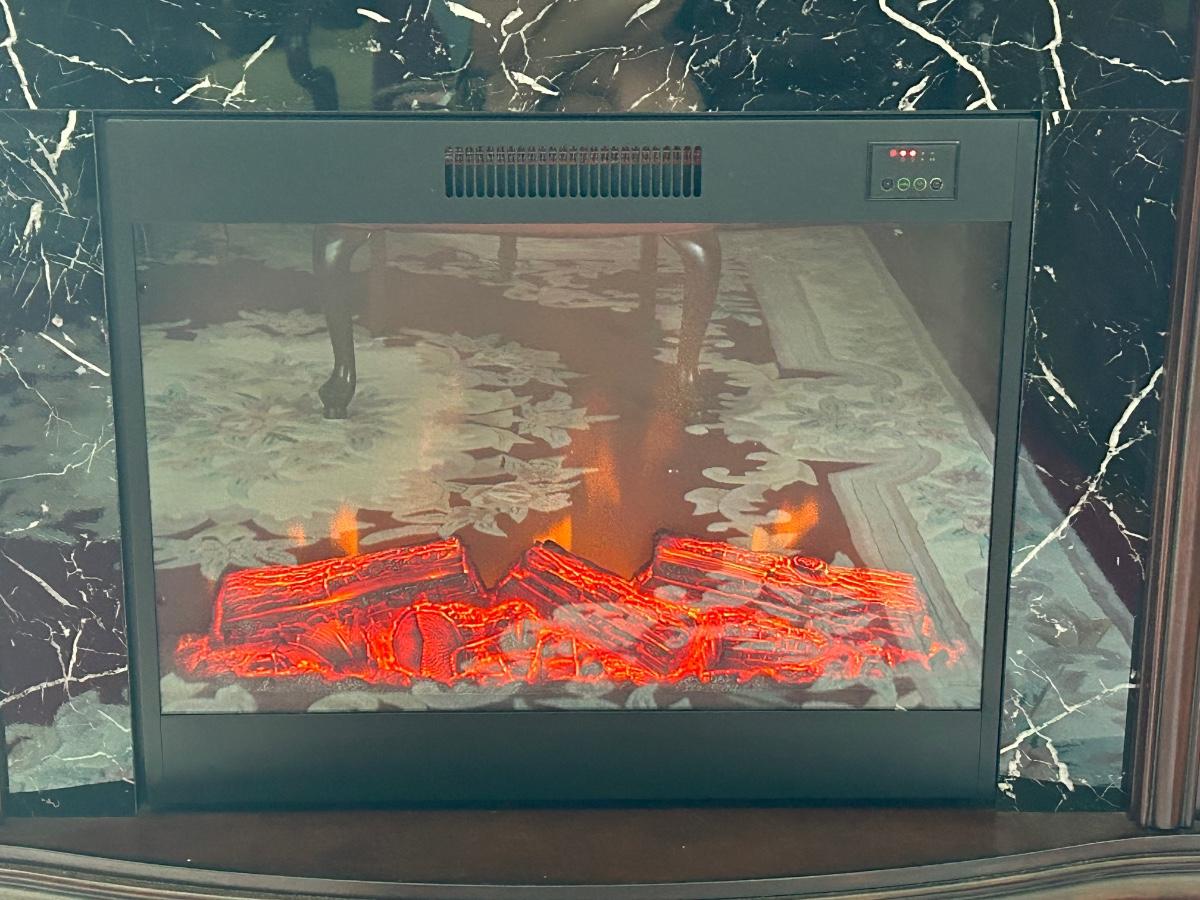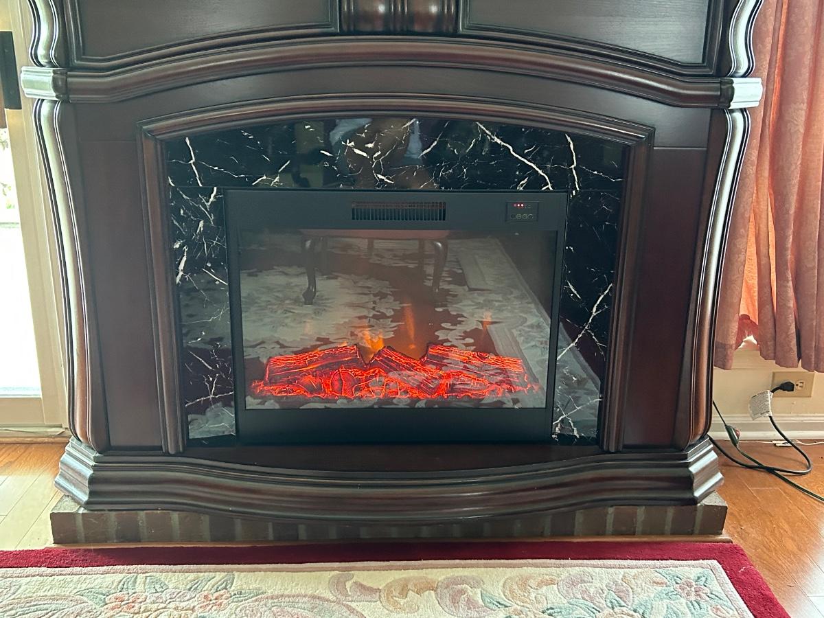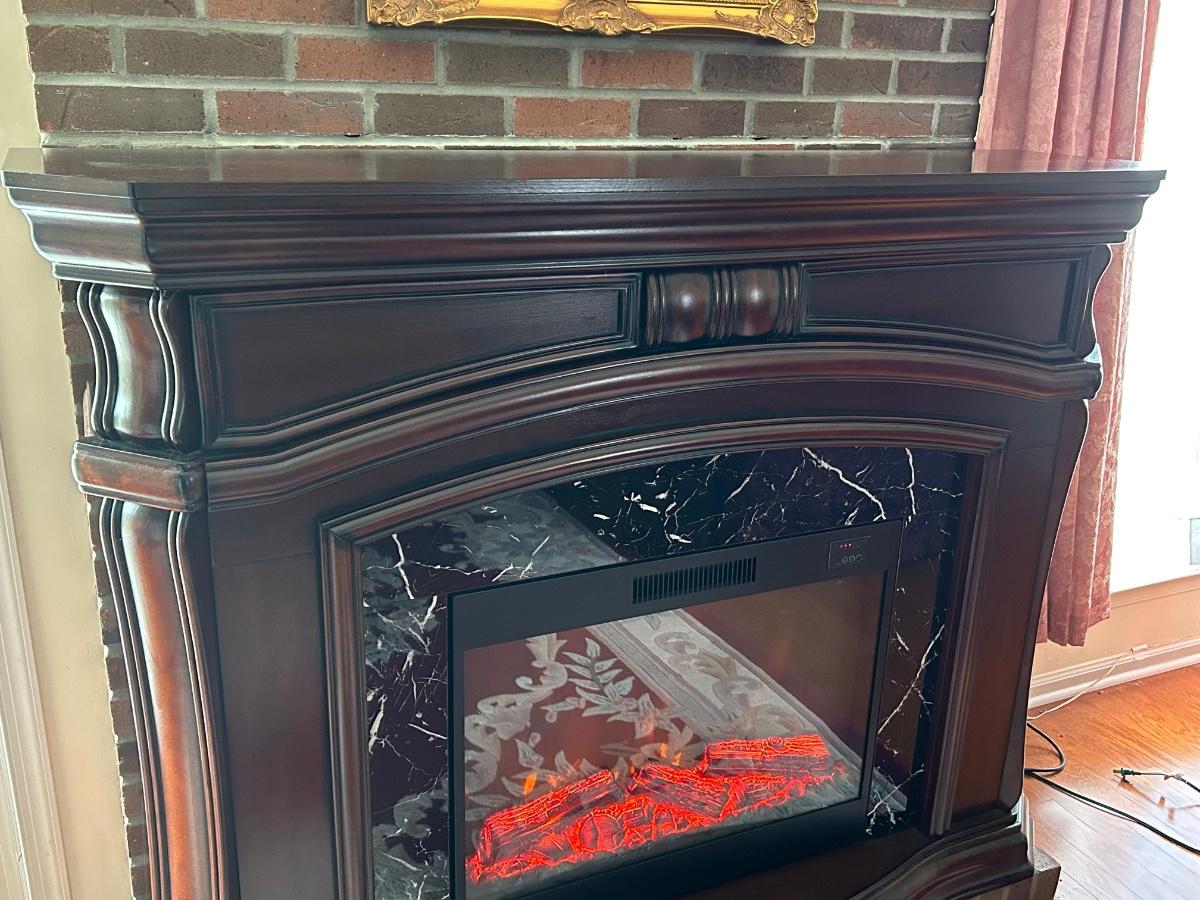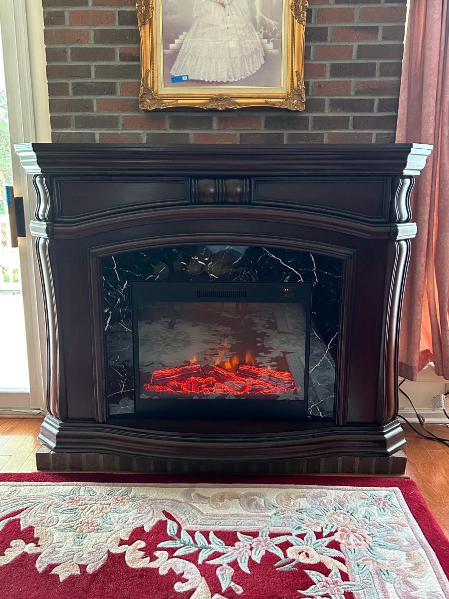 Cherry wood tone and marble look insert. 62"x17"x48" in size. Fireplace is a room heater and has glowing artificial fire.