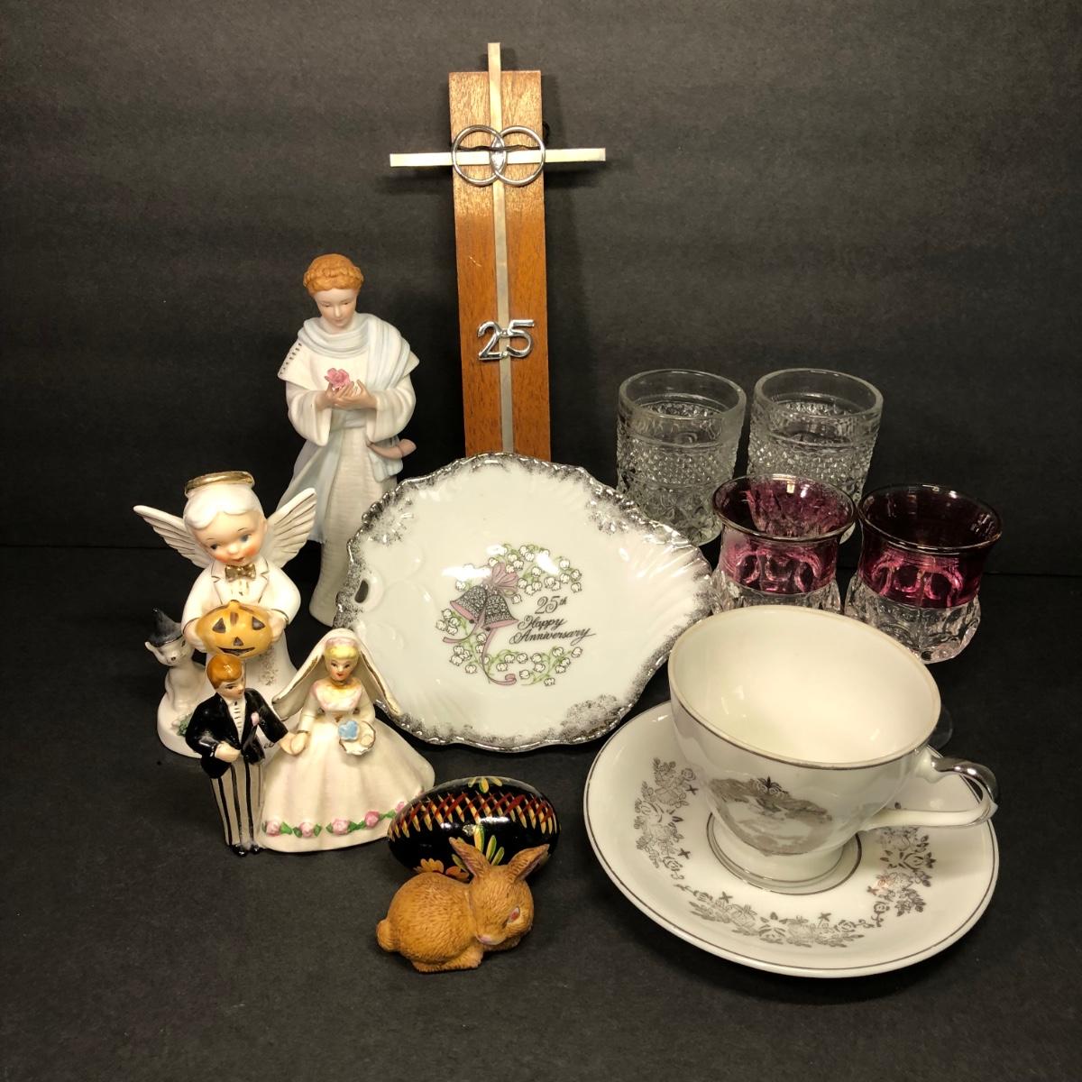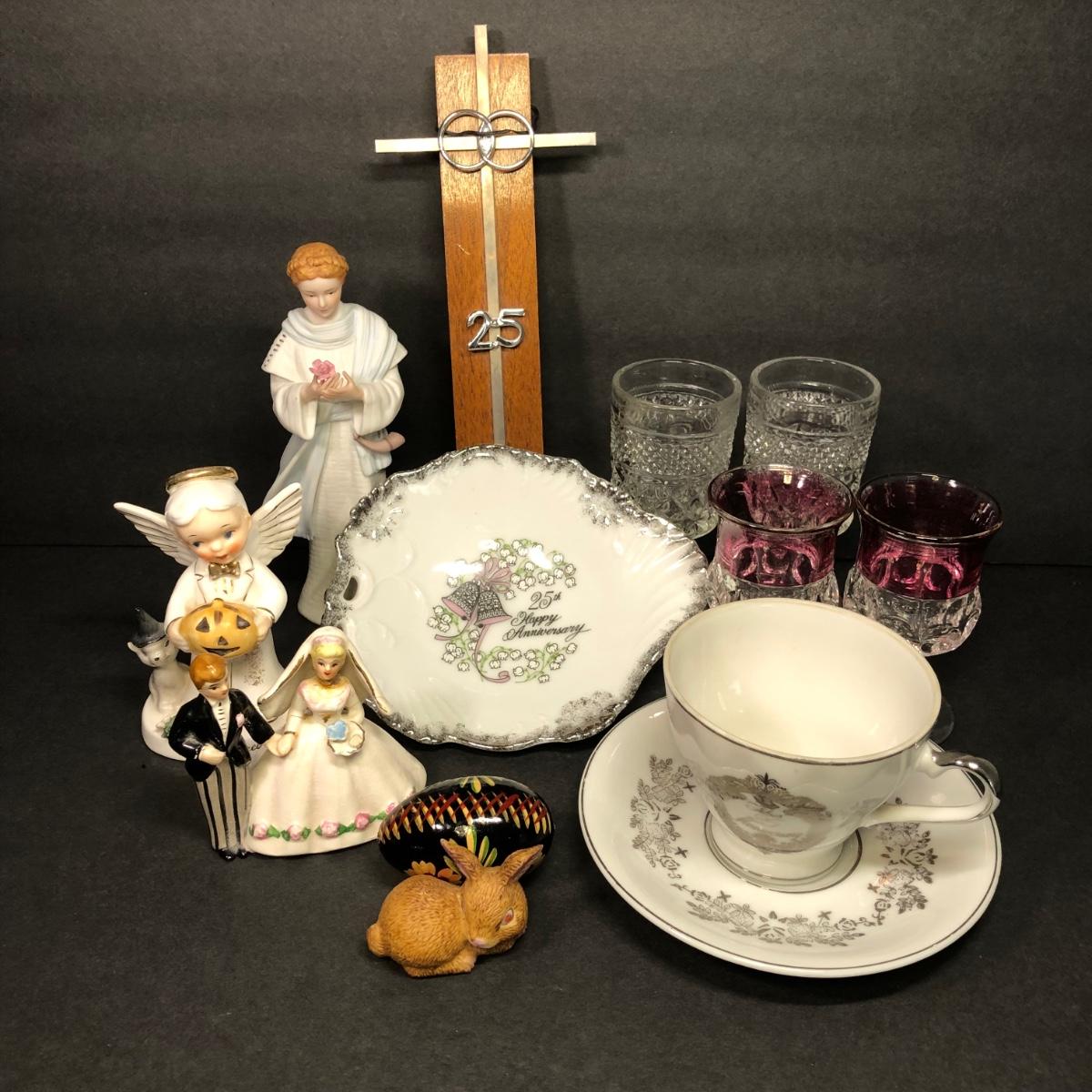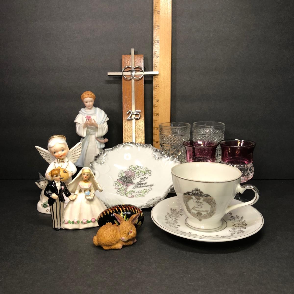 LOT 184M: Lenox Christmas Rose Figure, 25th Anniversary Commemorative Dish & Tea Cup w/ Saucer, Goebel Rabbit Figure, October Angel, Lefton Bride & Groom Figure & More