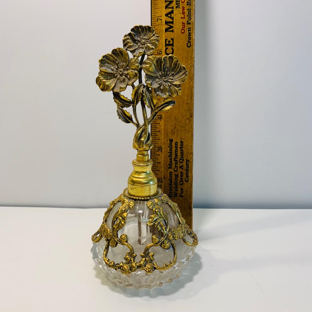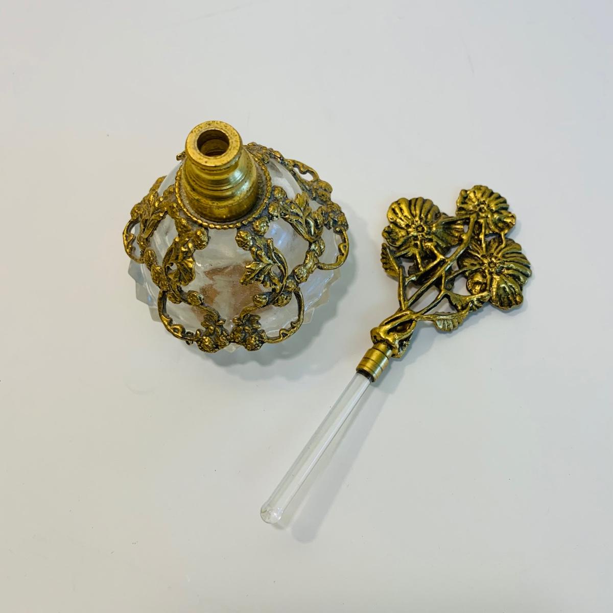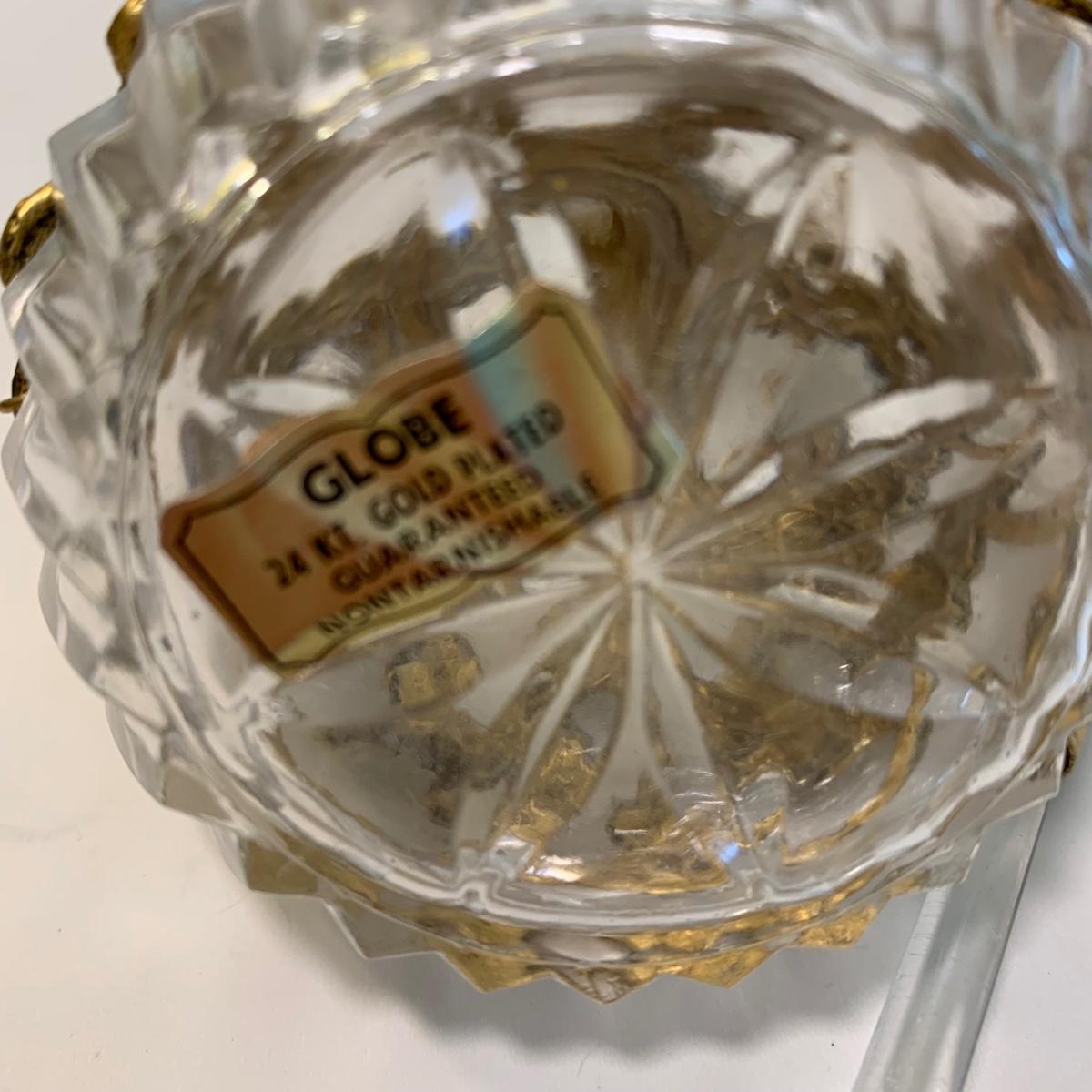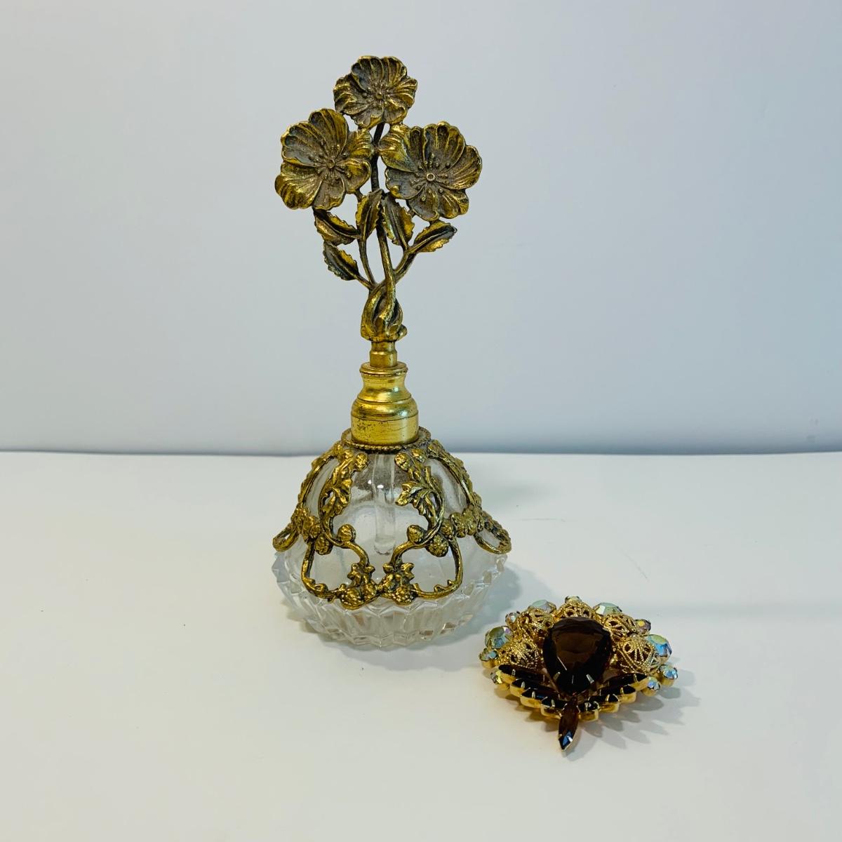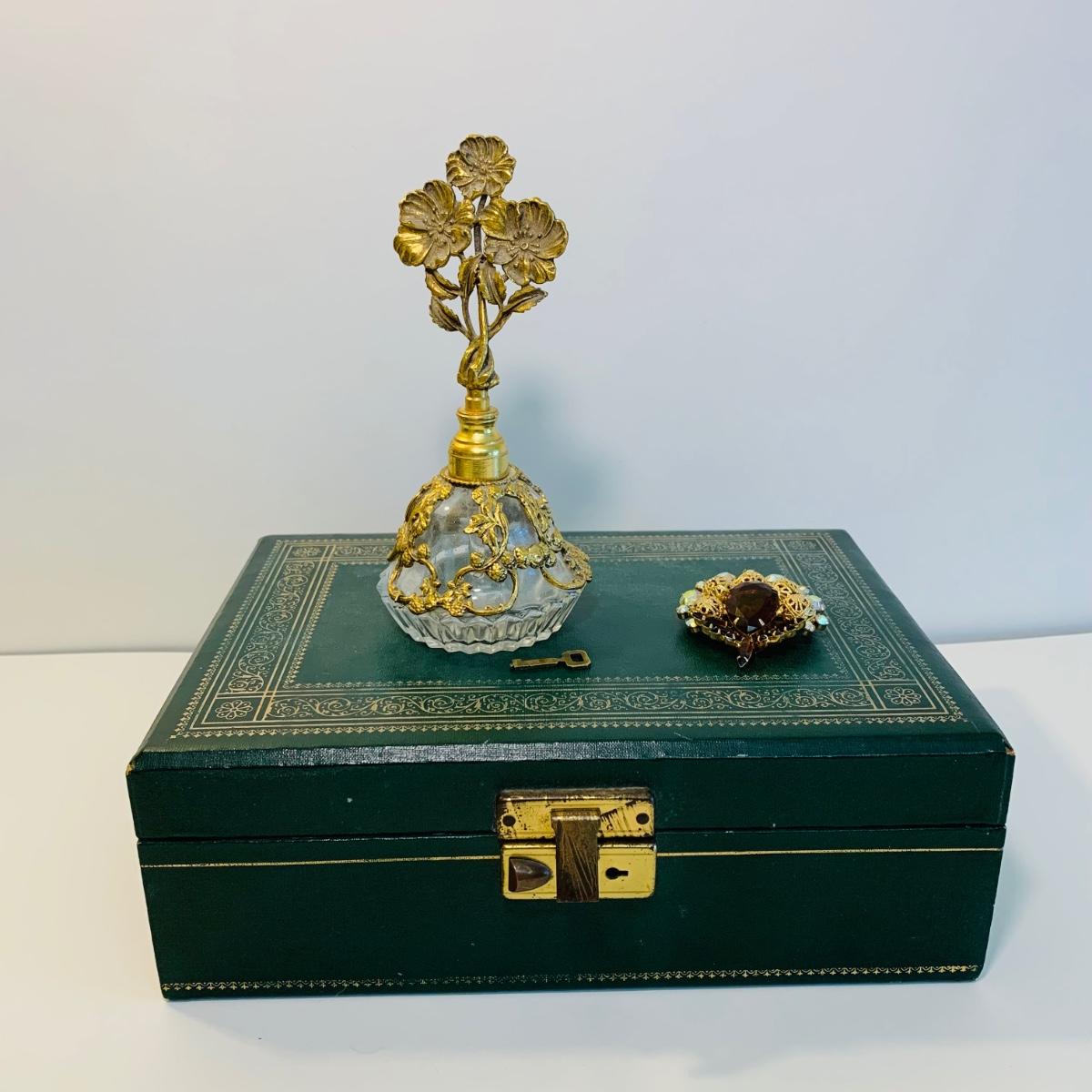 LOT 196: Globe 24kt. Gold Plated Perfume Bottle, Jewelry Box w/Key & Brooch