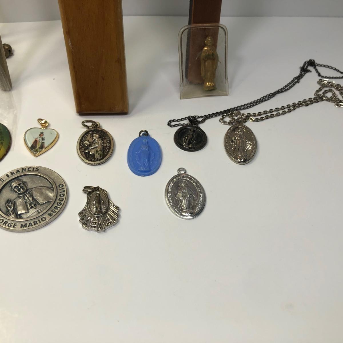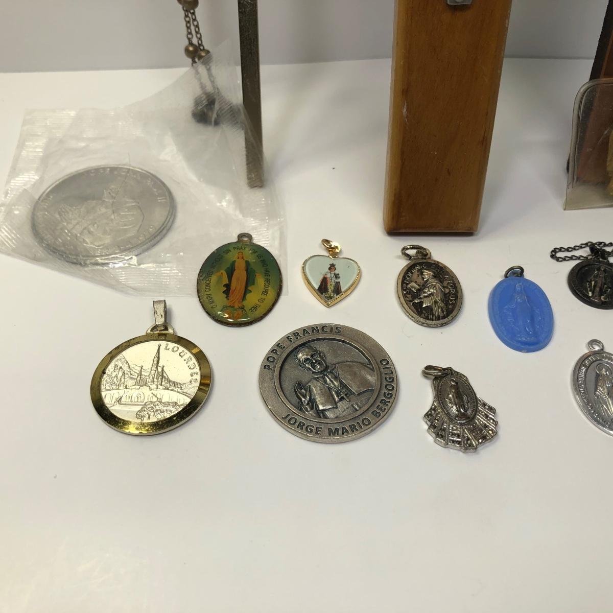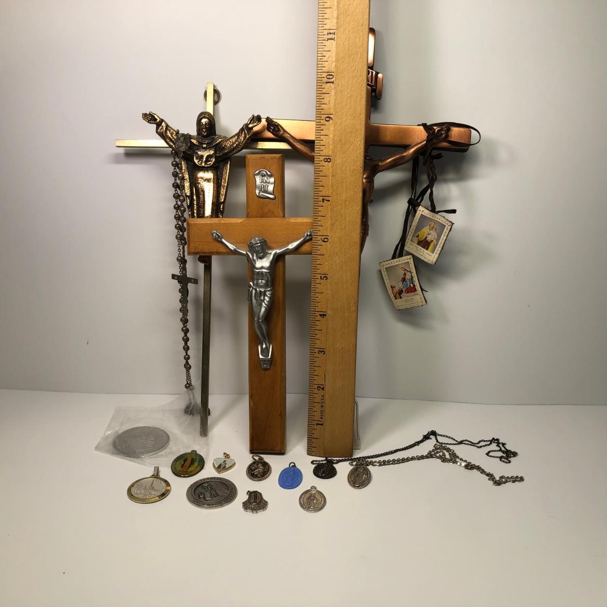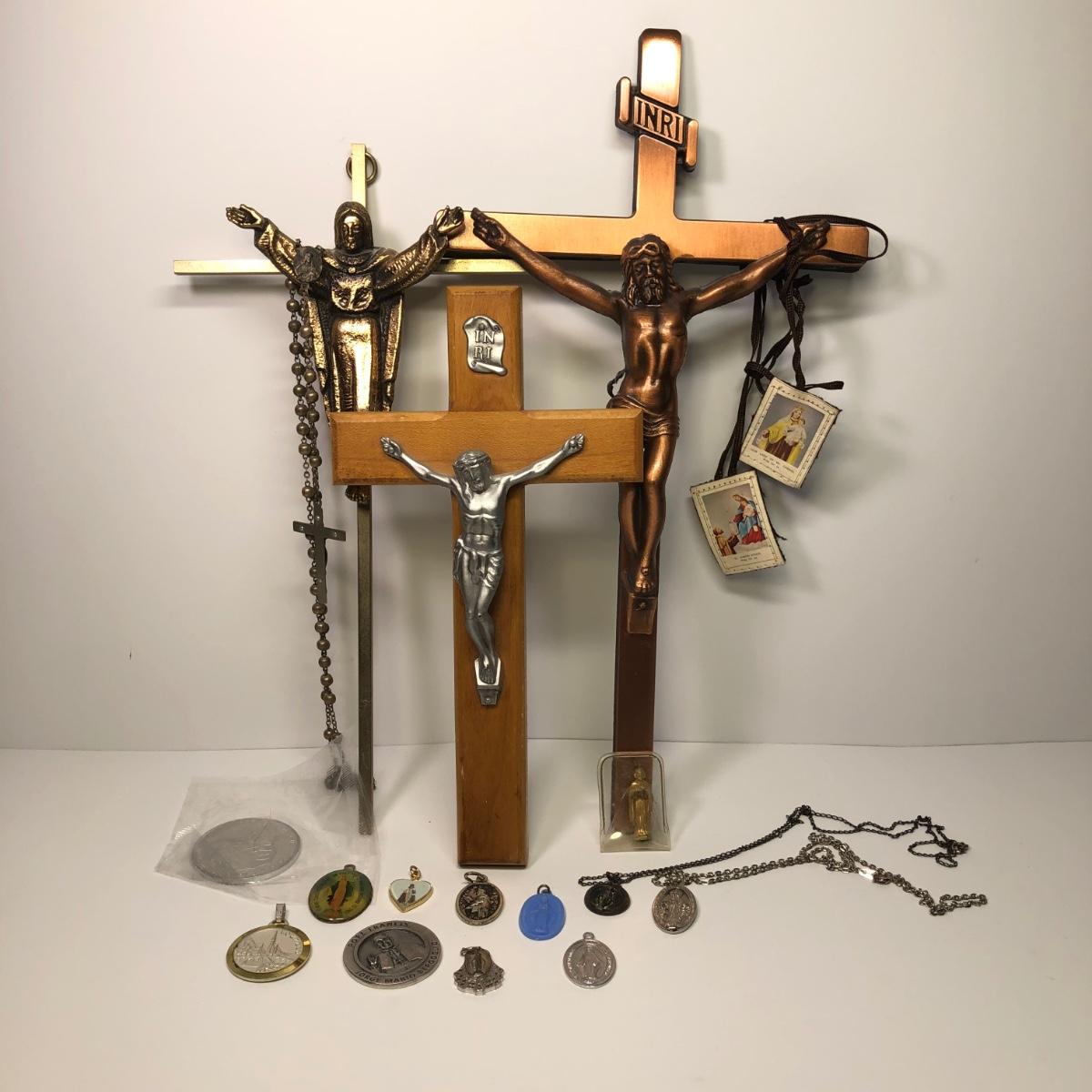 LOT 217M: Religious Collection - Crucifixes, Sterling Charm, Rosary, Religious Coins & Pendants