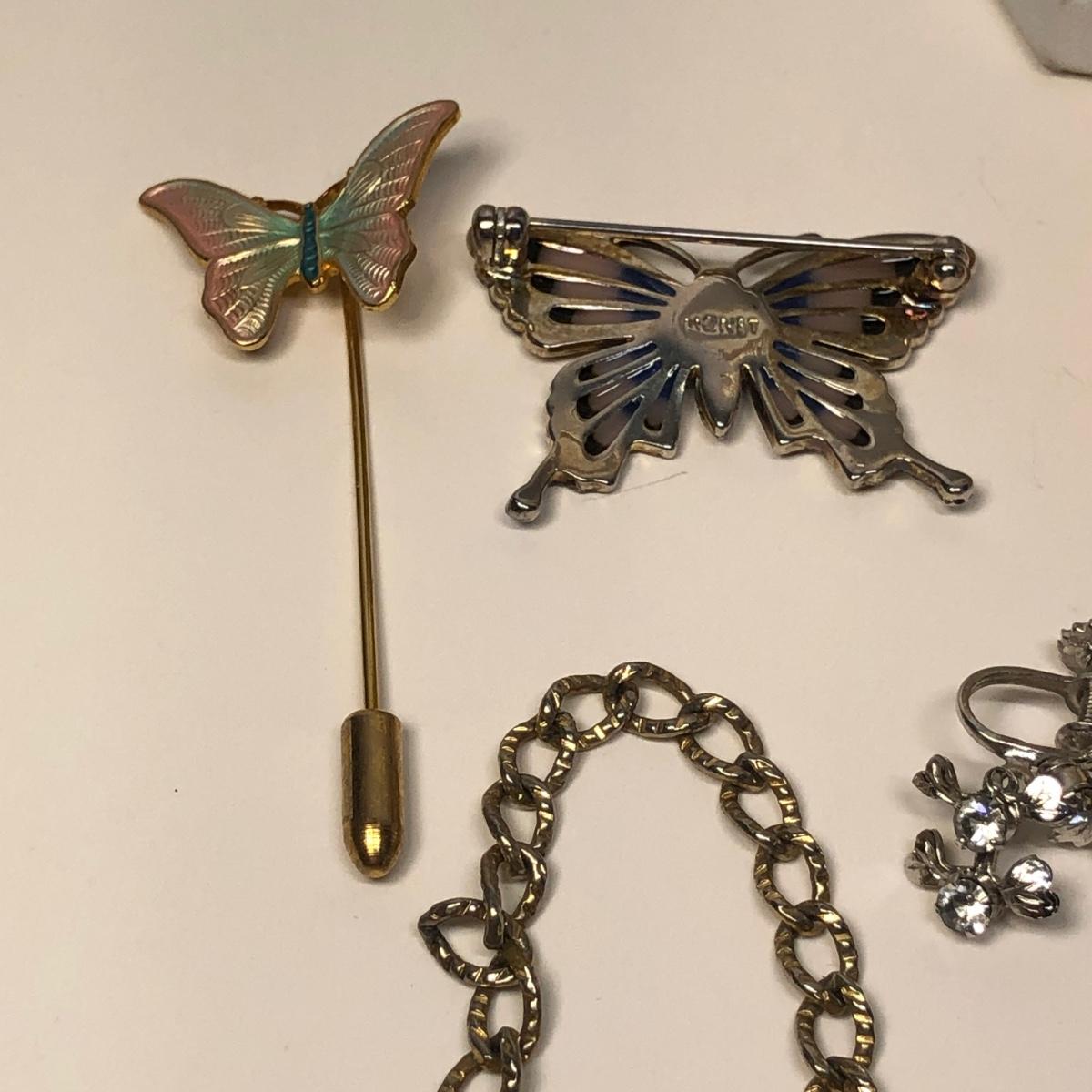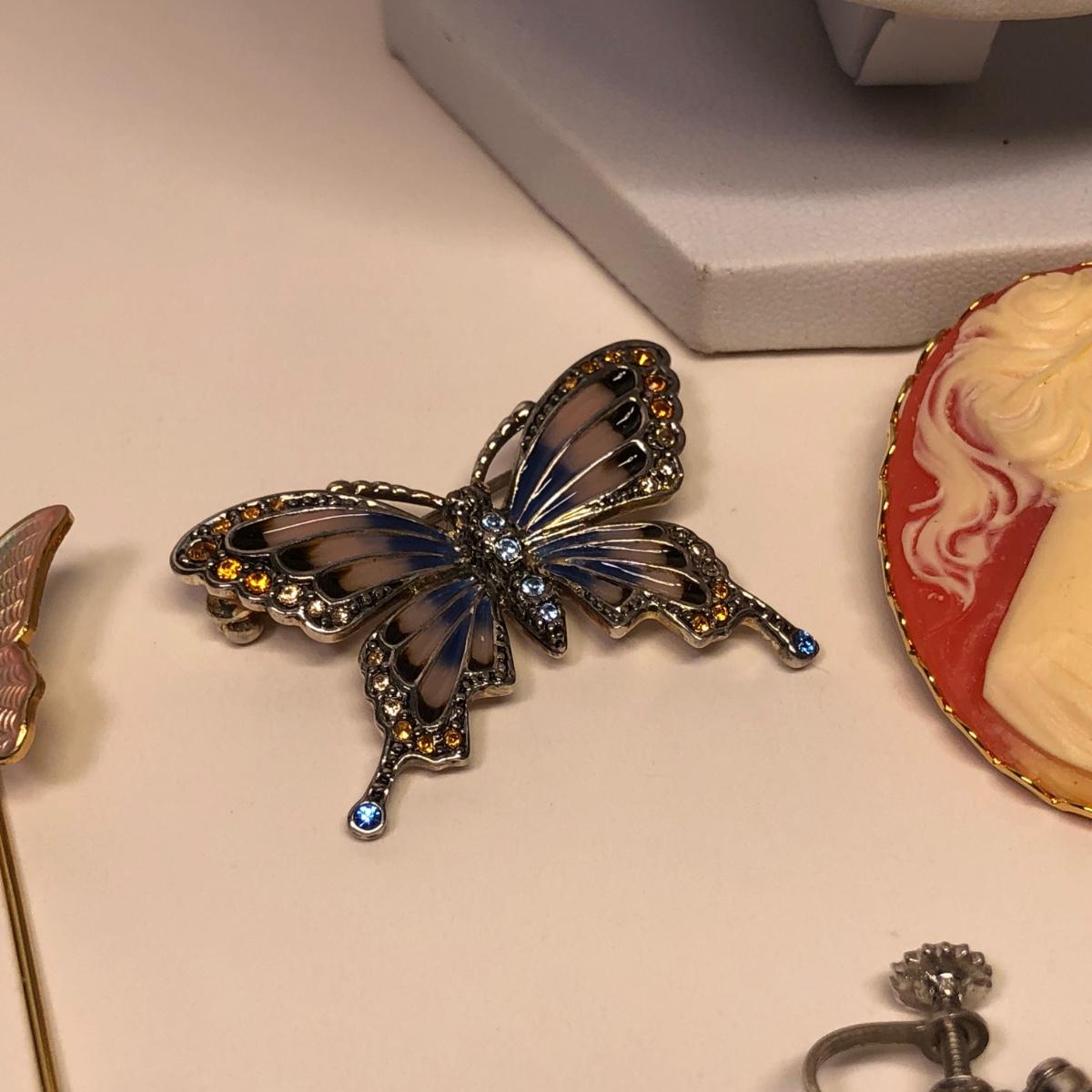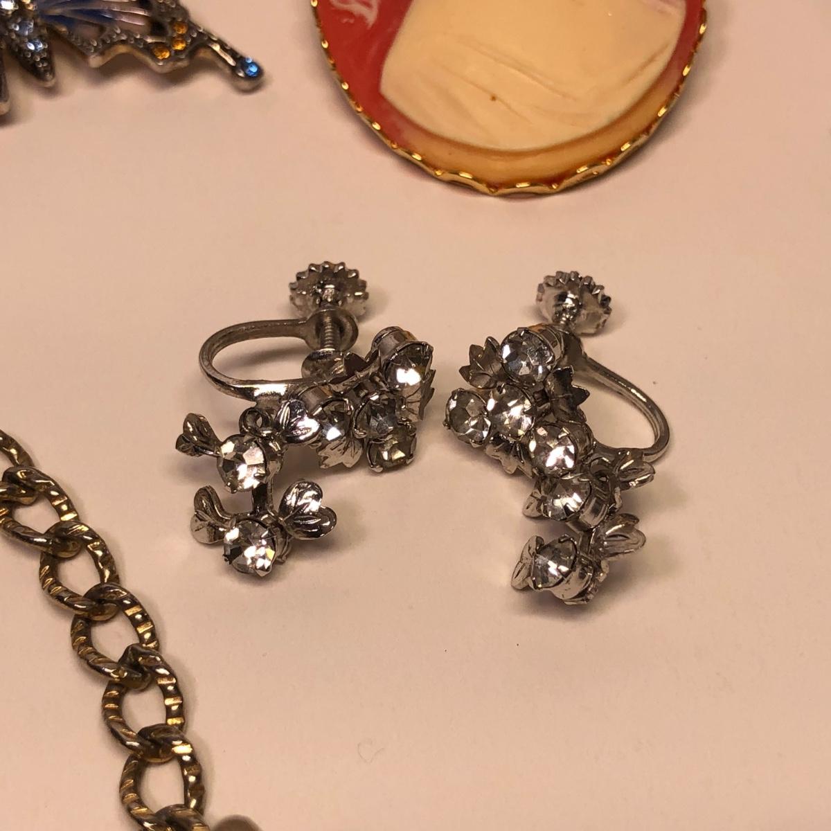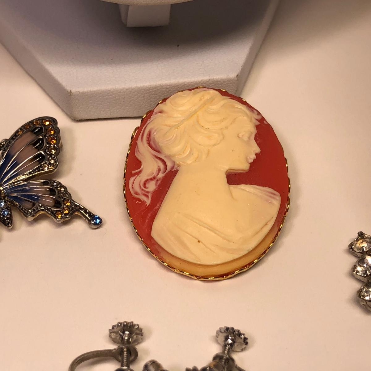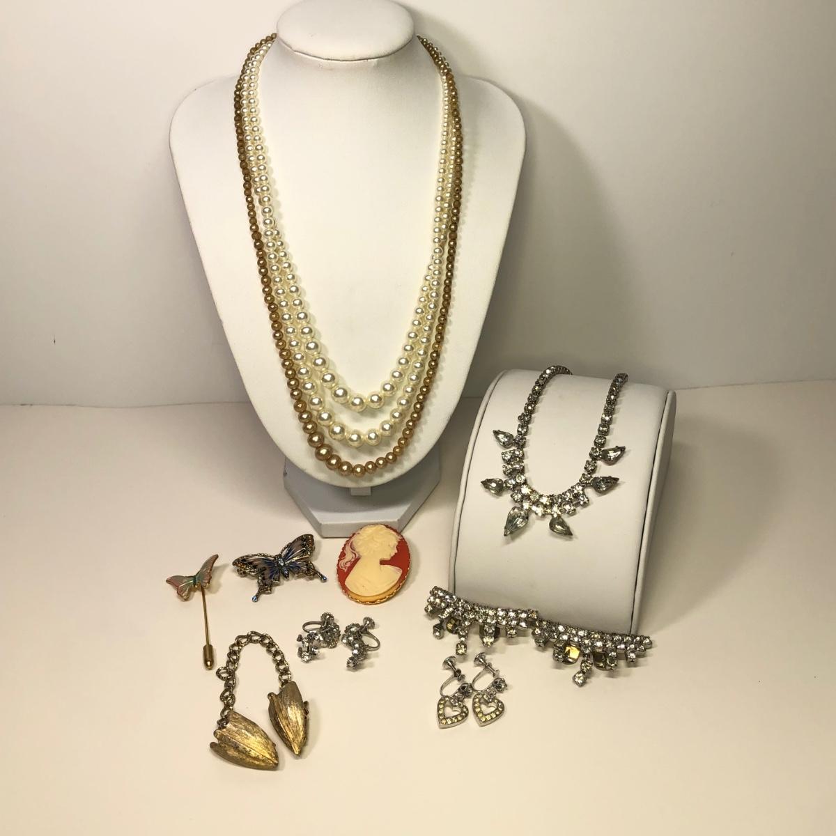 LOT 218M: Necklace & accessory Collection - Vintage Simulated Pearls w/ Ornate Clasp, Cameo Brooch, Monet Butterfly Pin & More