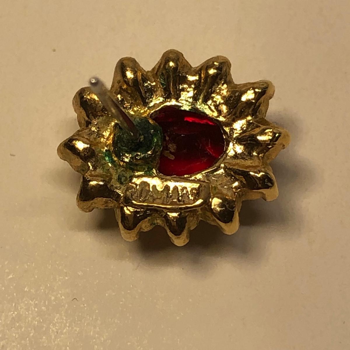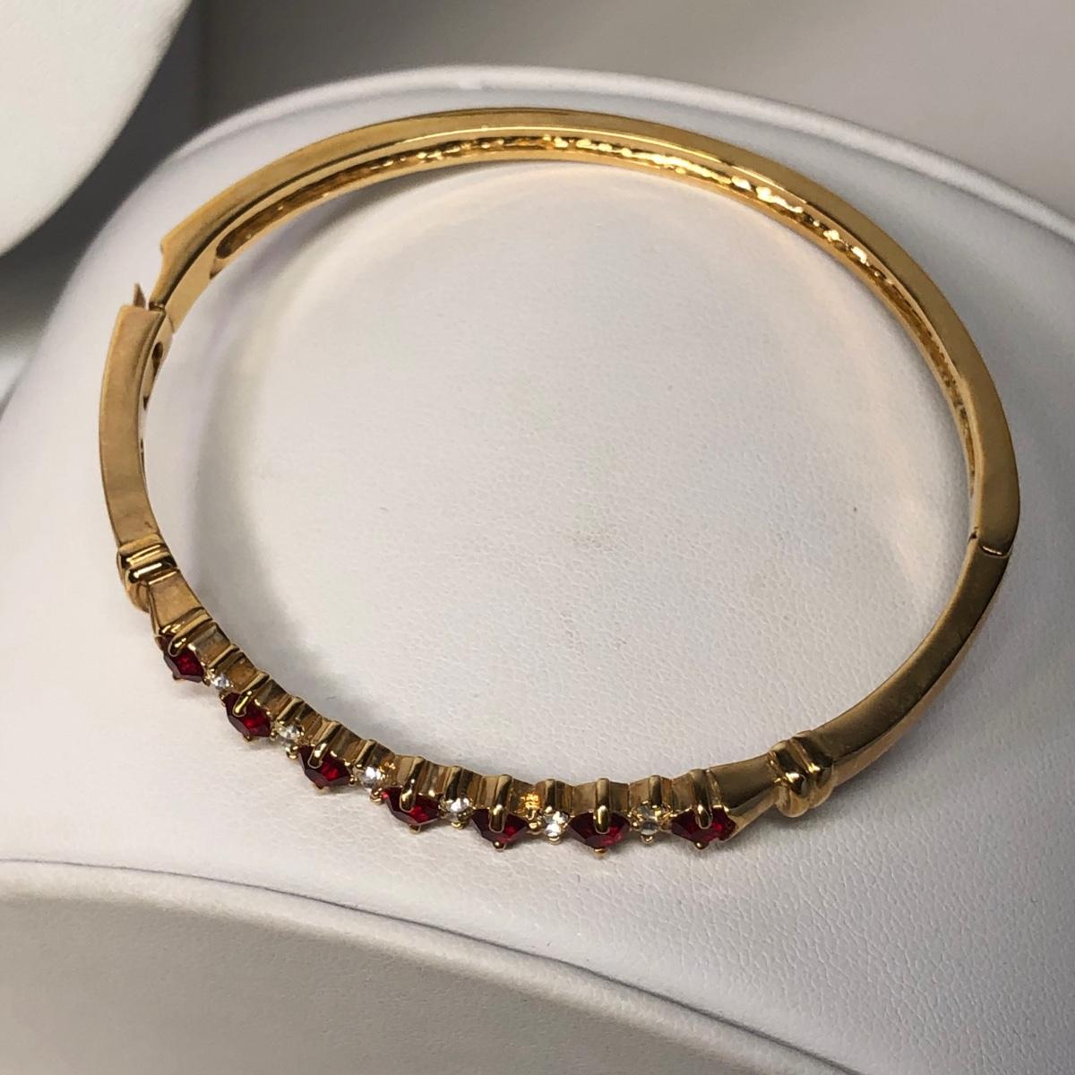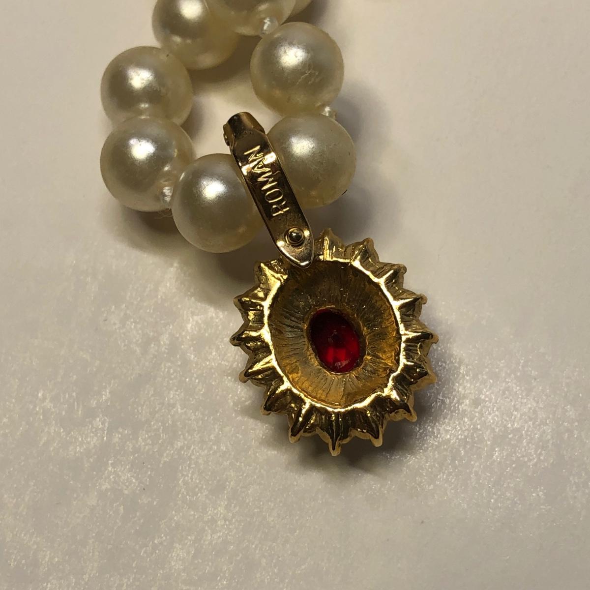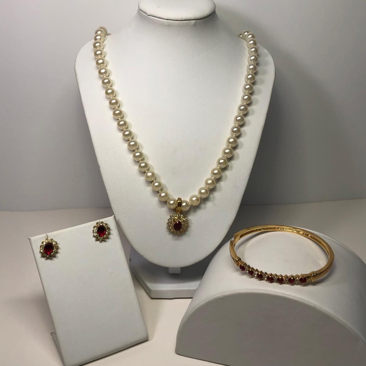 LOT 219M: Simulated Ruby Set - 18" Pearl Necklace w/Simulated Ruby Pendant, Iman Earrings & Gold Tone Bracelet