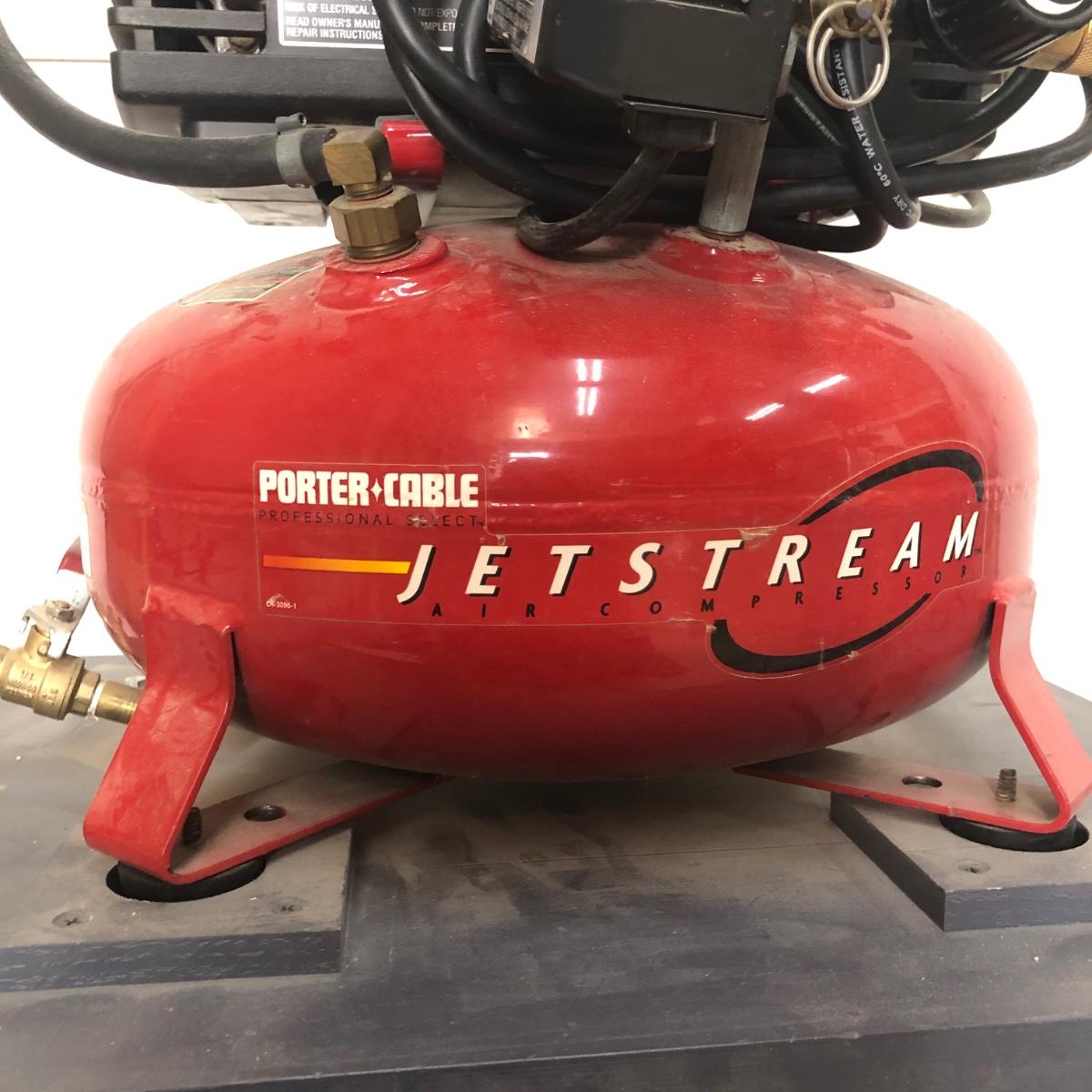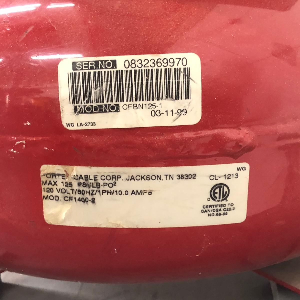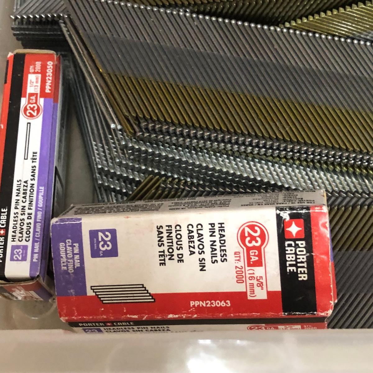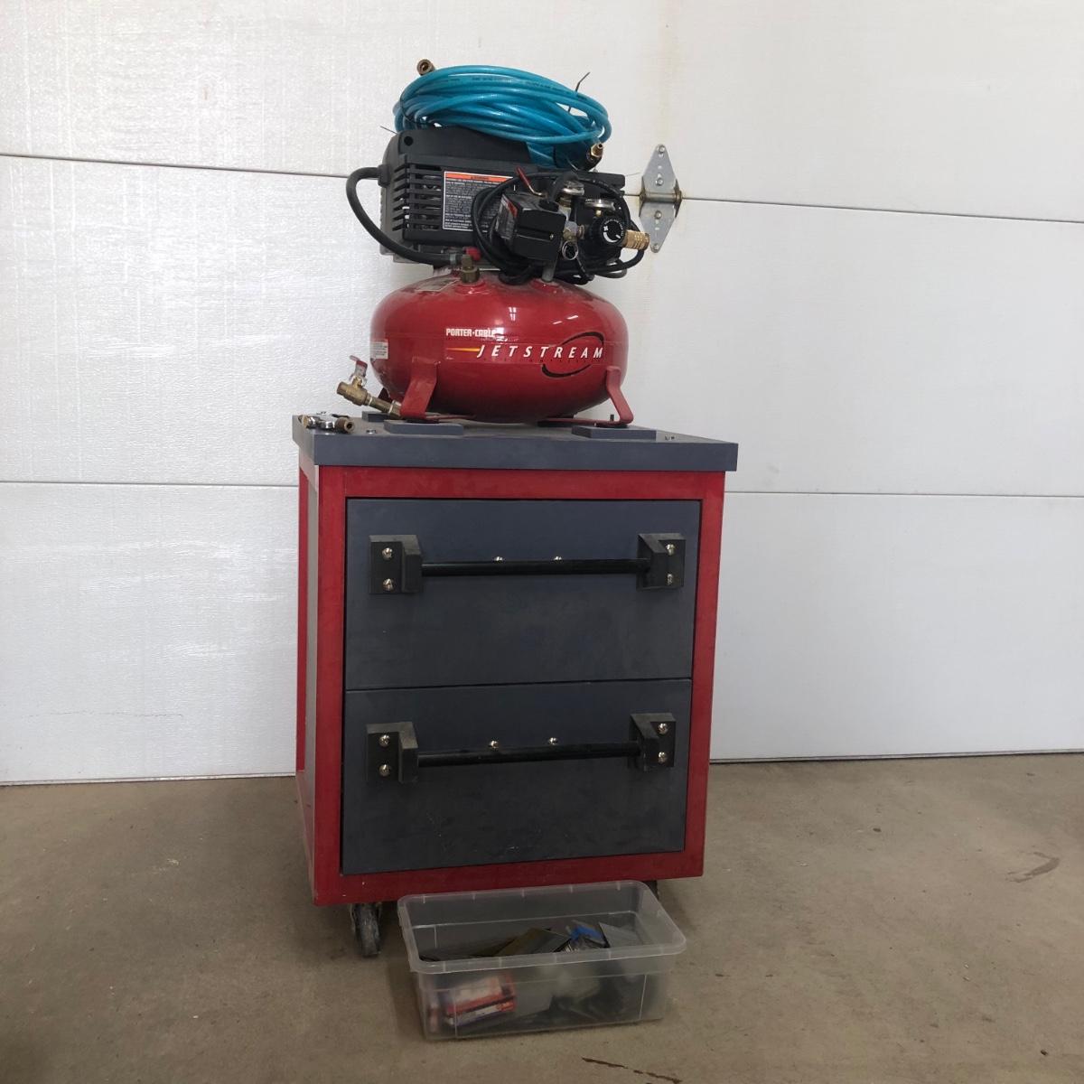 LOT 21M: Porter Cable Jetstream Air Compressor Model No CFBN125-1 Mounted to Cart, Rigid Headless Pinner R138HPA, Headless Pin Nails (15G Angle, 18G & 23G) & More