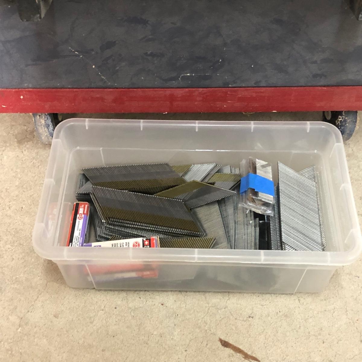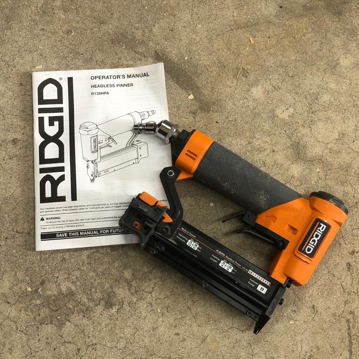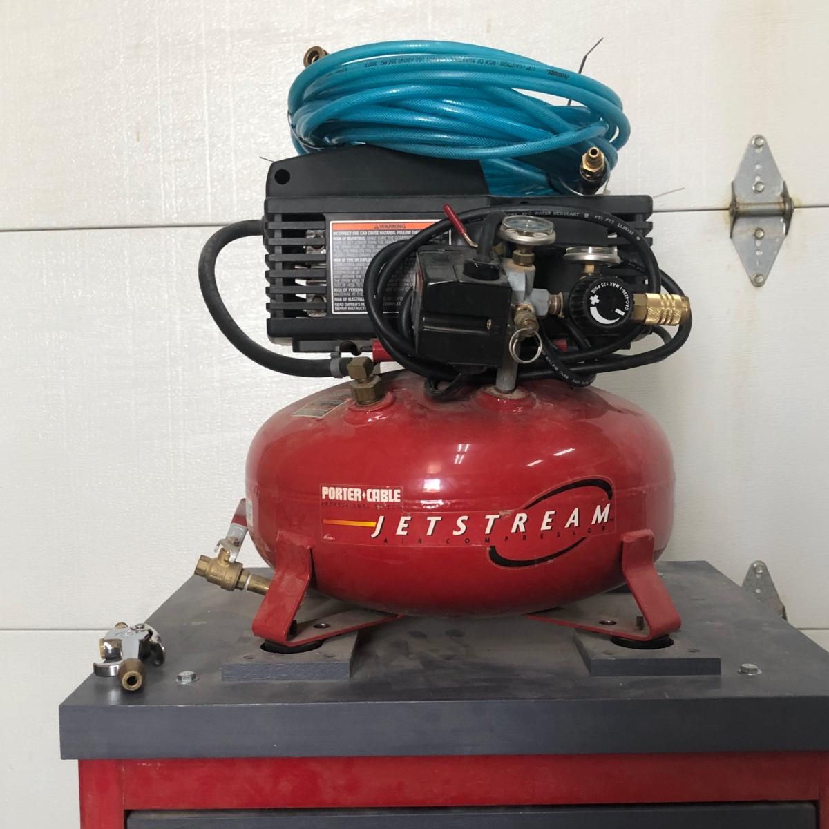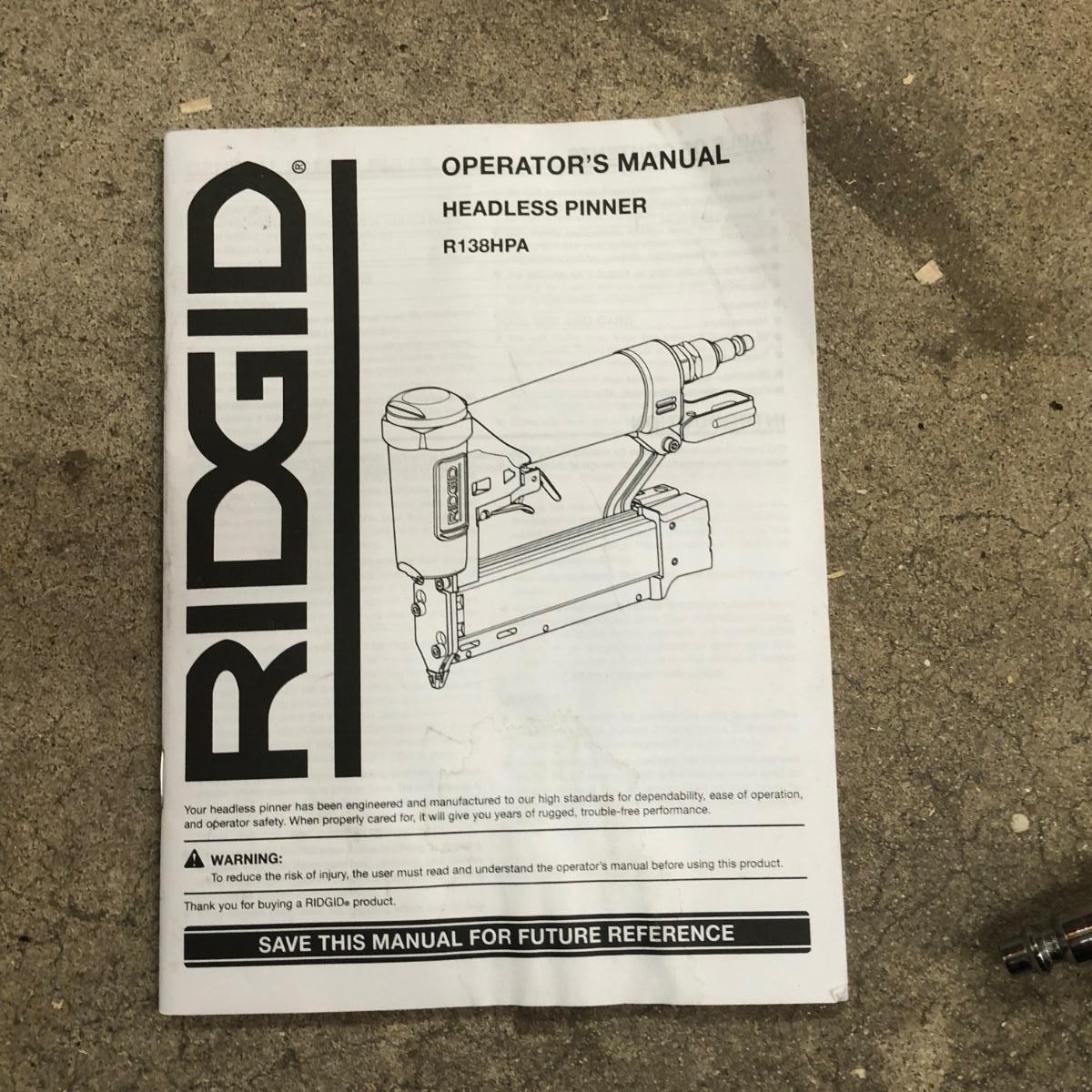 LOT 21M: Porter Cable Jetstream Air Compressor Model No CFBN125-1 Mounted to Cart, Rigid Headless Pinner R138HPA, Headless Pin Nails (15G Angle, 18G & 23G) & More