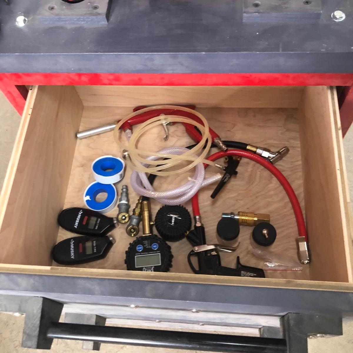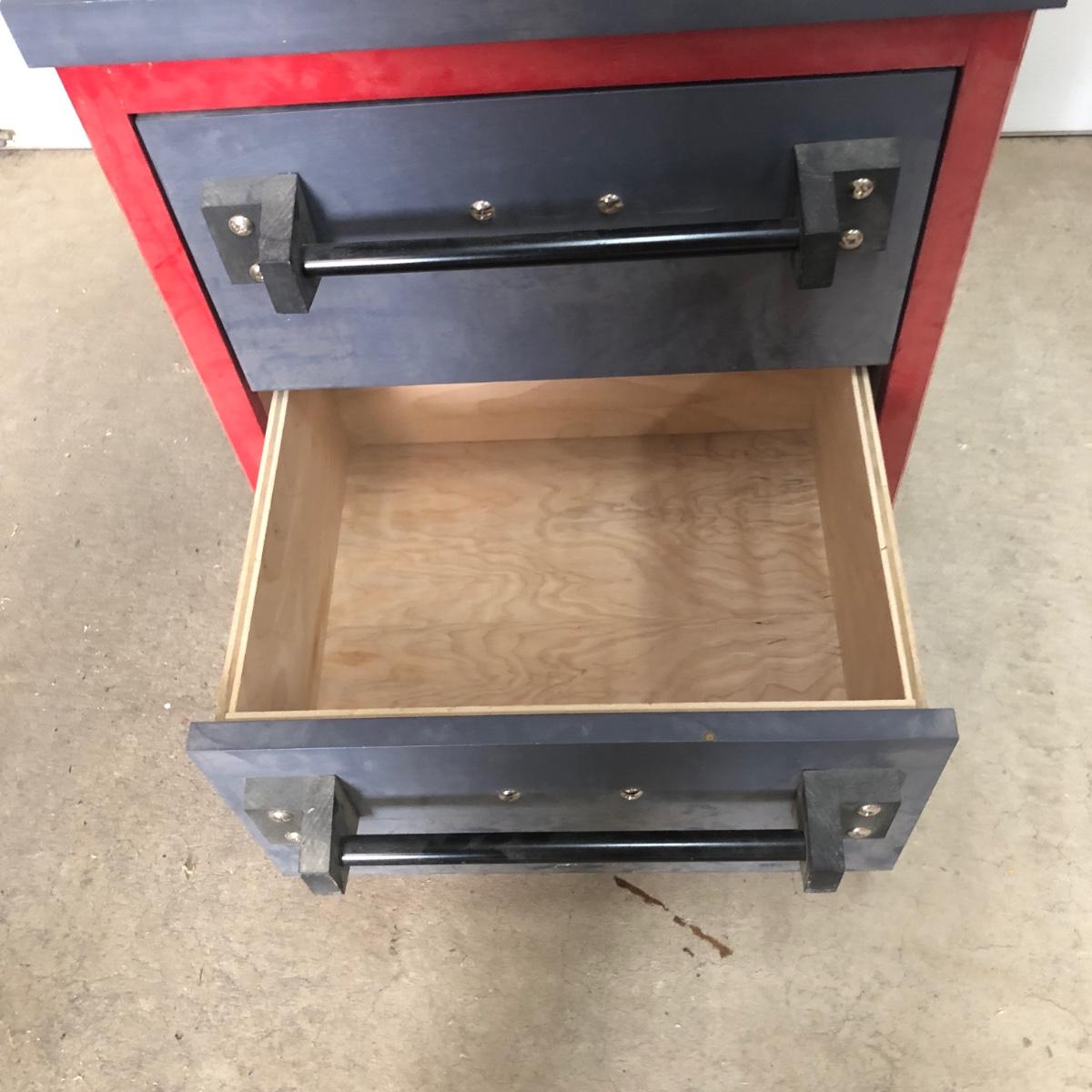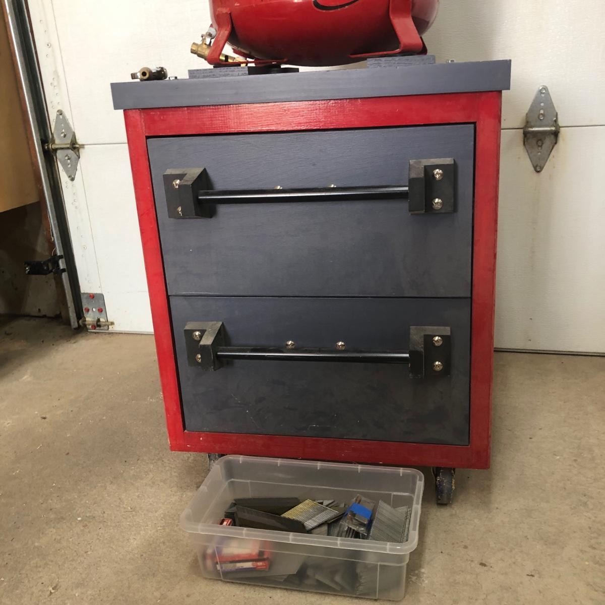 Measures 21 x 17.5 x 43 inches and is on wheels.