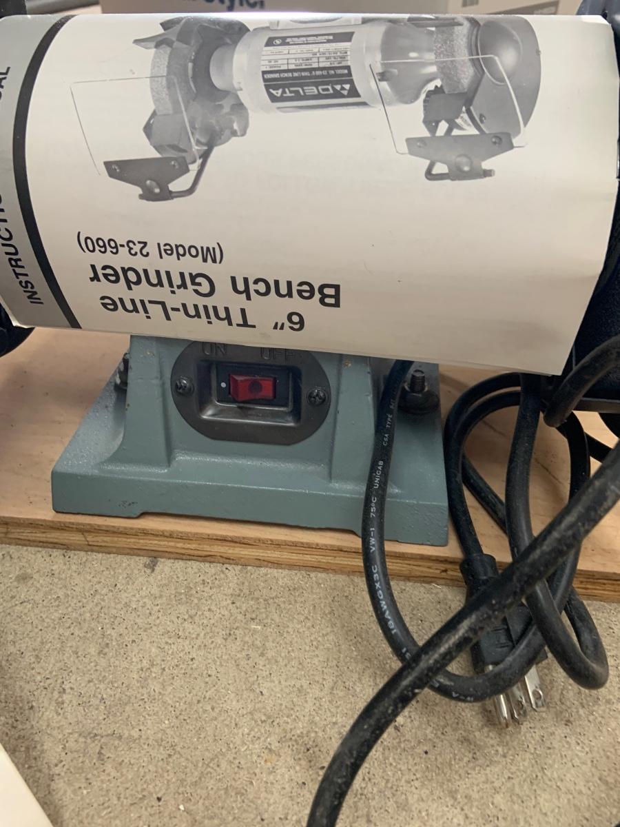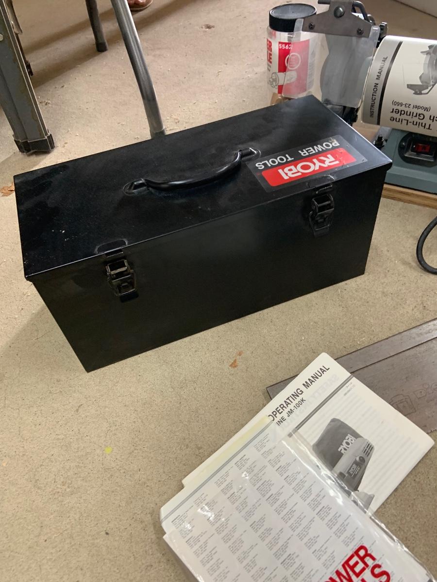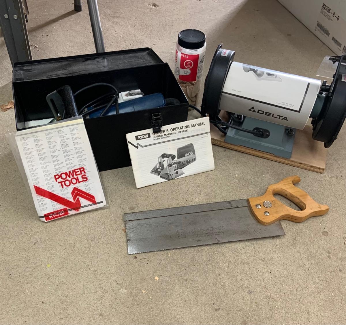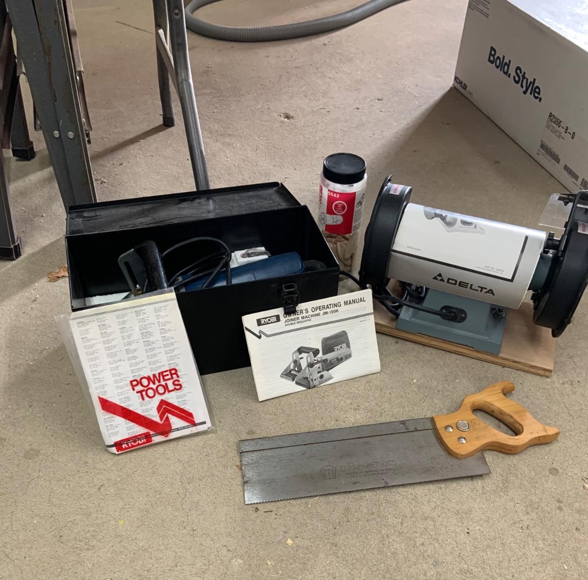 LOT:37G: Delta Bench Grinder, Ryobi Joiner Machine, Power Tool Box and More