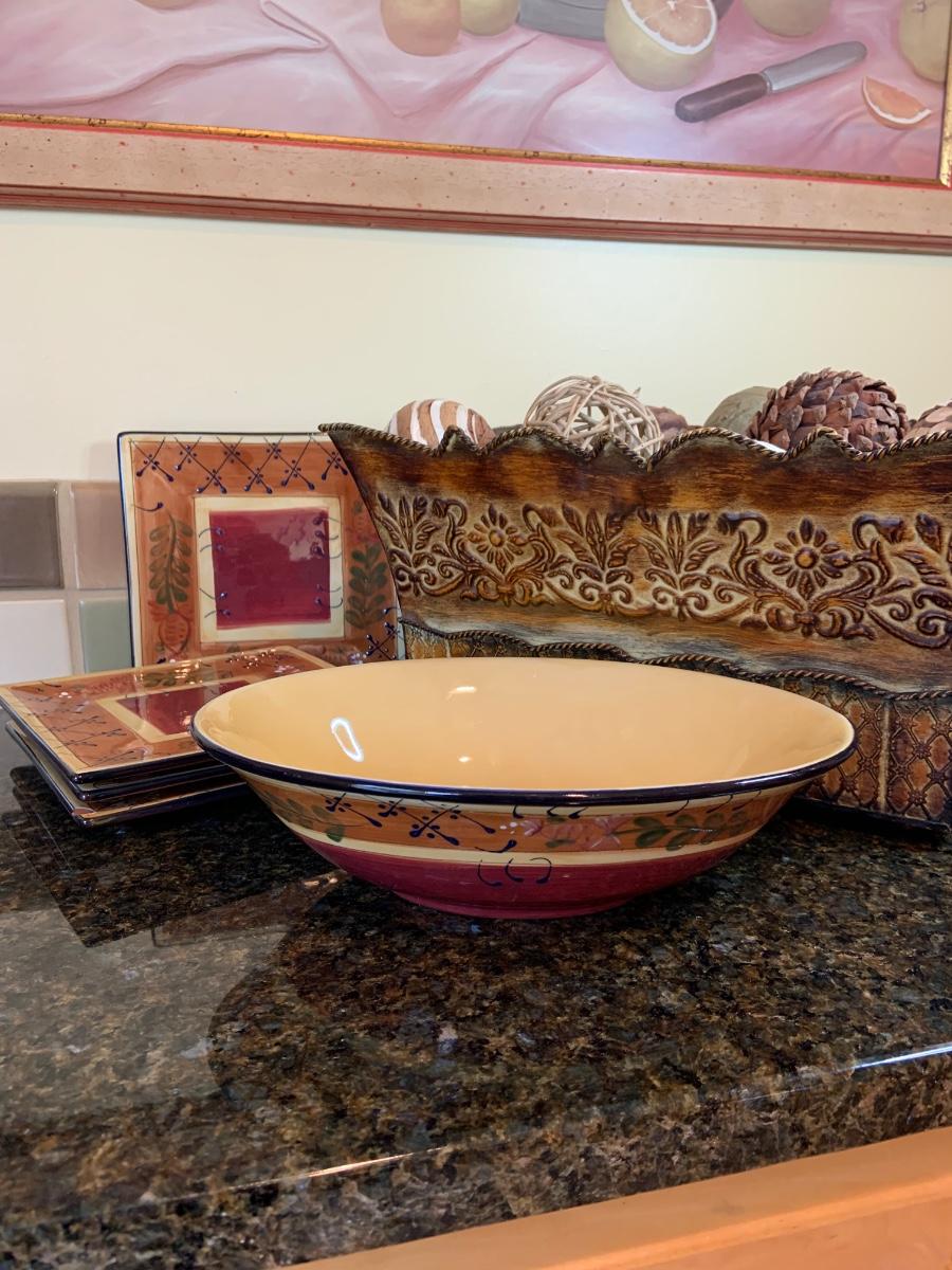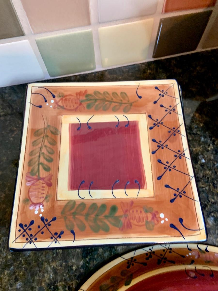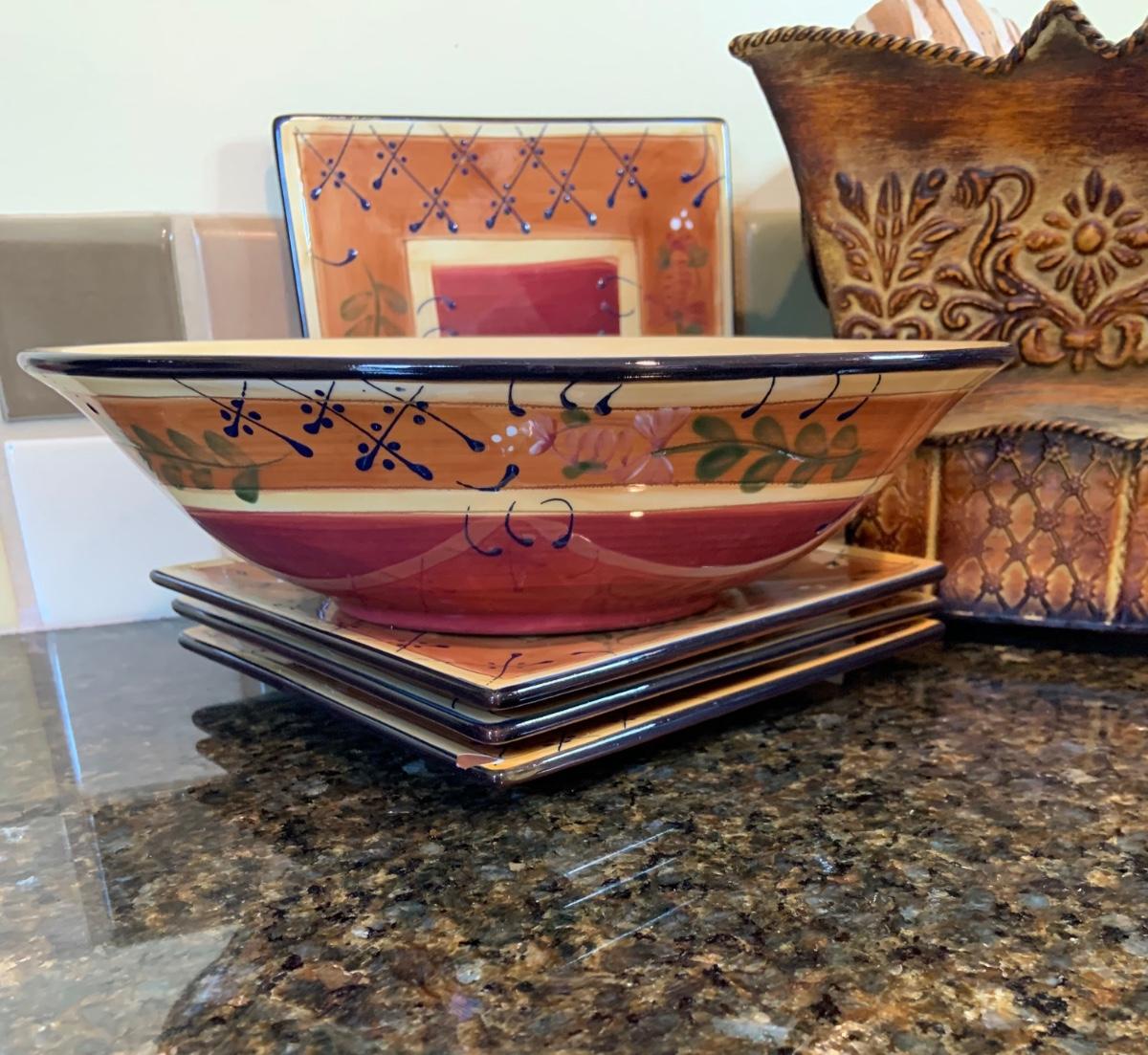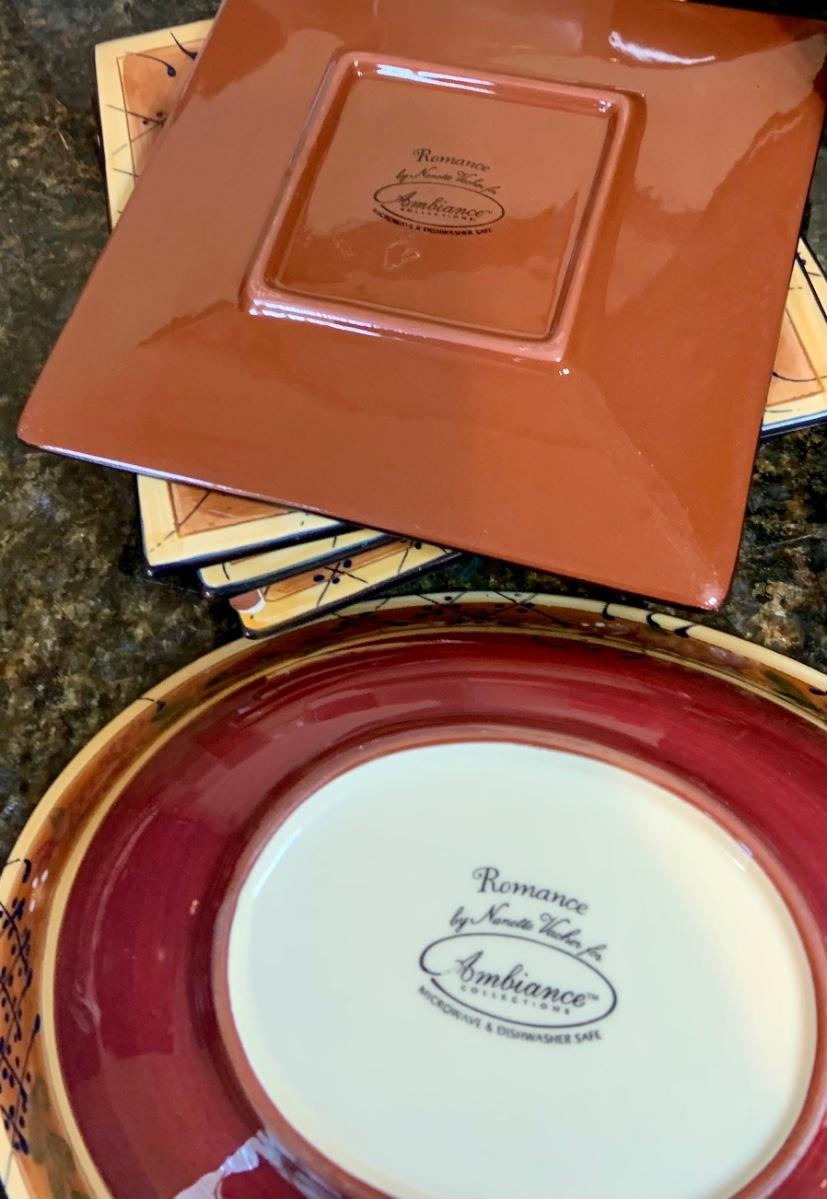 LOT 52: Ambiance Romance by Nanette Vancher Square Plates and Bowl and Large Decorative Metal Container