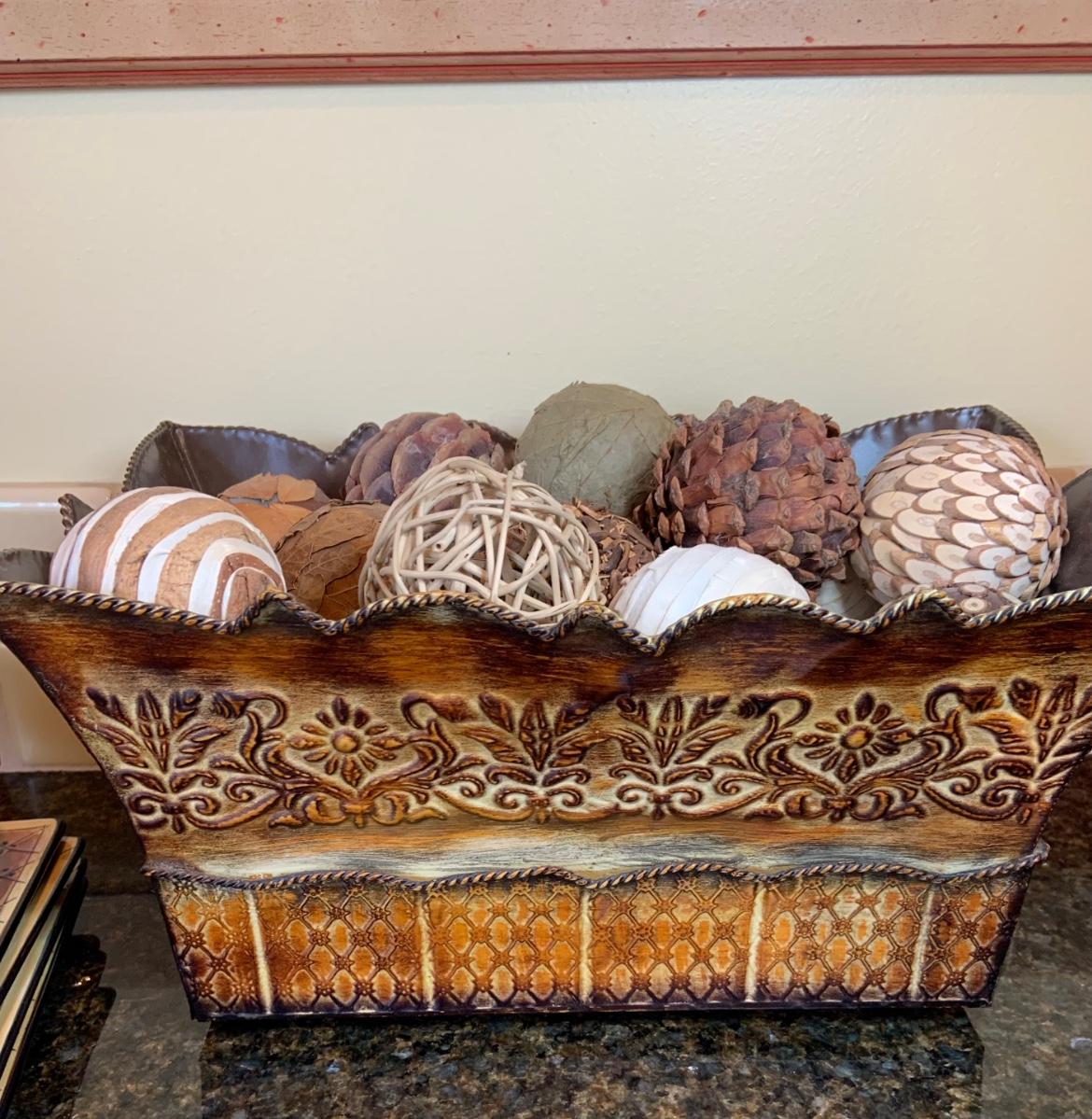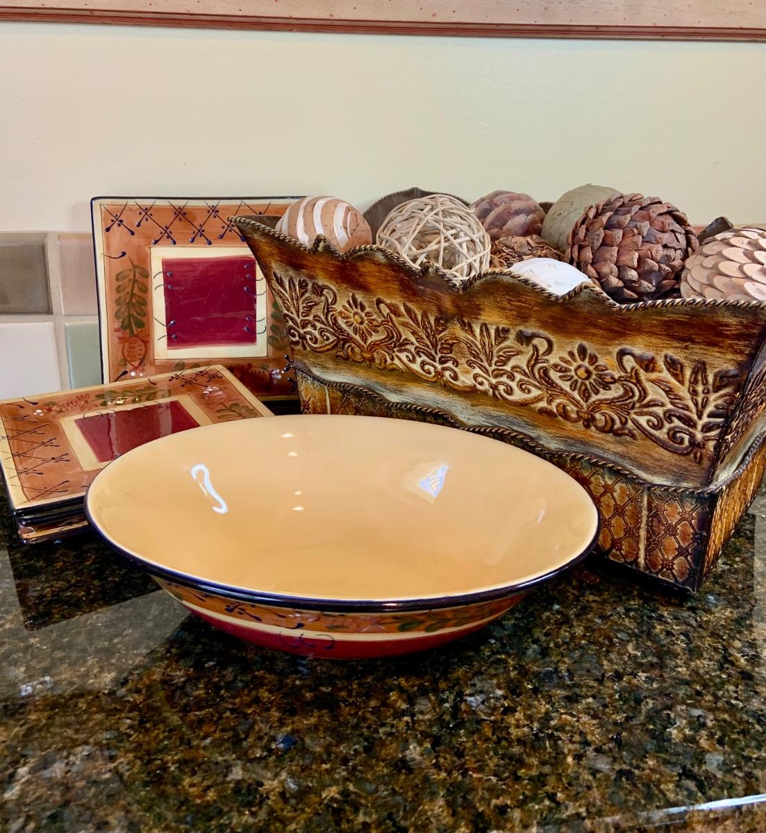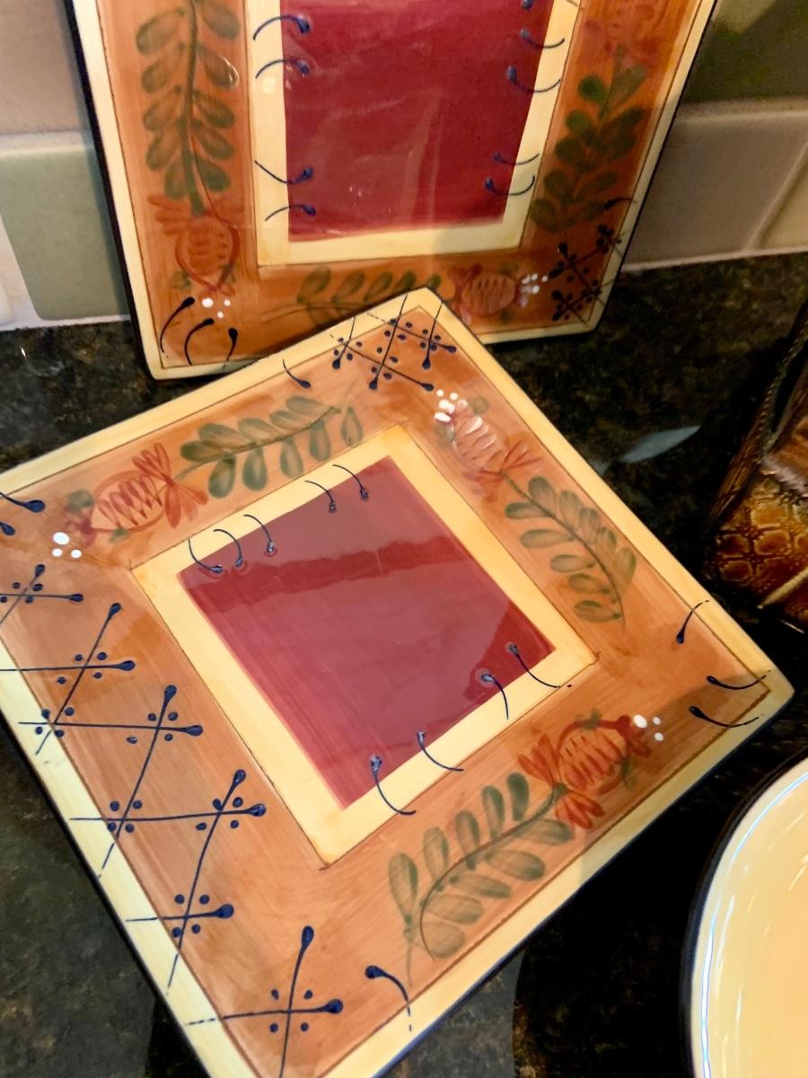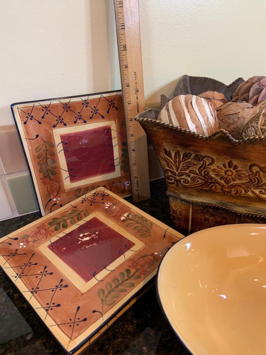 LOT 52: Ambiance Romance by Nanette Vancher Square Plates and Bowl and Large Decorative Metal Container