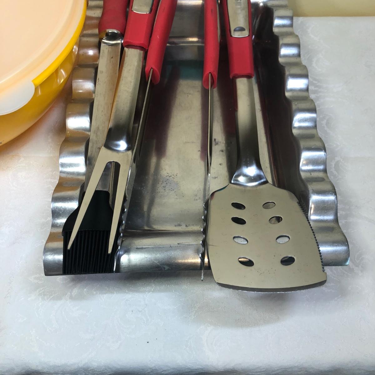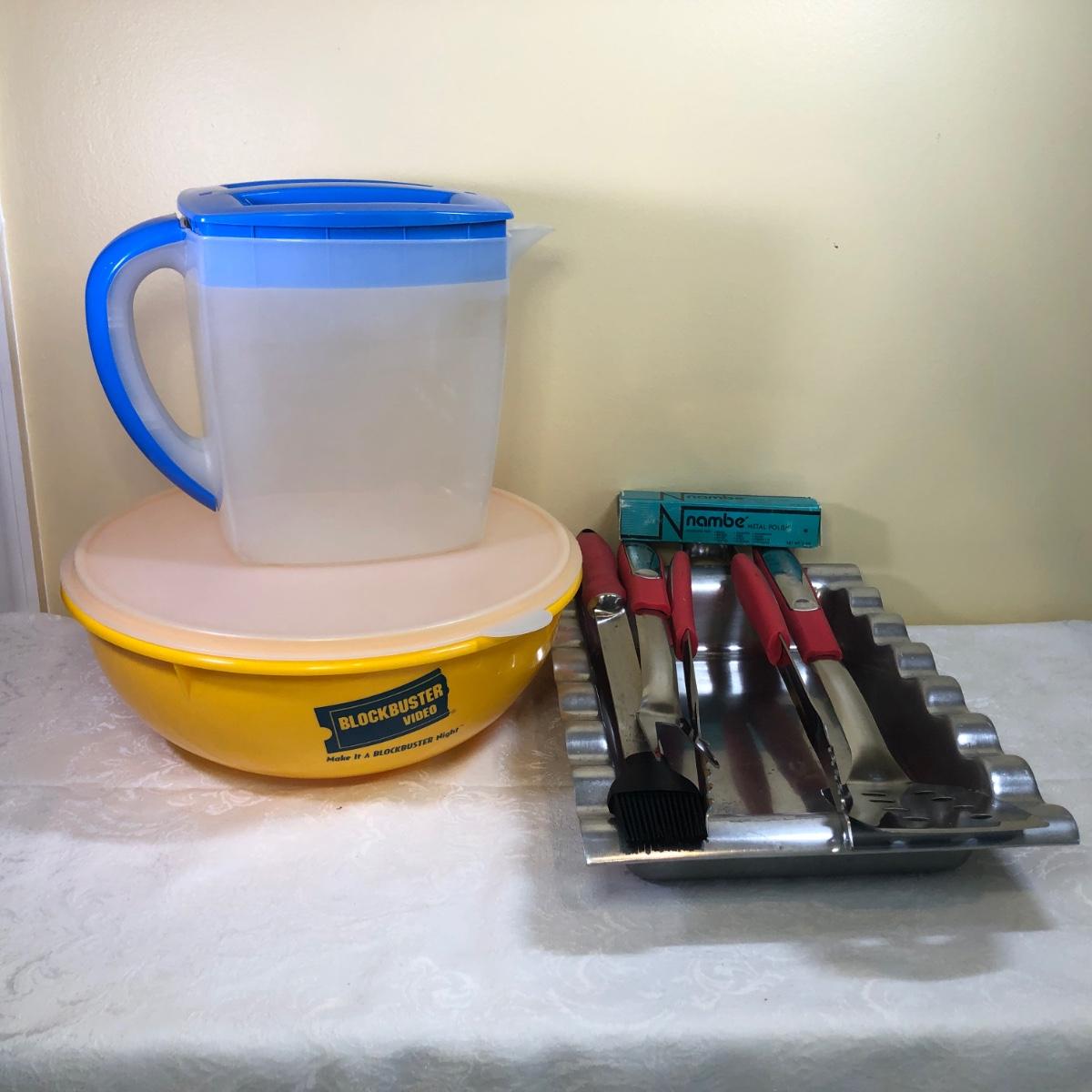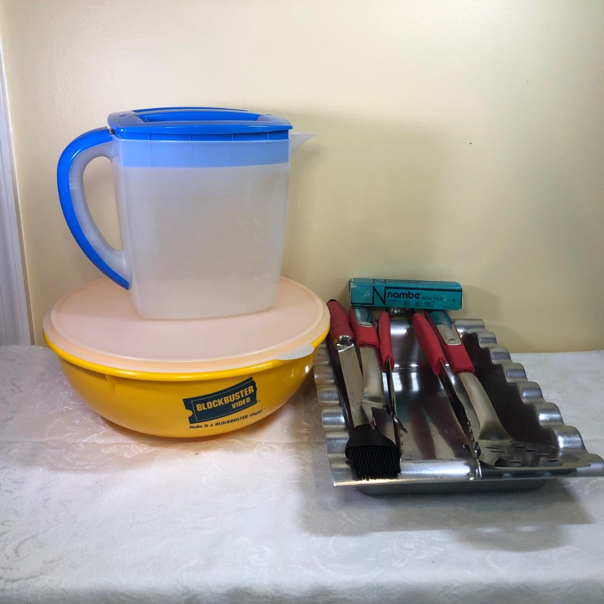 LOT 57M: Blockbuster Tupperware Popcorn Bucket, Grill Tools & Pitcher
