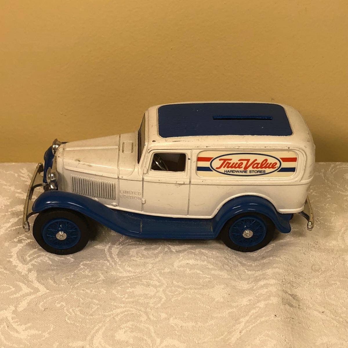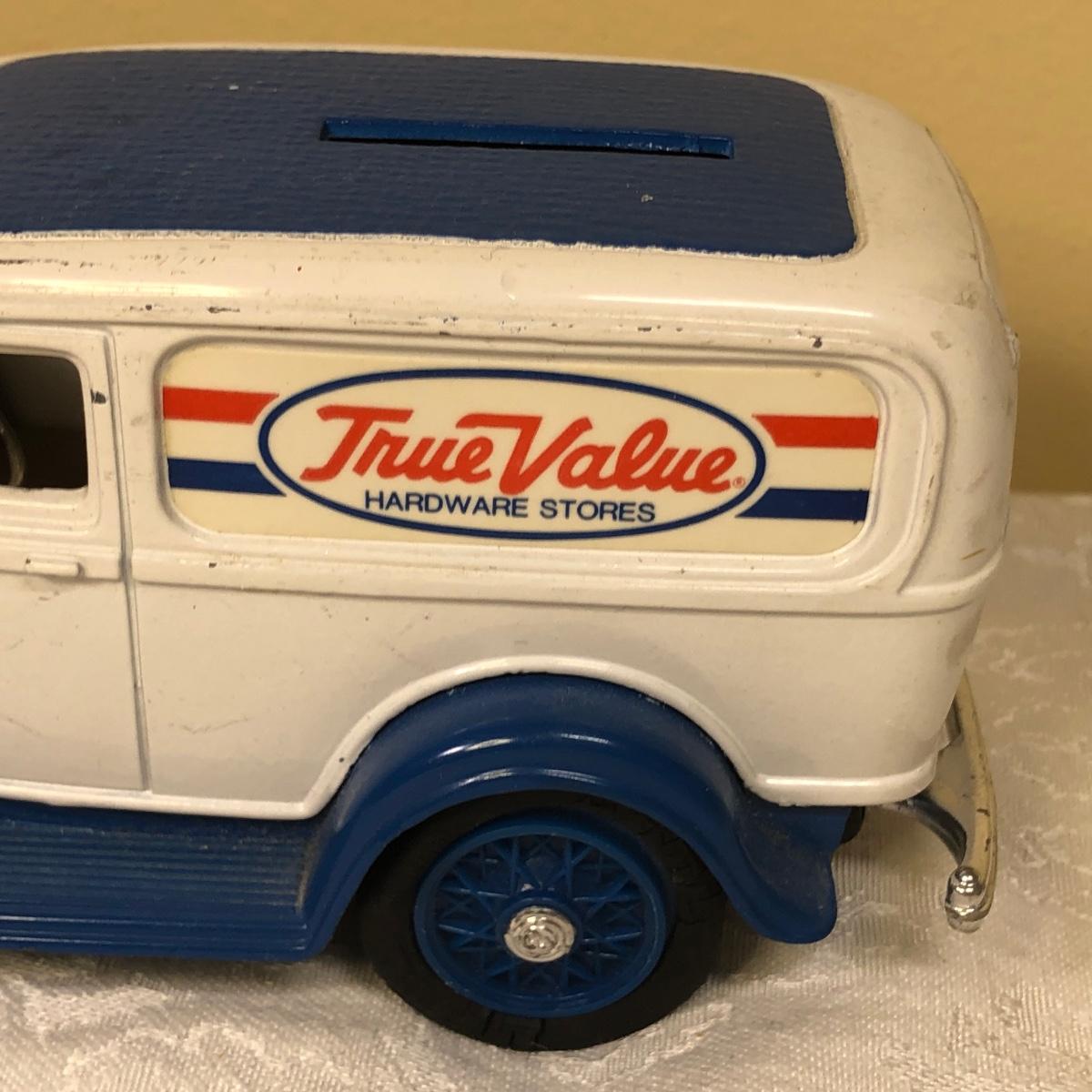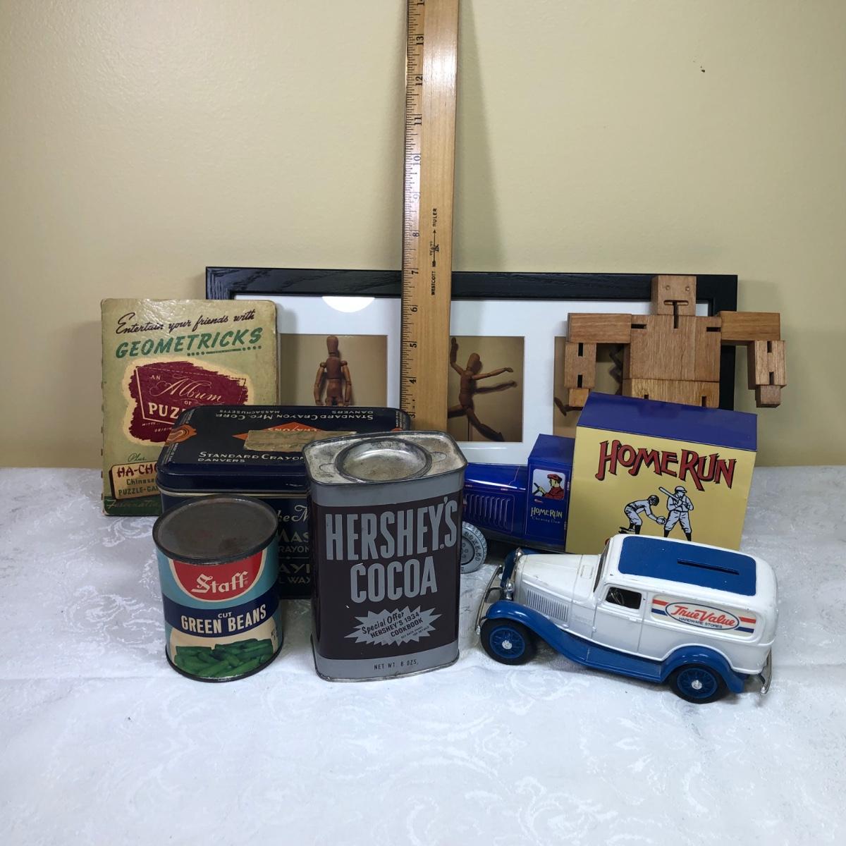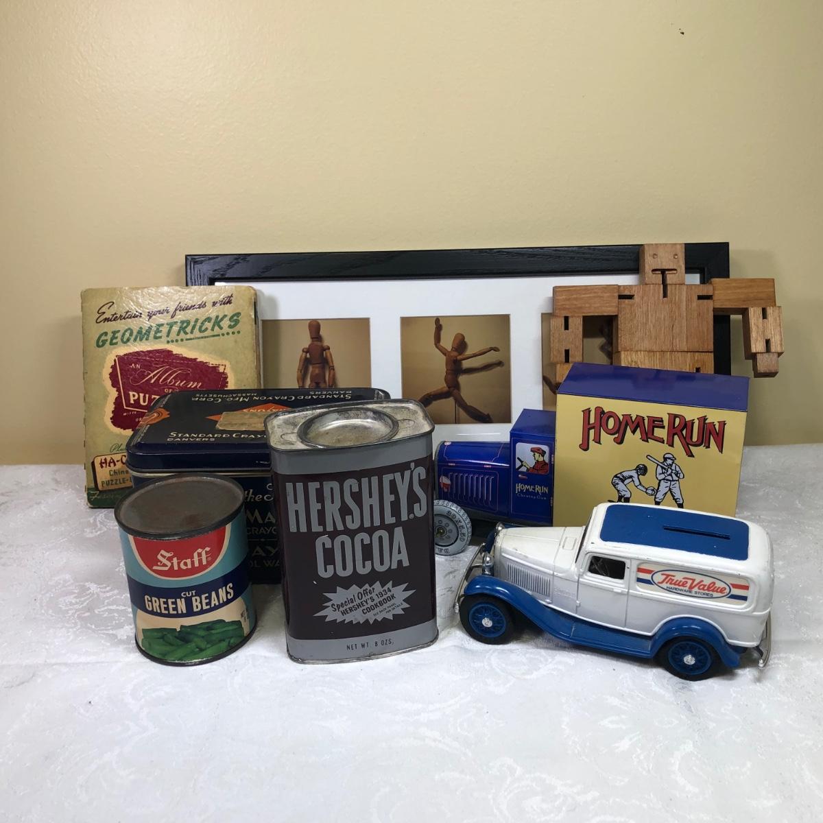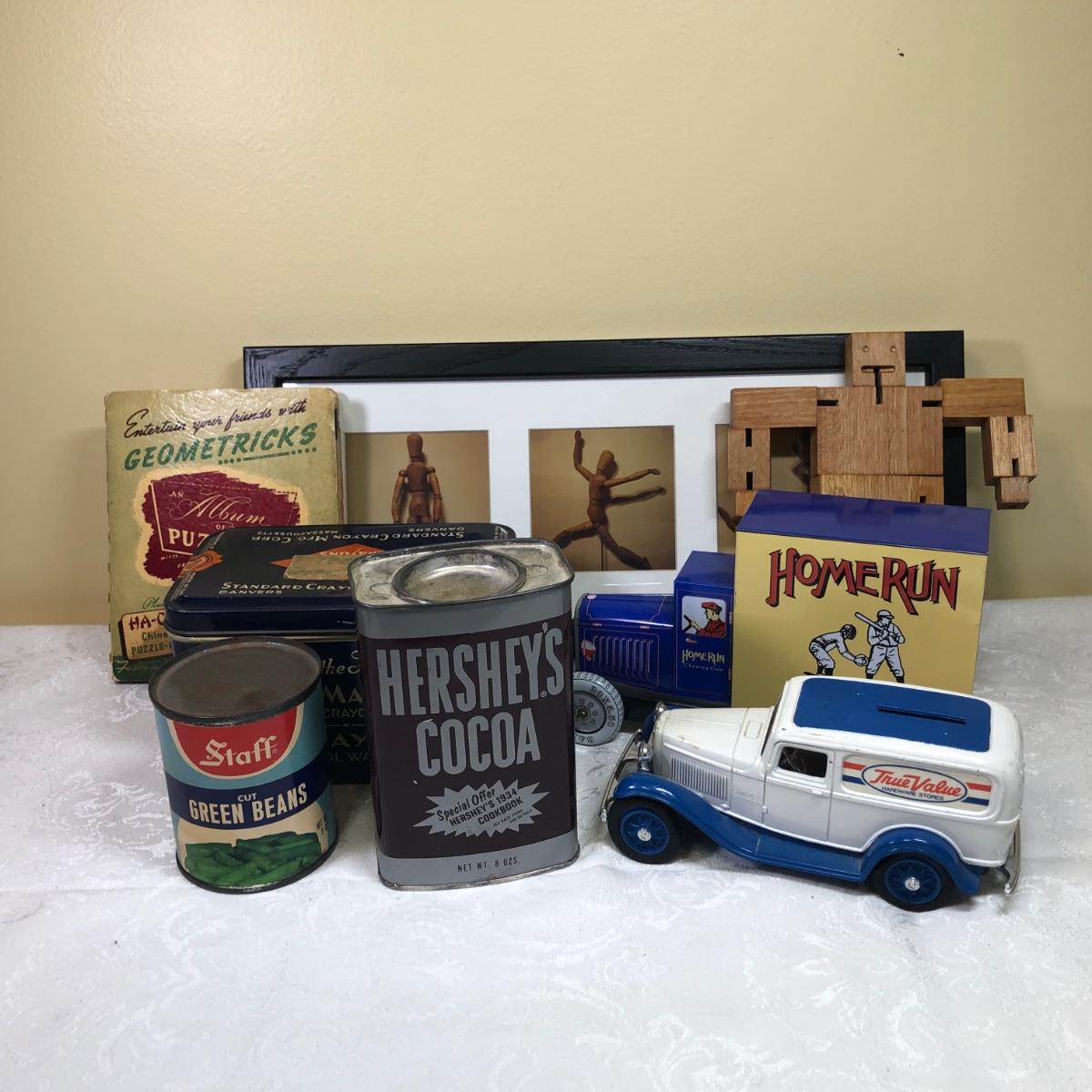 LOT 63M: Ertl True Value Hardware Store Truck Bank, Vintage Tins & Geometricks Book, Framed Triptych Photo & More