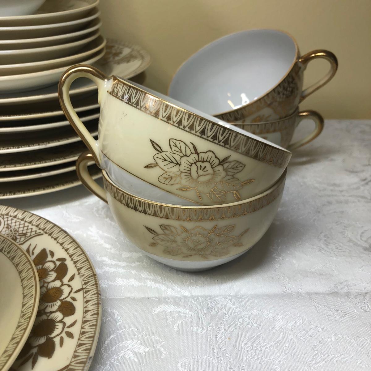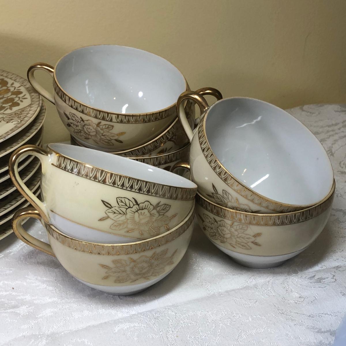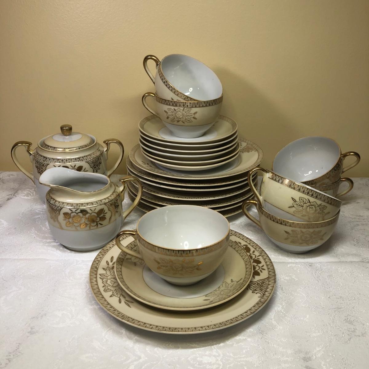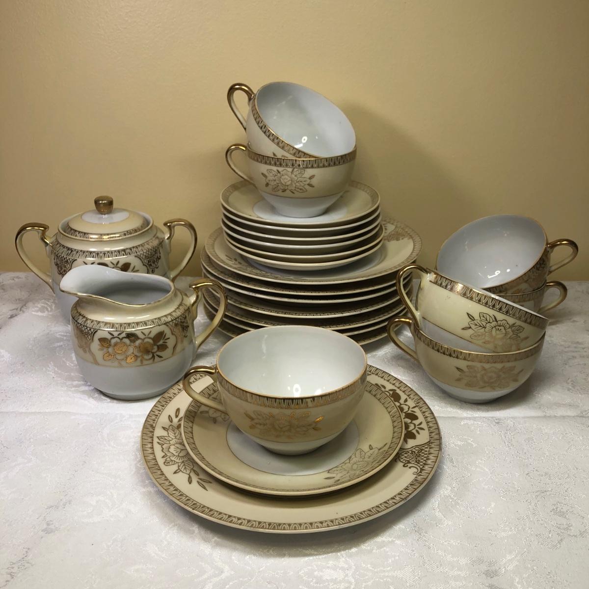 Made in Japan. Set includes 7 tea cups, 7 saucers, 8 medium plates, a sugar bowl & creamer.