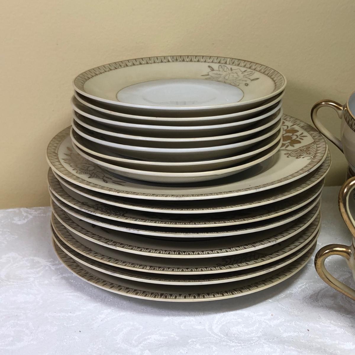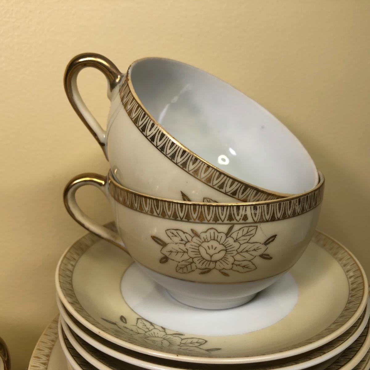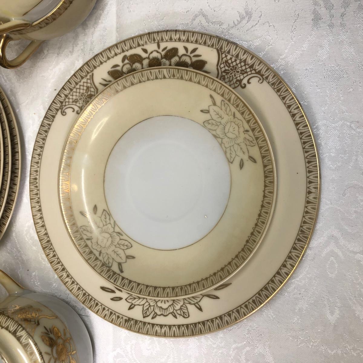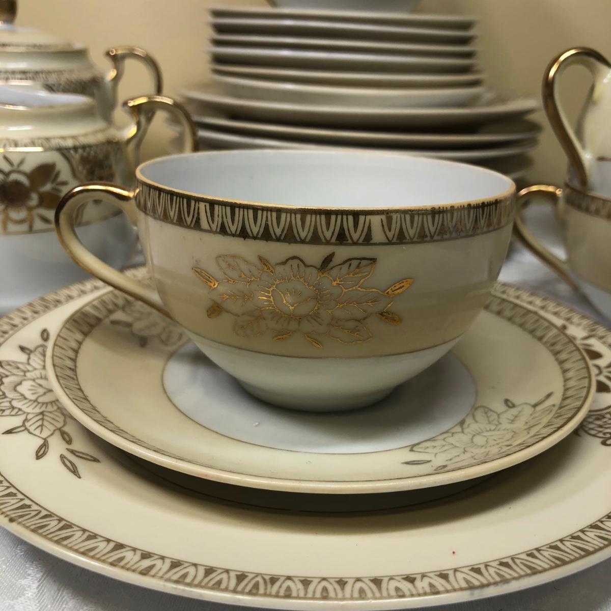 Made in Japan. Set includes 7 tea cups, 7 saucers, 8 medium plates, a sugar bowl & creamer.
