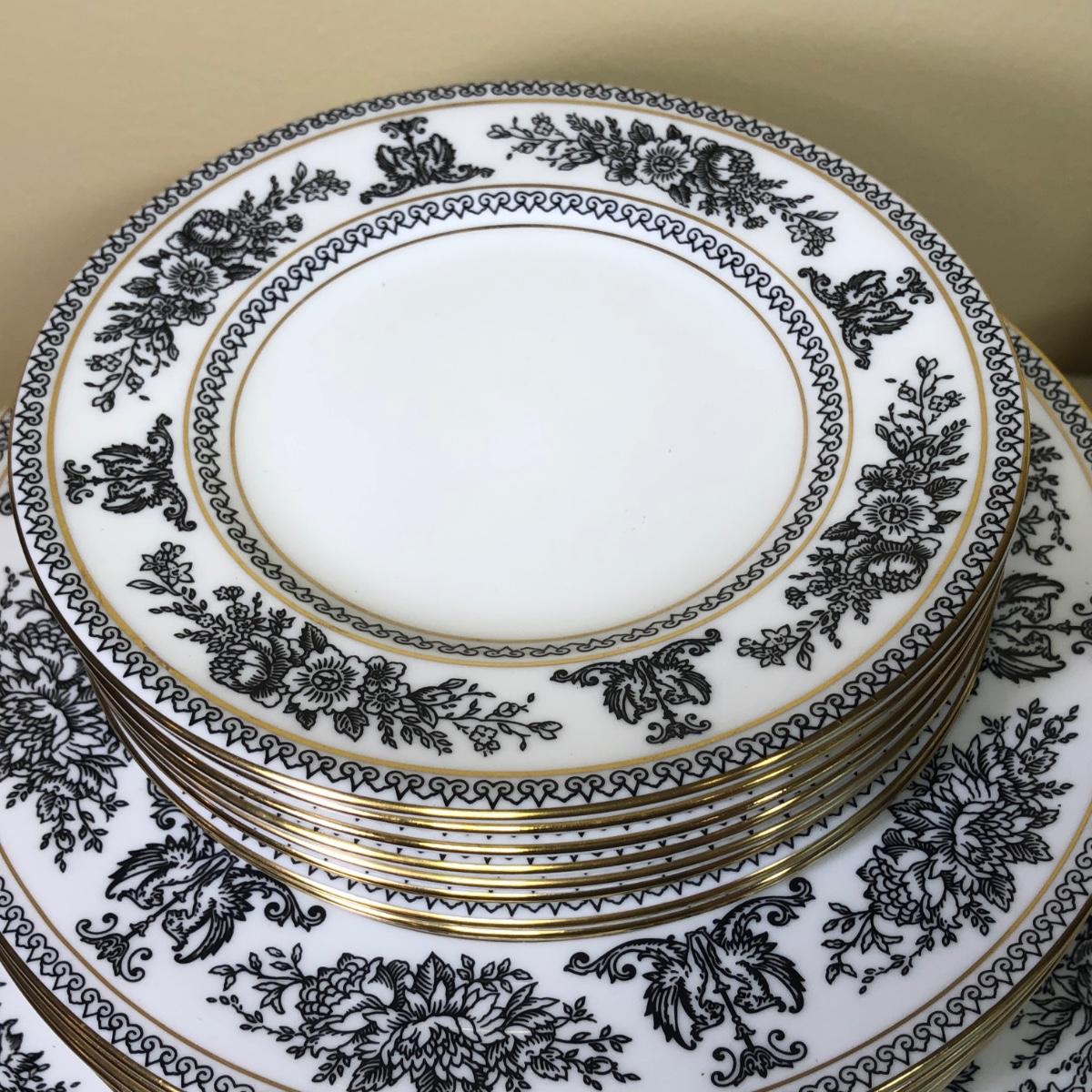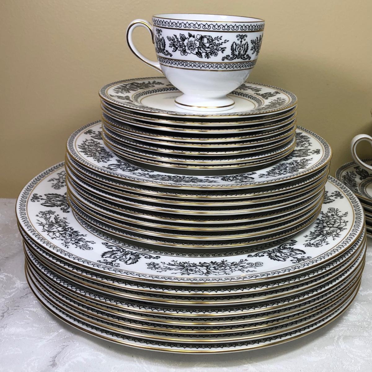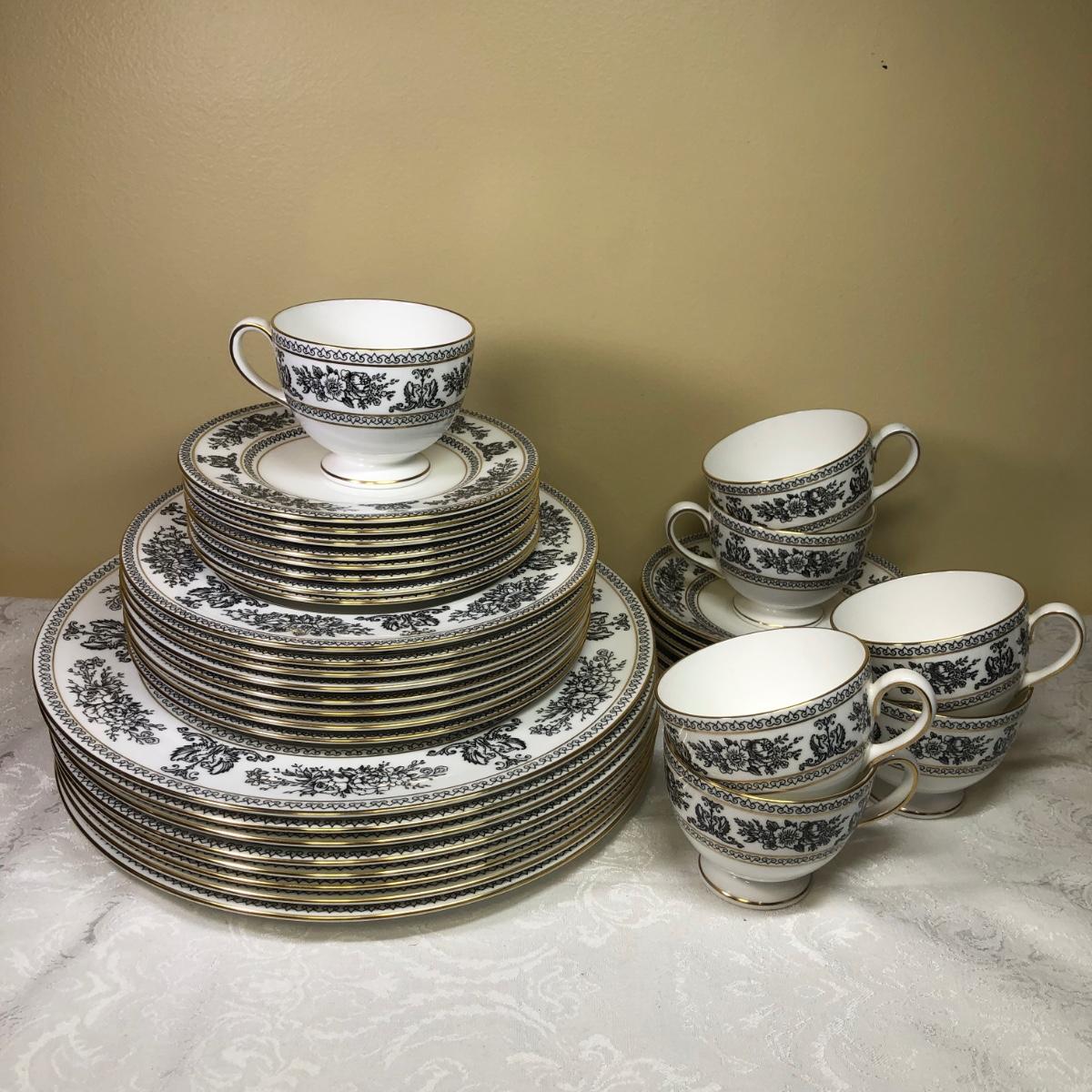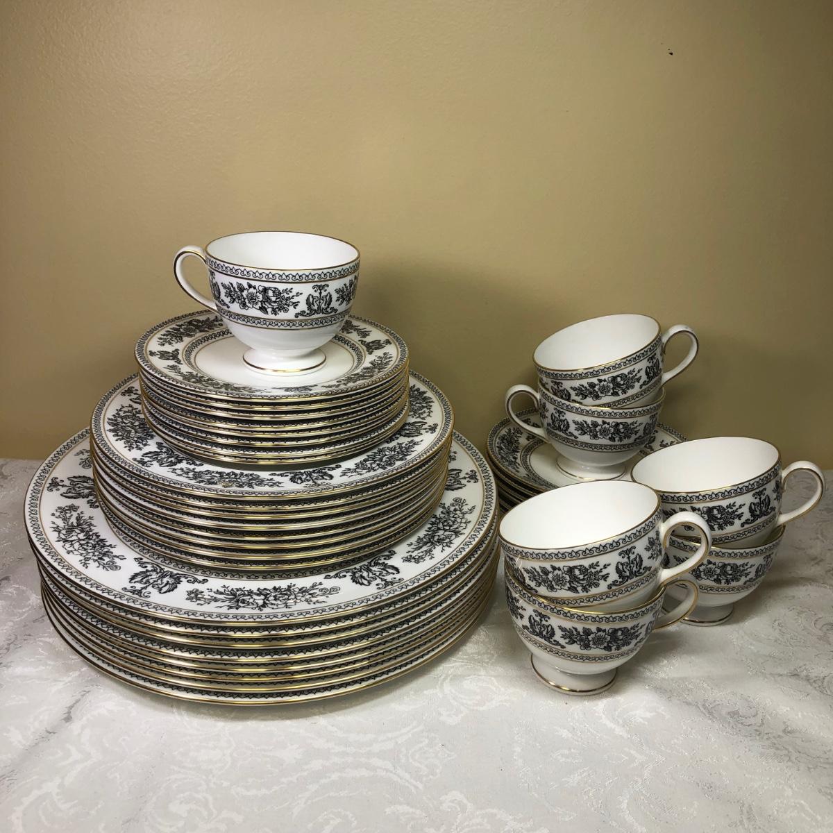 Made in England. Set includes 8 dinner plates, 8 medium plates, 8 dessert plates, 6 saucers and 7 tea cups.