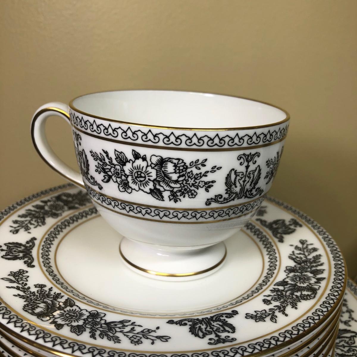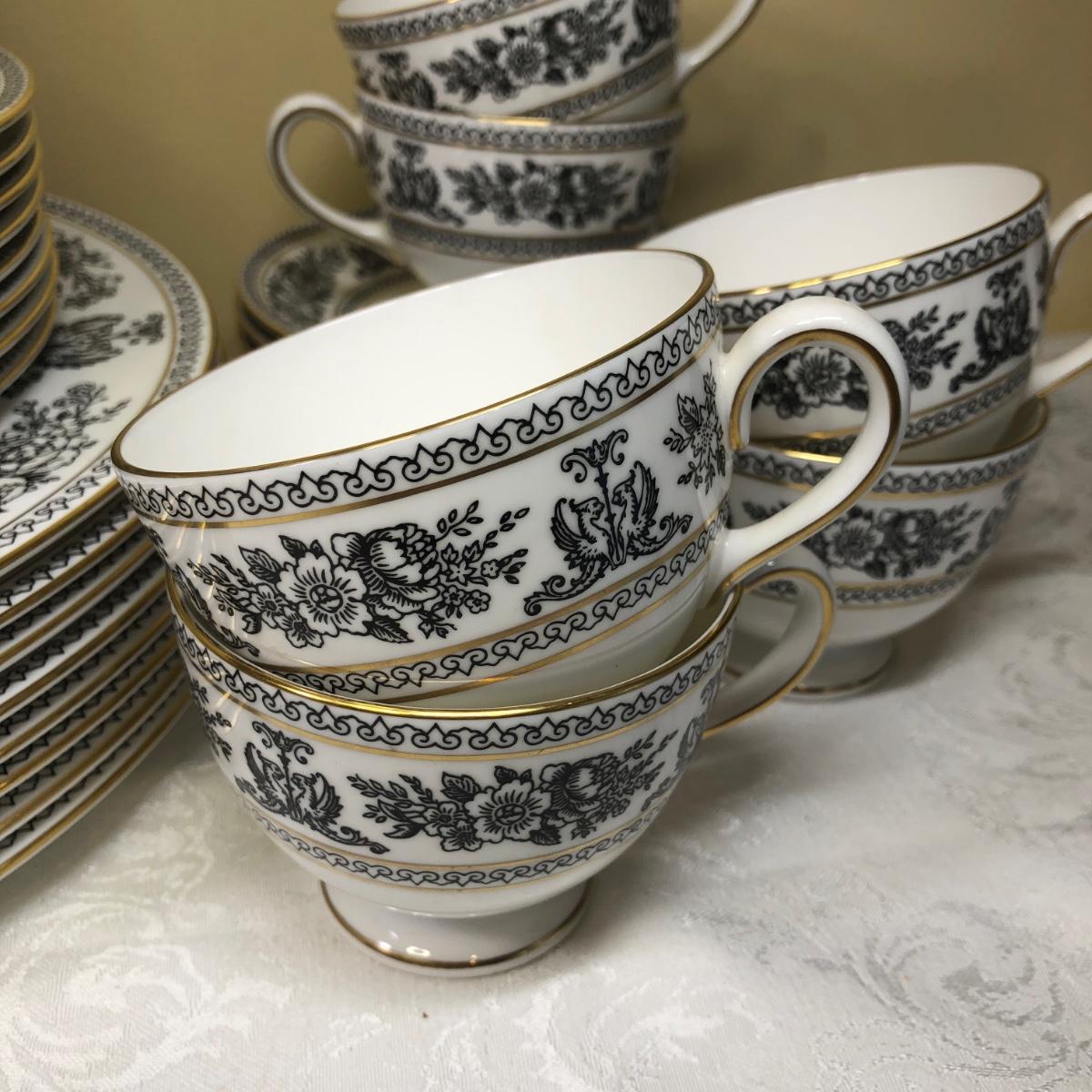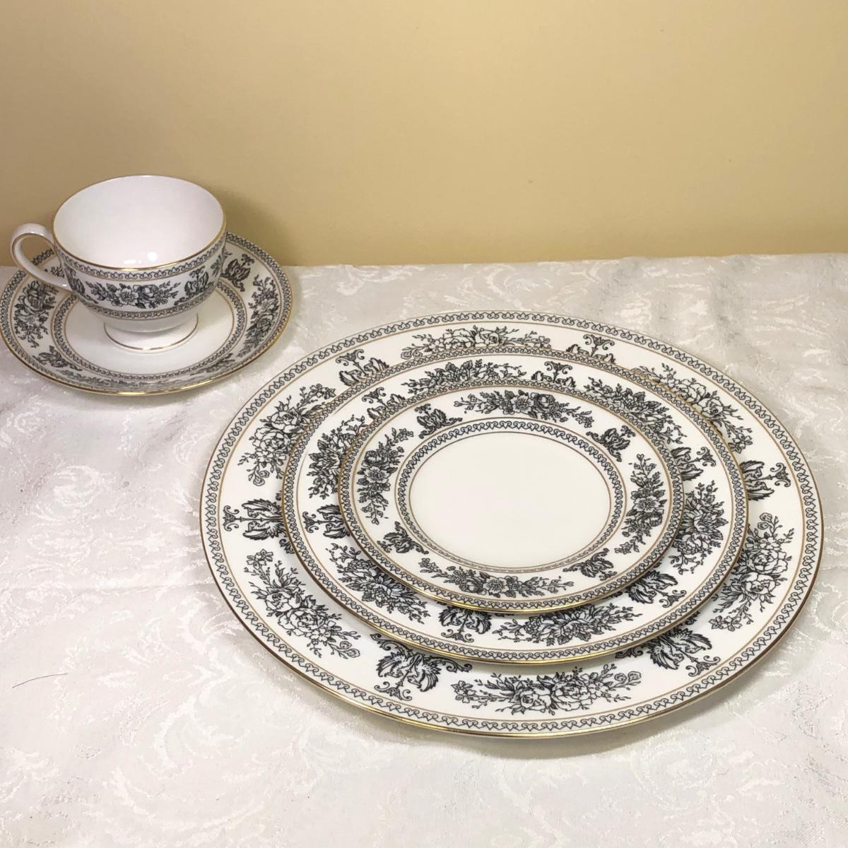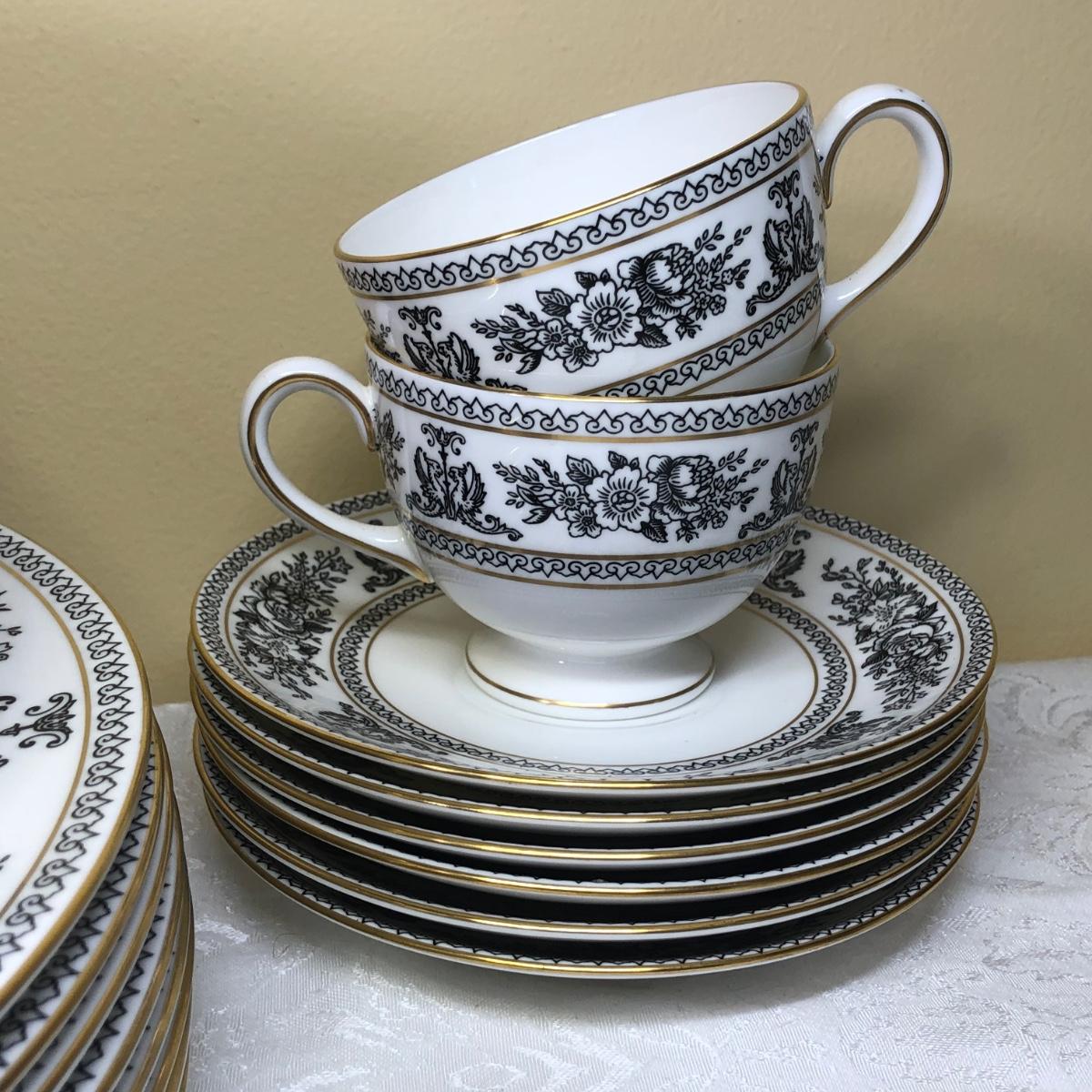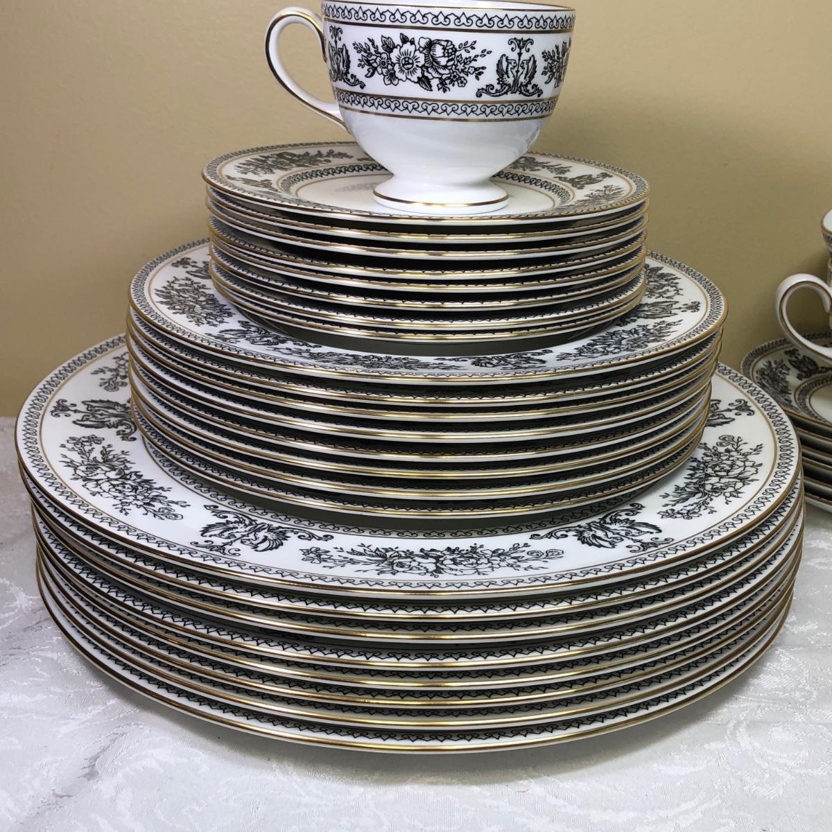 Made in England. Set includes 8 dinner plates, 8 medium plates, 8 dessert plates, 6 saucers and 7 tea cups.