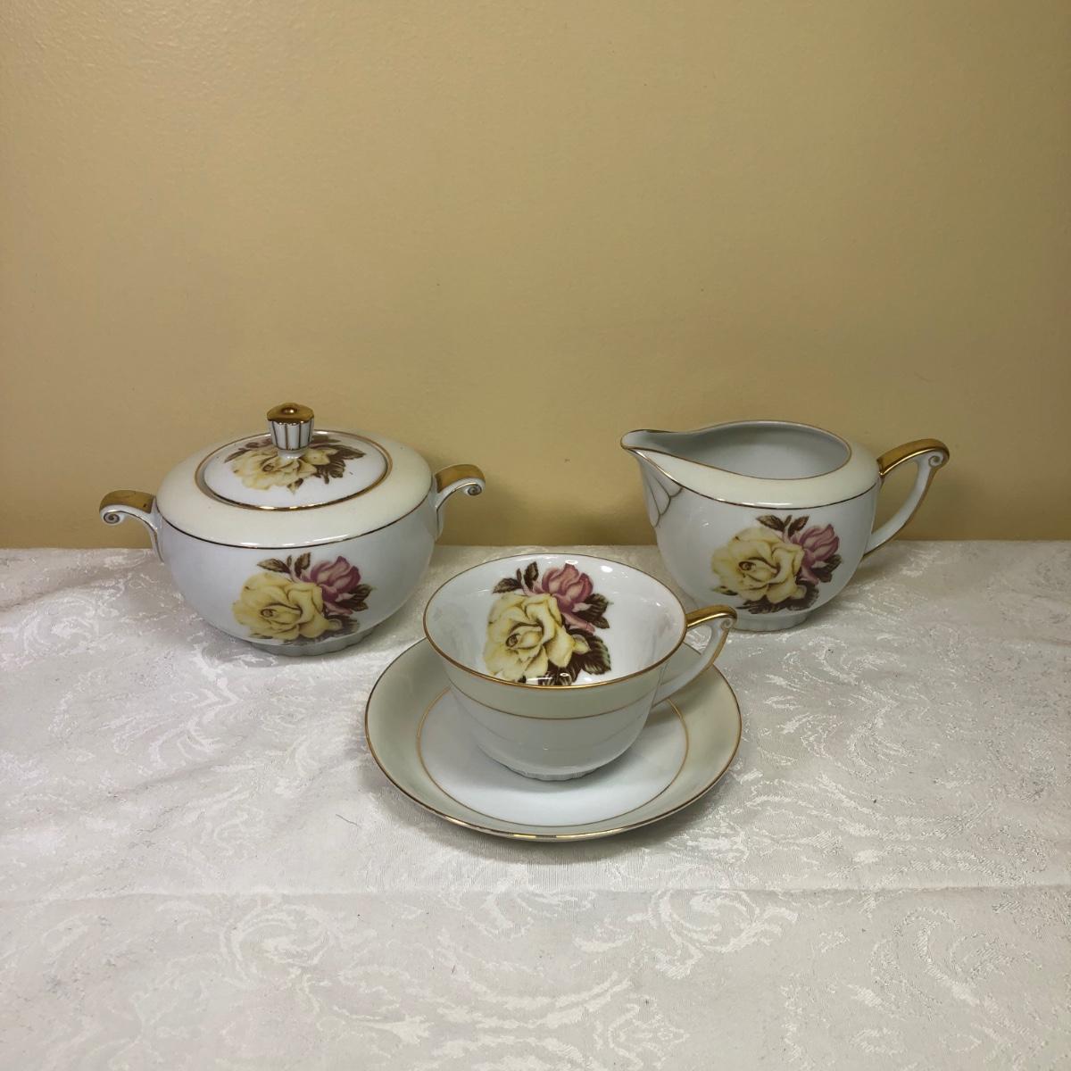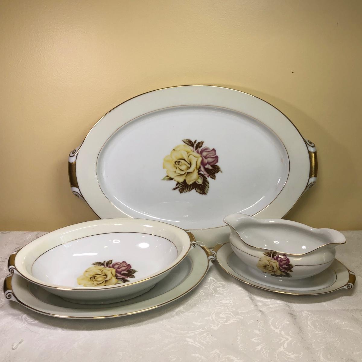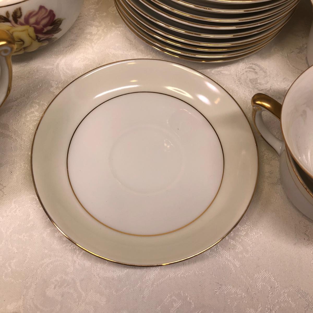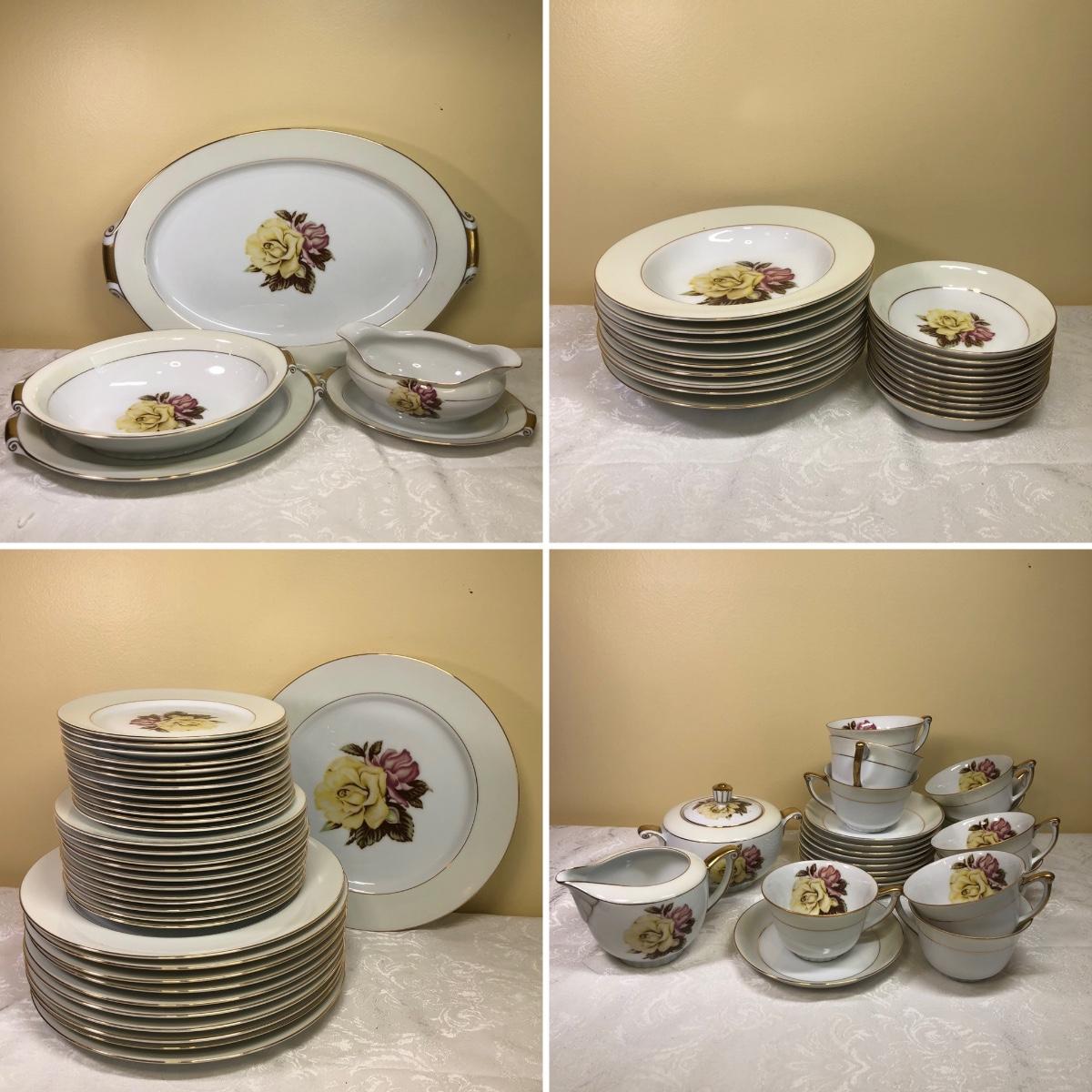 Made in Japan. Set includes serving dishes, 9 bowls, 10 small bowls, 11 dinner plates, 11 medium plates, 11 dessert plates, 10 saucers, 10 tea cups, a sugar bowl & creamer.