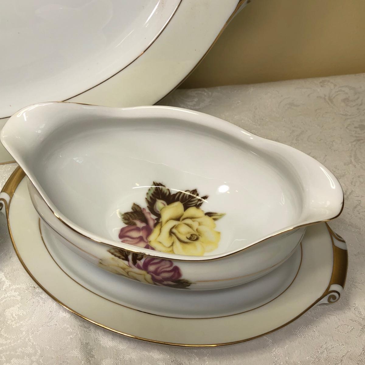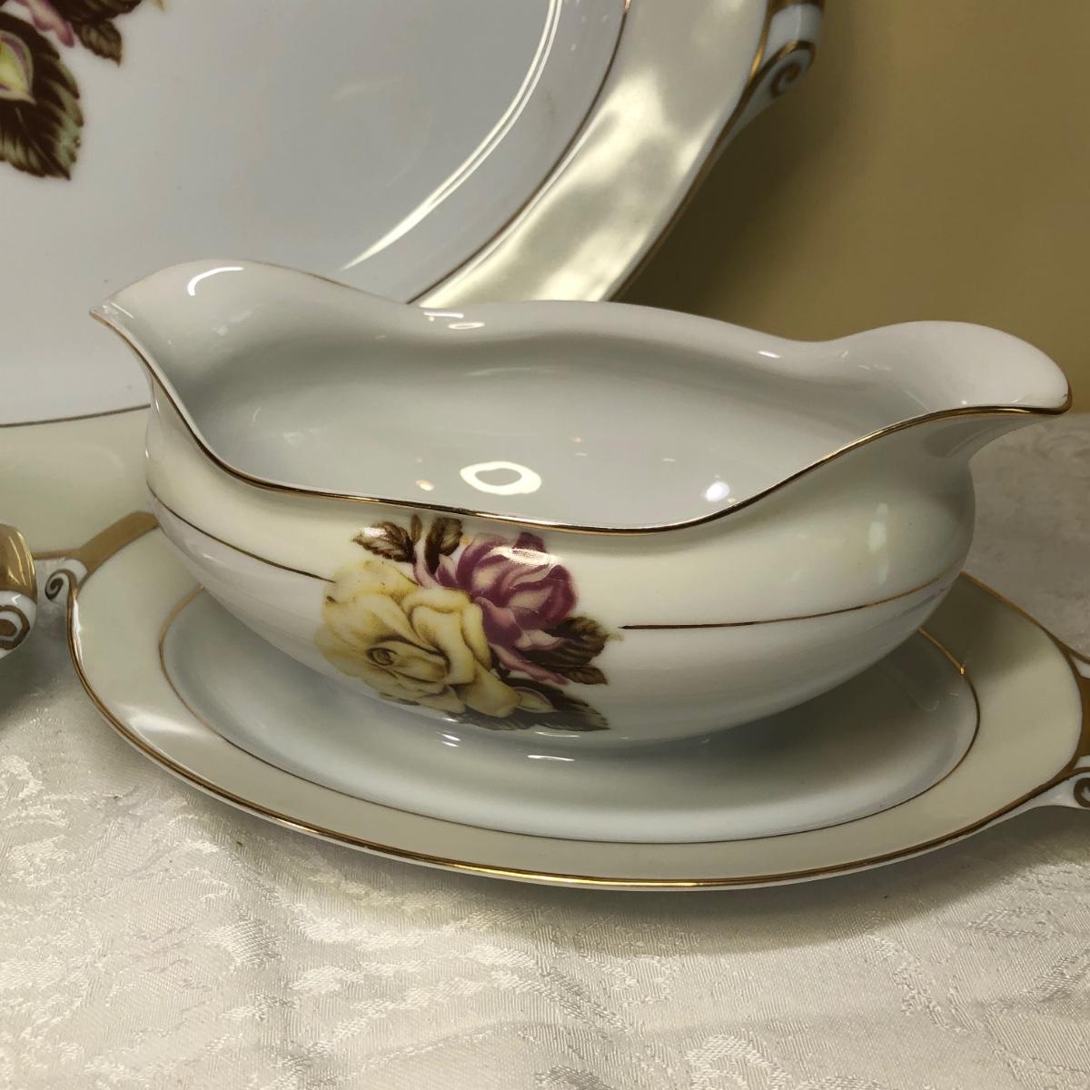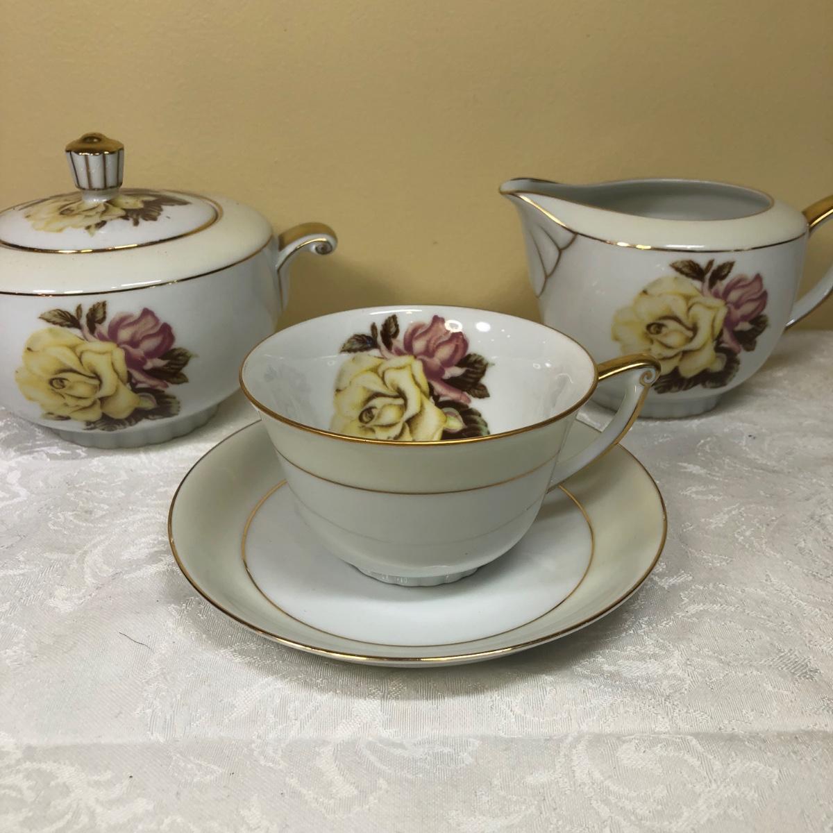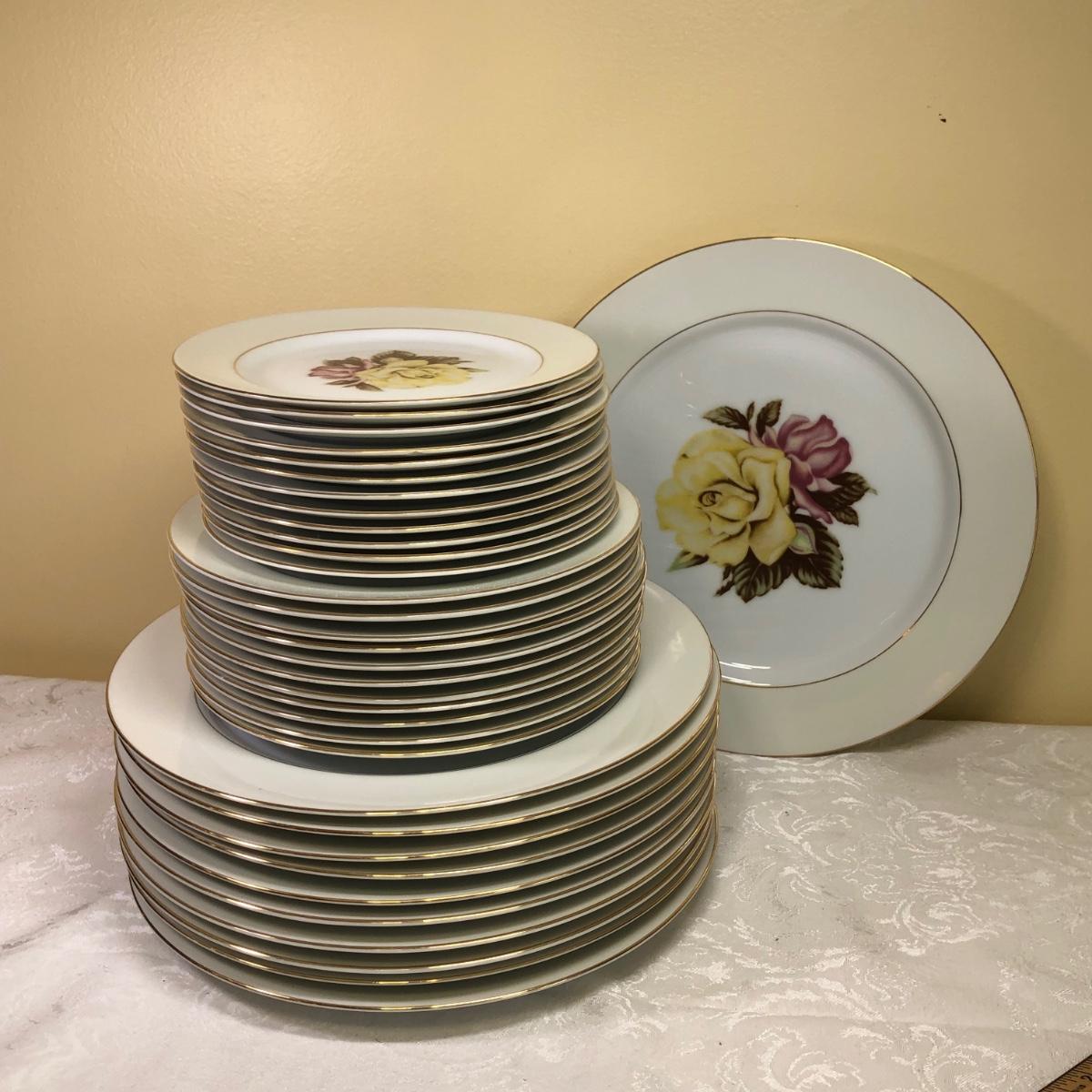 Made in Japan. Set includes serving dishes, 9 bowls, 10 small bowls, 11 dinner plates, 11 medium plates, 11 dessert plates, 10 saucers, 10 tea cups, a sugar bowl & creamer.