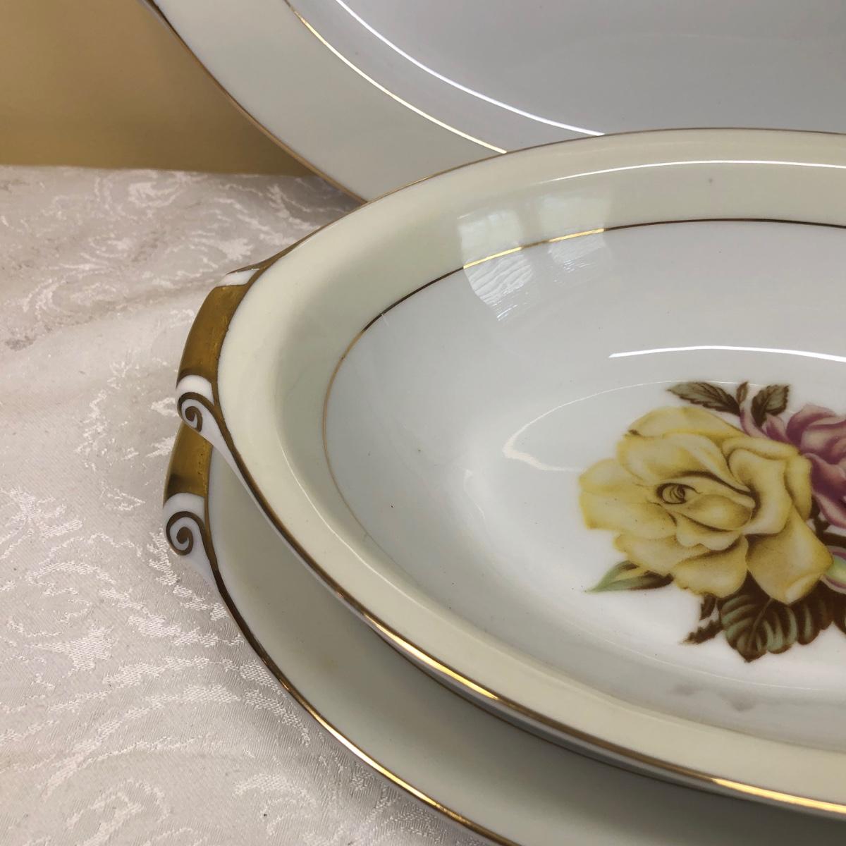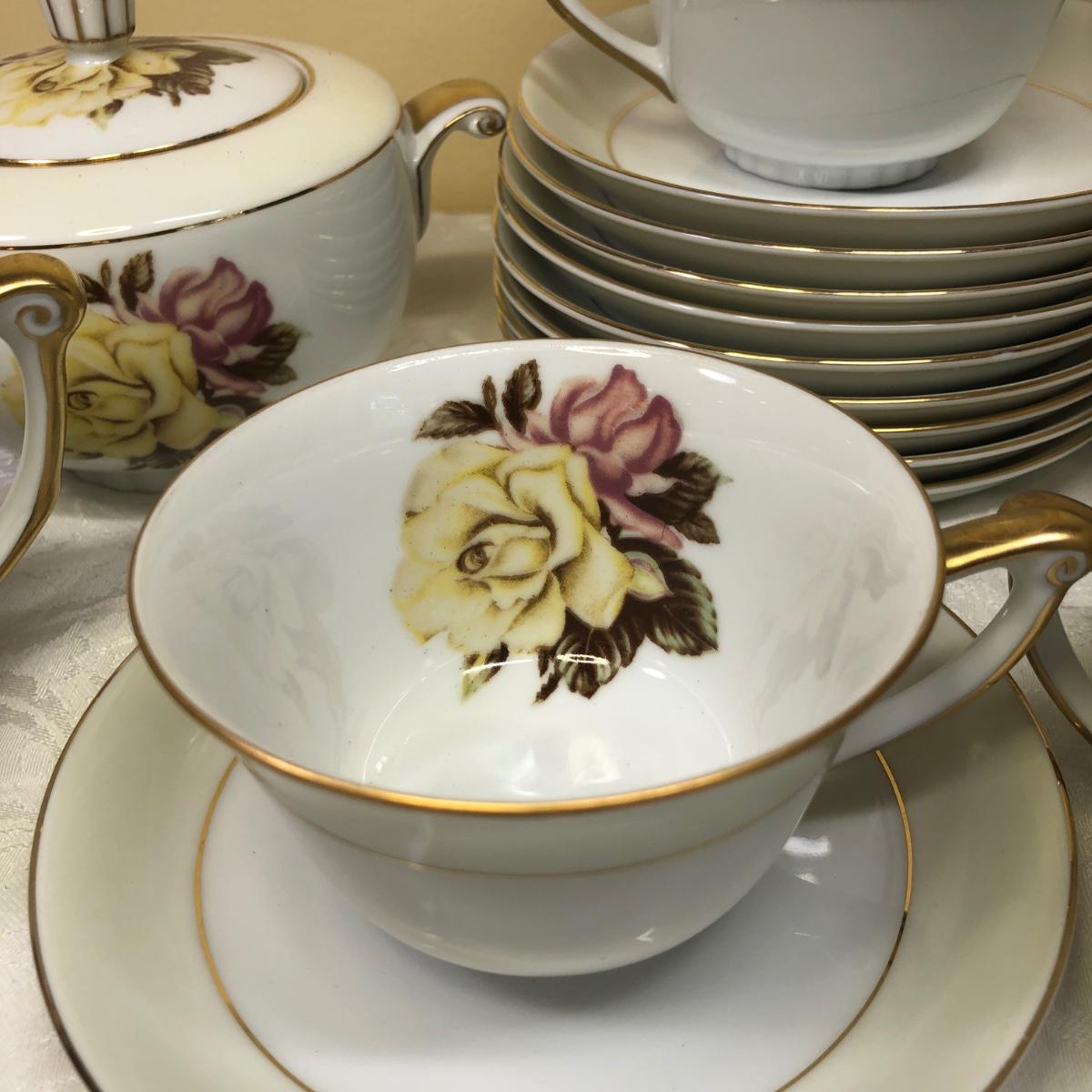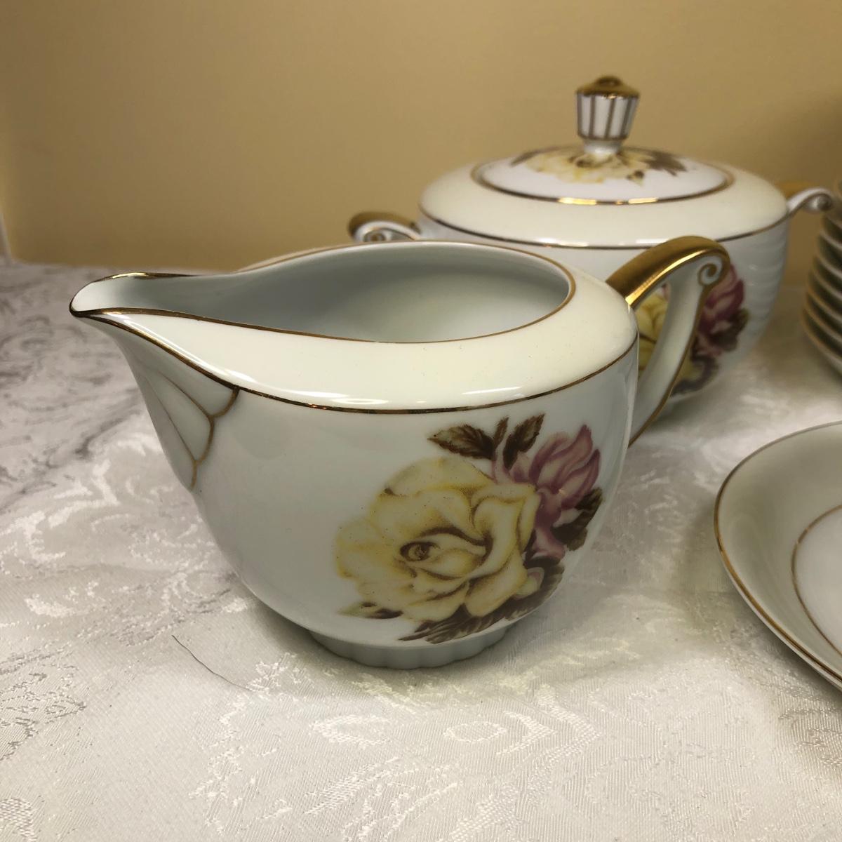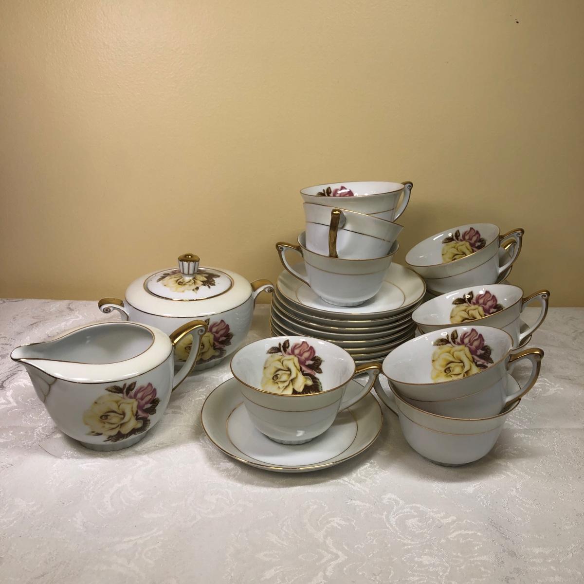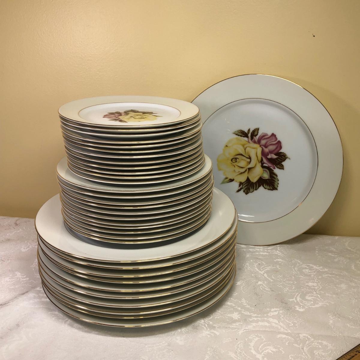 Made in Japan. Set includes serving dishes, 9 bowls, 10 small bowls, 11 dinner plates, 11 medium plates, 11 dessert plates, 10 saucers, 10 tea cups, a sugar bowl & creamer.