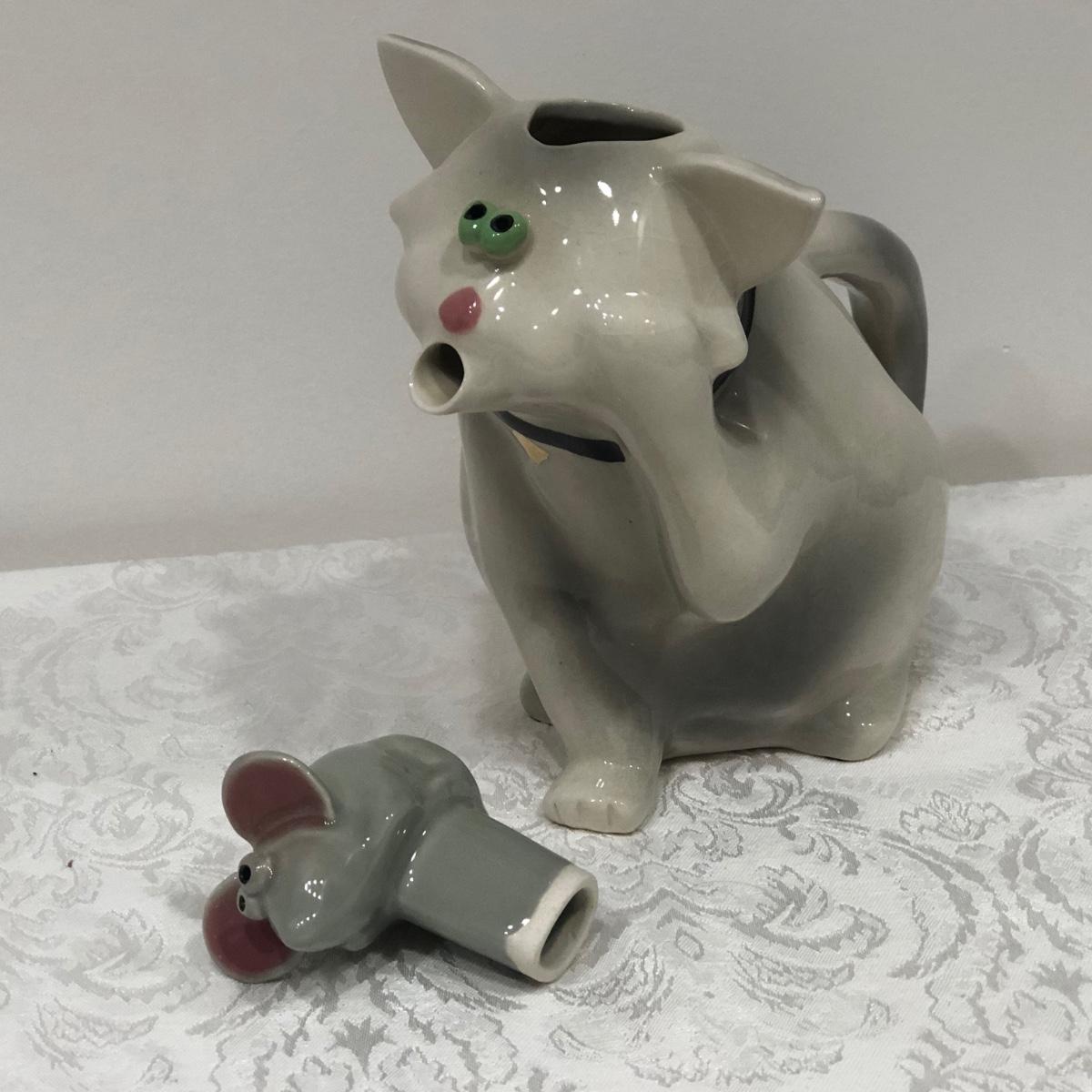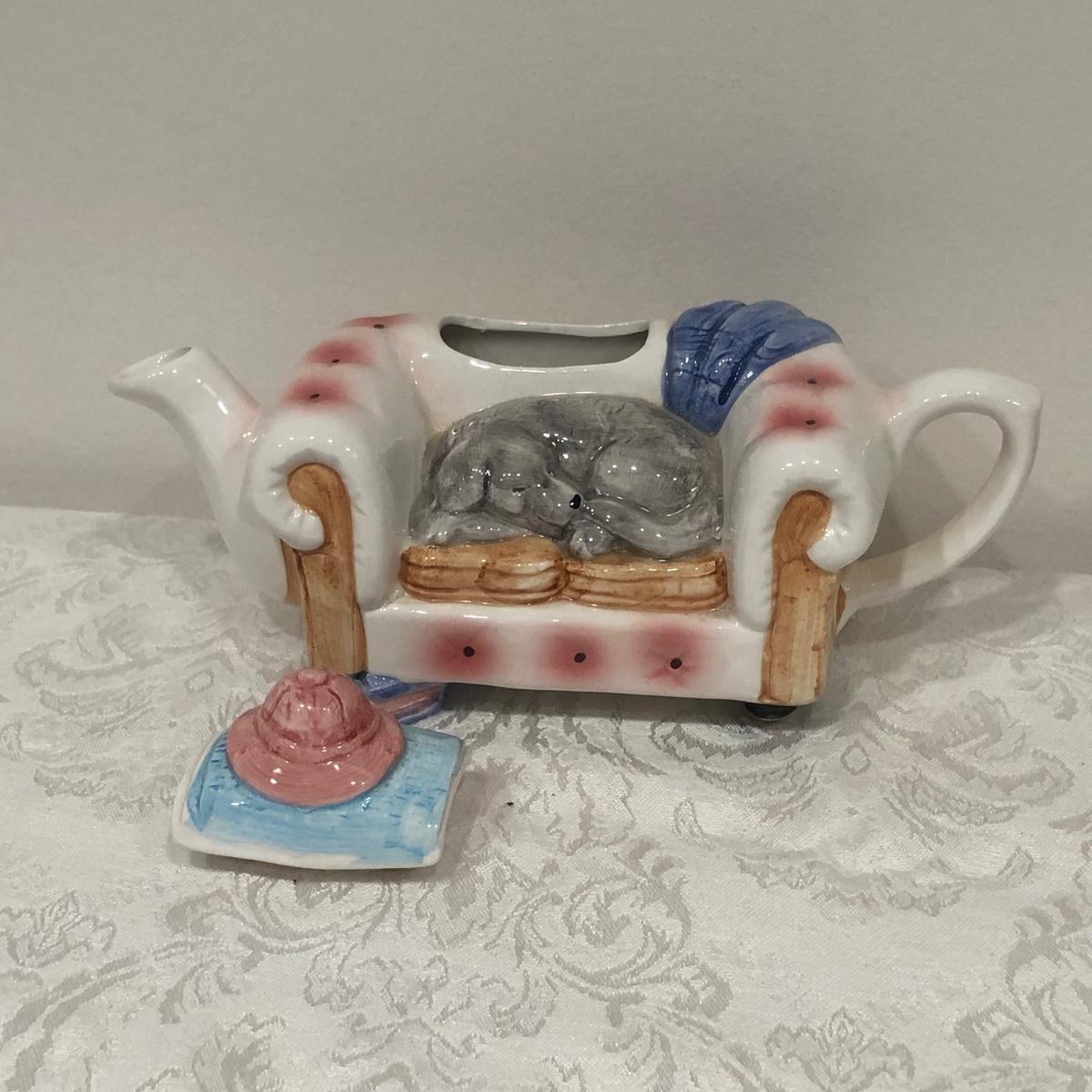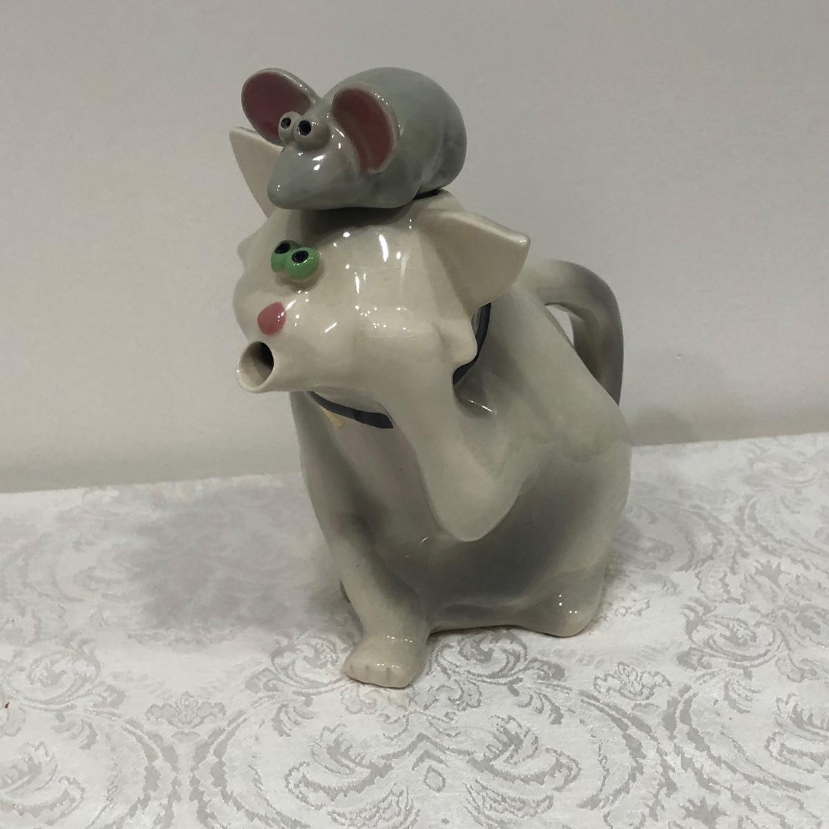 LOT 75M: Tea Pot Collection - Signed John Groth Pottery Cat/Mouse, Department 56, The Haldon Group, Giftcraft, Cardew Designs, 1993 Cardinal Inc. Barber Teapot & More