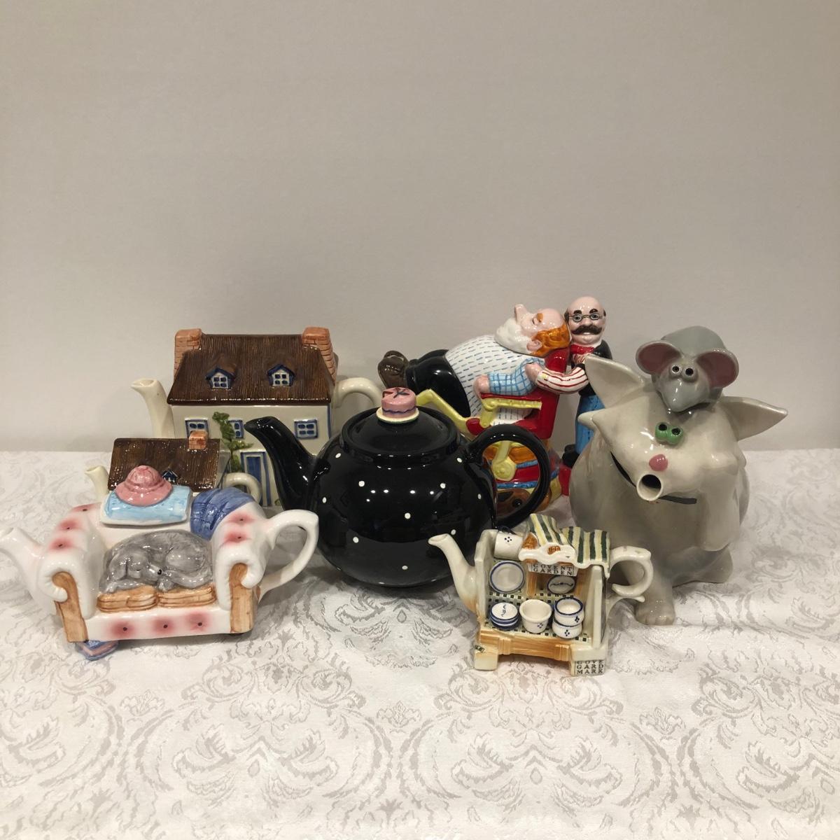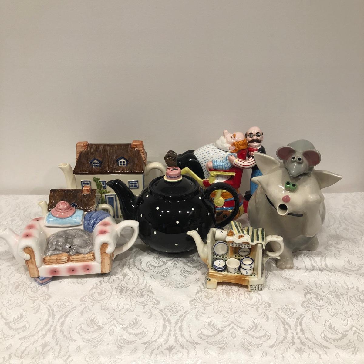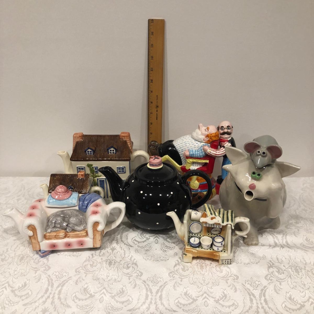 LOT 75M: Tea Pot Collection - Signed John Groth Pottery Cat/Mouse,  Department 56, The Haldon Group, Giftcraft, Cardew Designs, 1993 Cardinal Inc. Barber Teapot & More