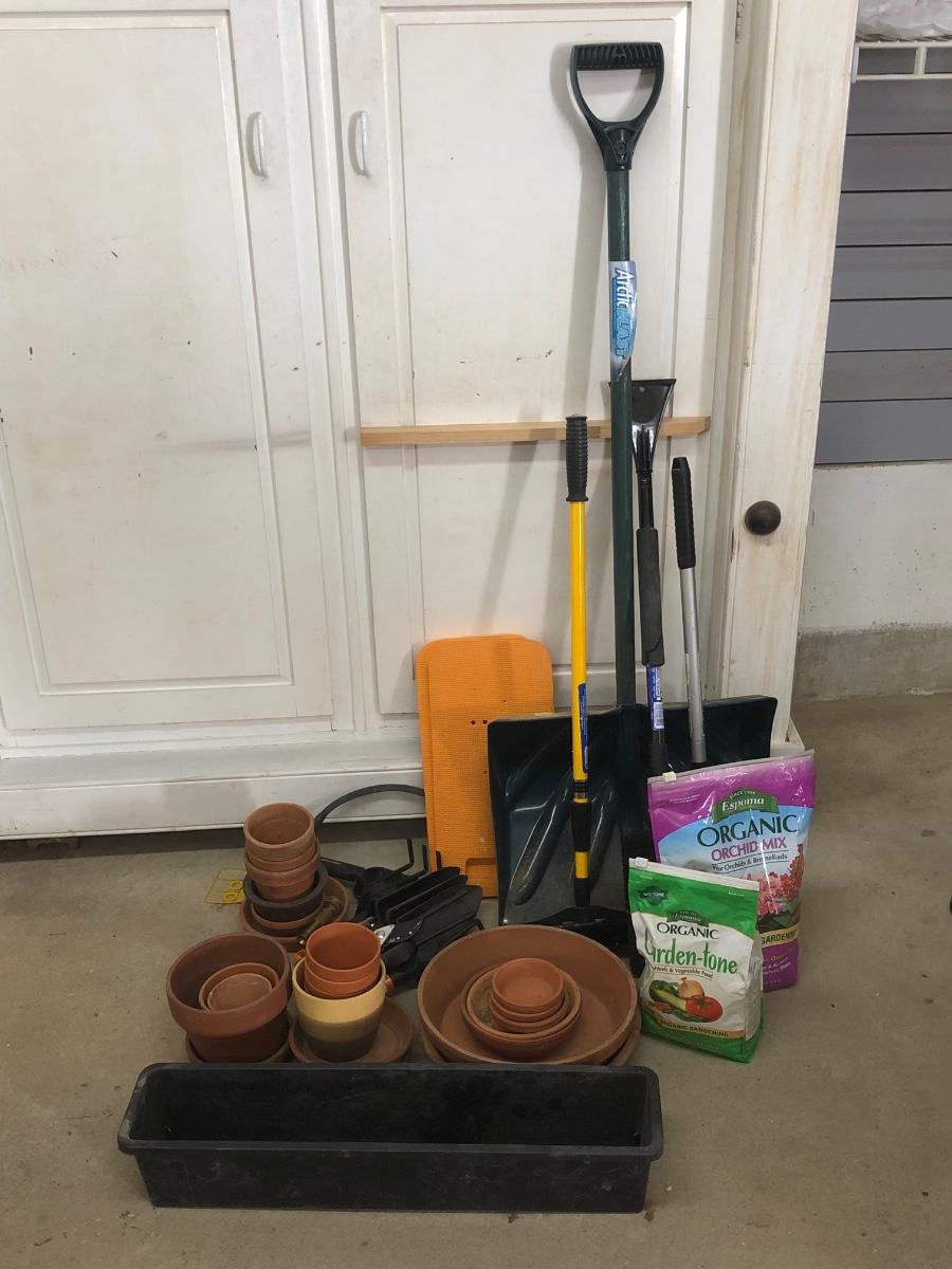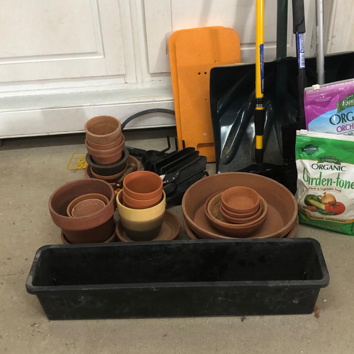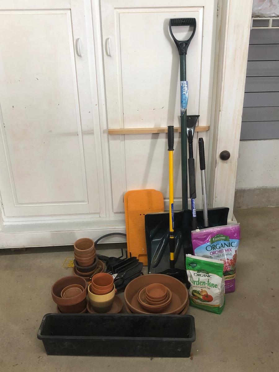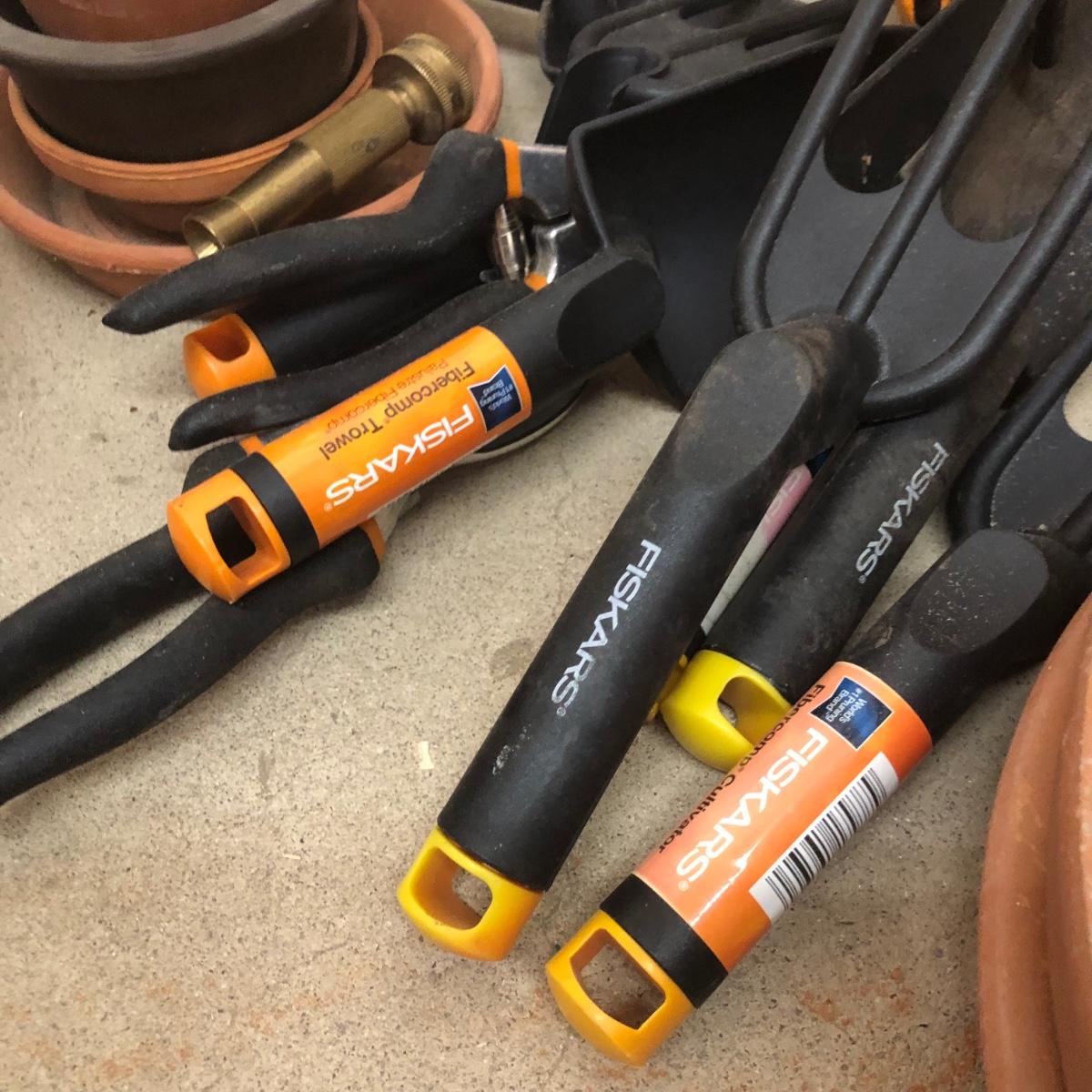 LOT 82M: Fiskars Gardening Tools, Pots/Planters, Shovel & More