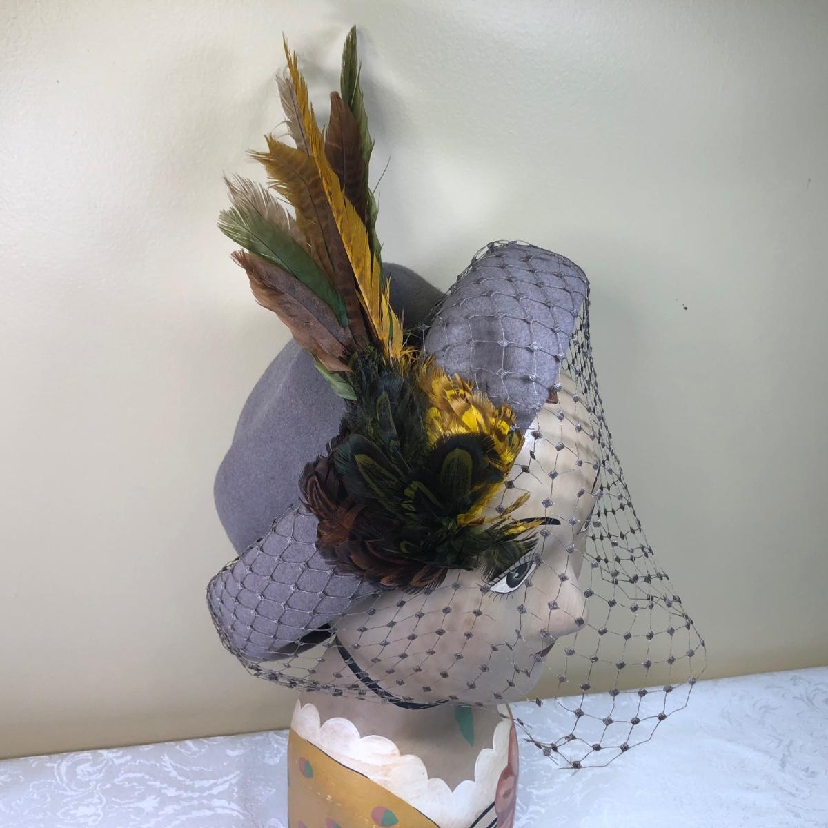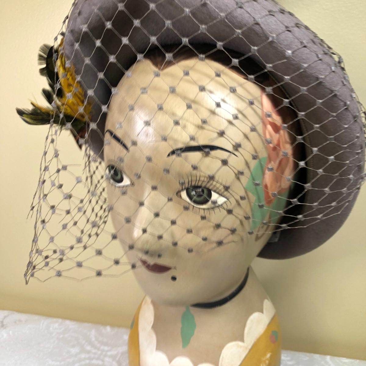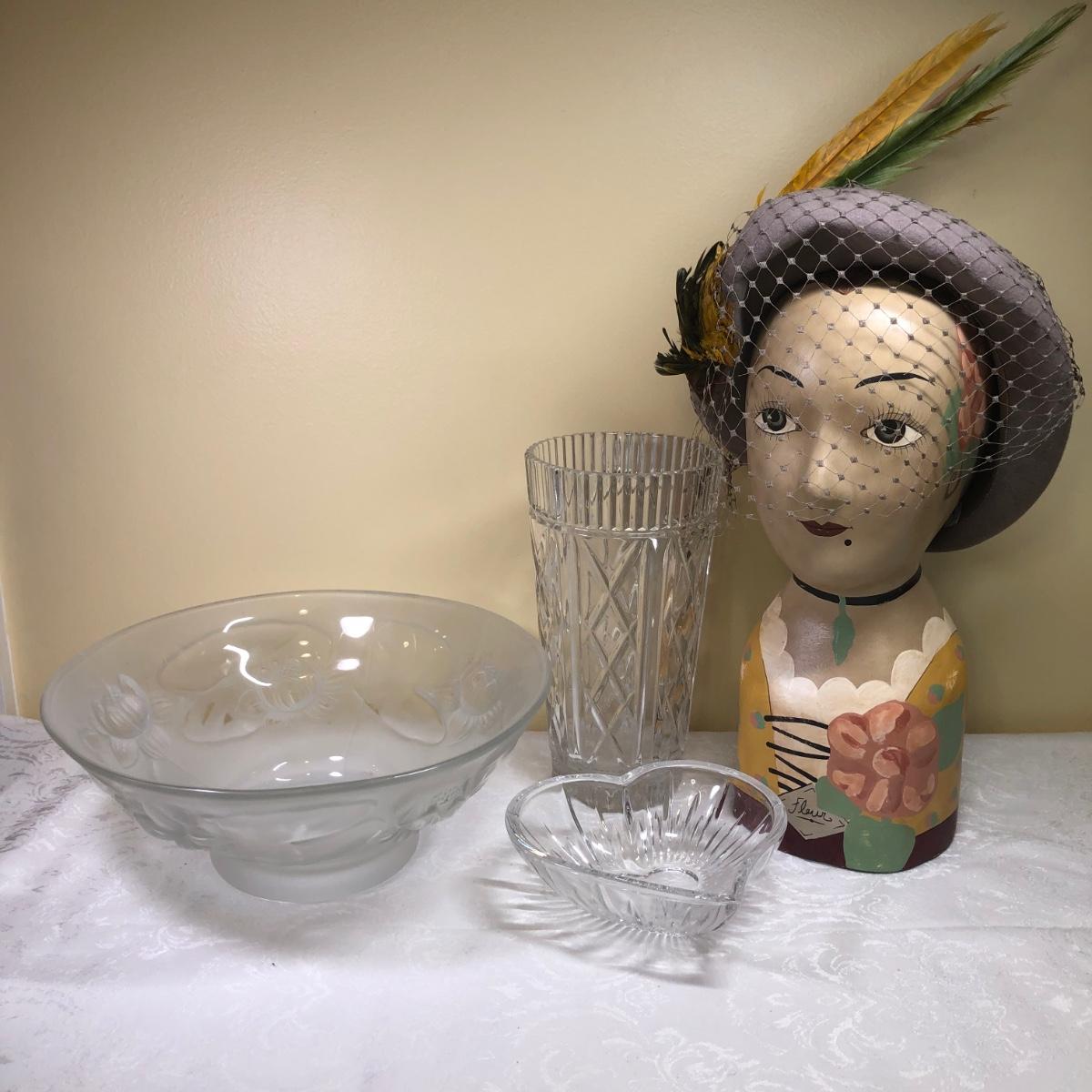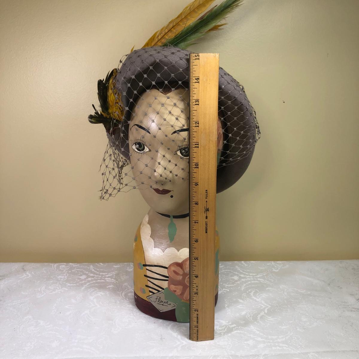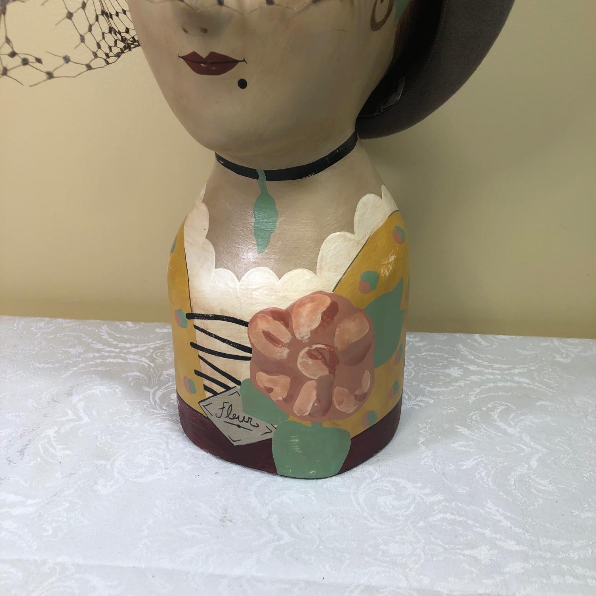 LOT 106M: Vintage Art Deco French Mannequin/Millinery Head w/Feathered Hat, Vase, Trinket Dish & Bowl