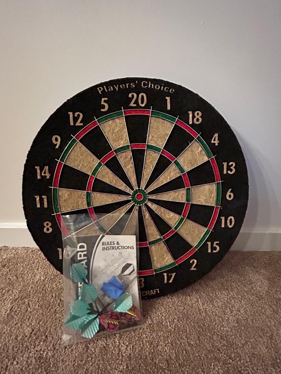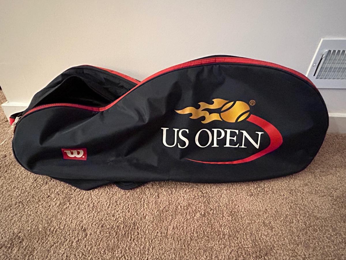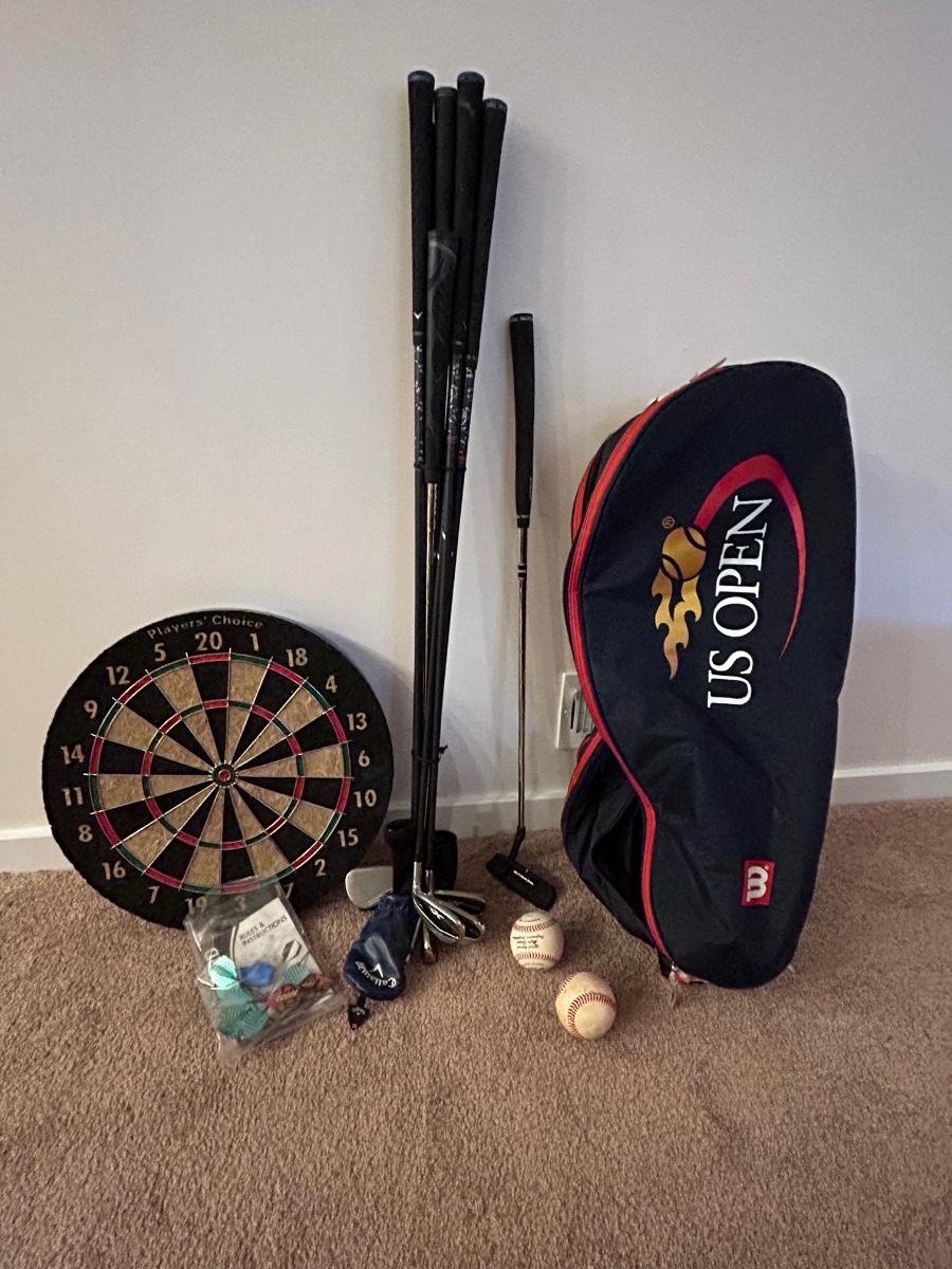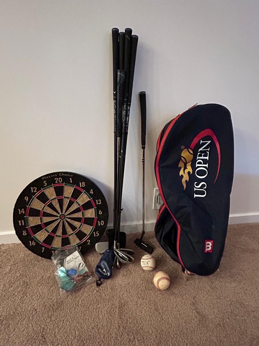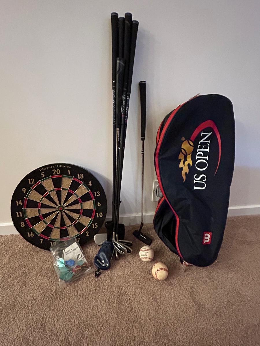 Golf clubs, dart board with darts, Wilson US Open tennis bag and baseballs.