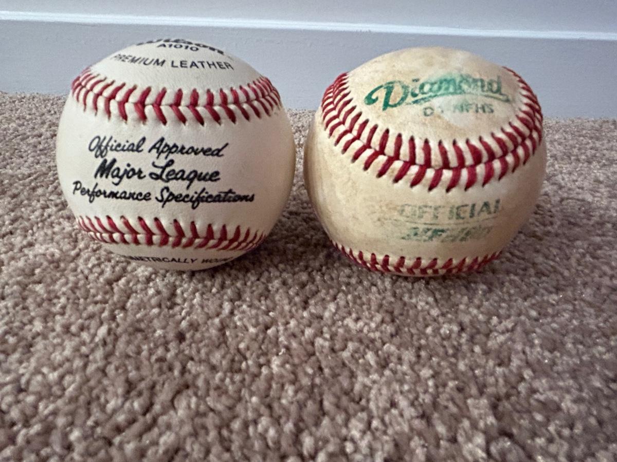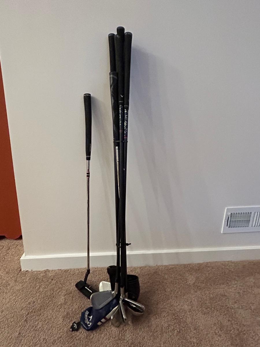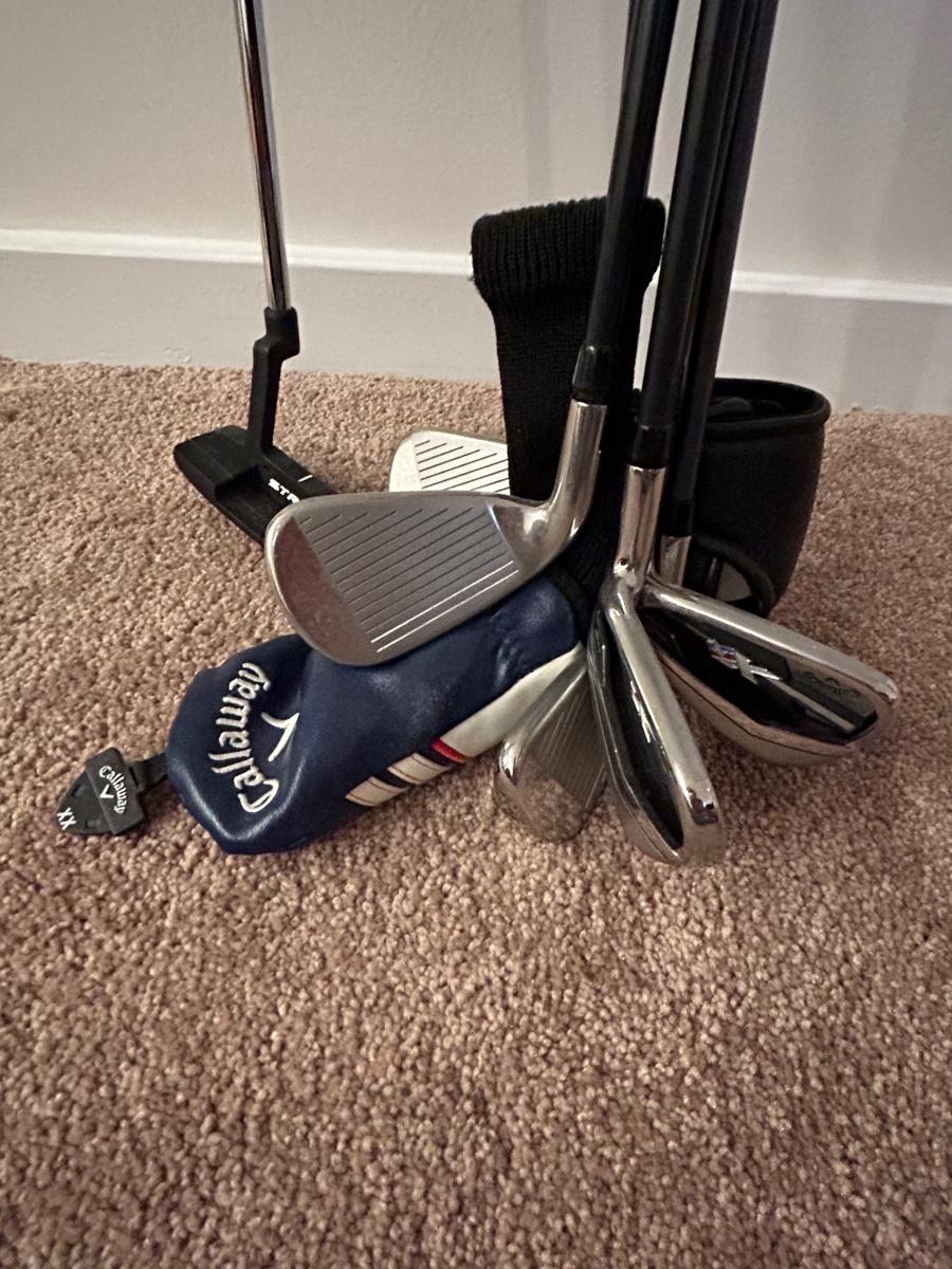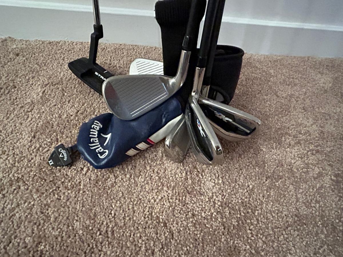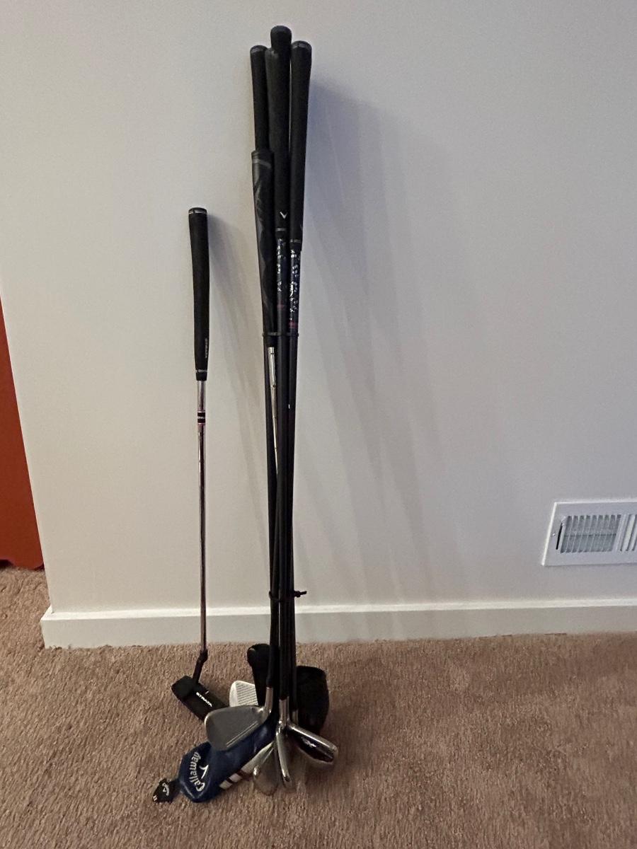 Golf clubs, dart board with darts, Wilson US Open tennis bag and baseballs.