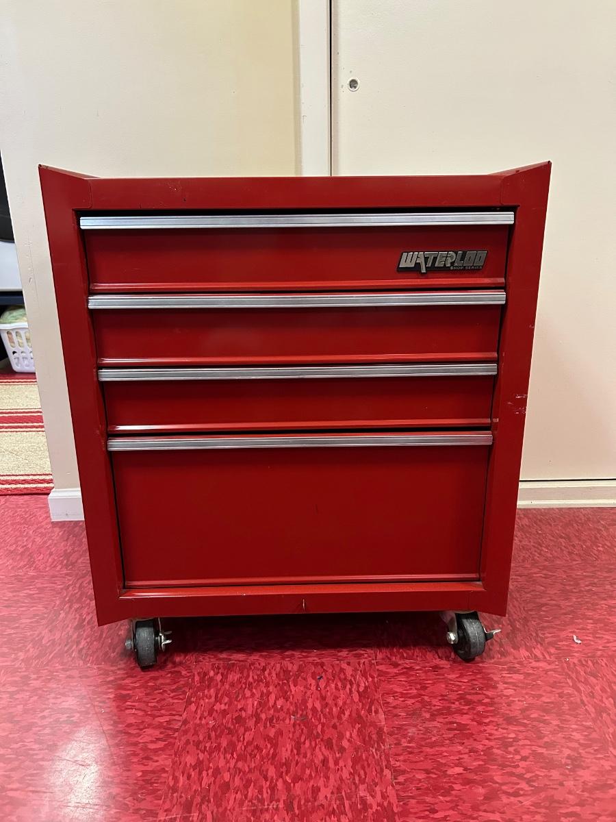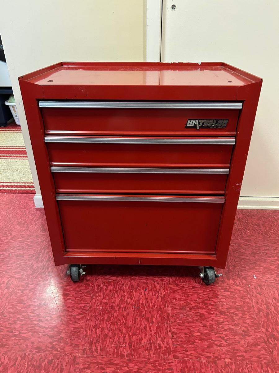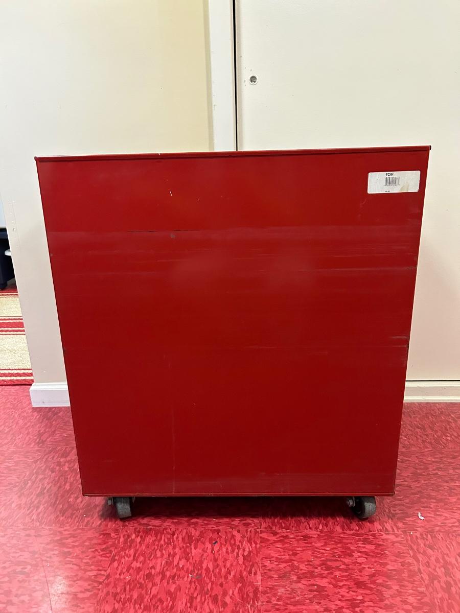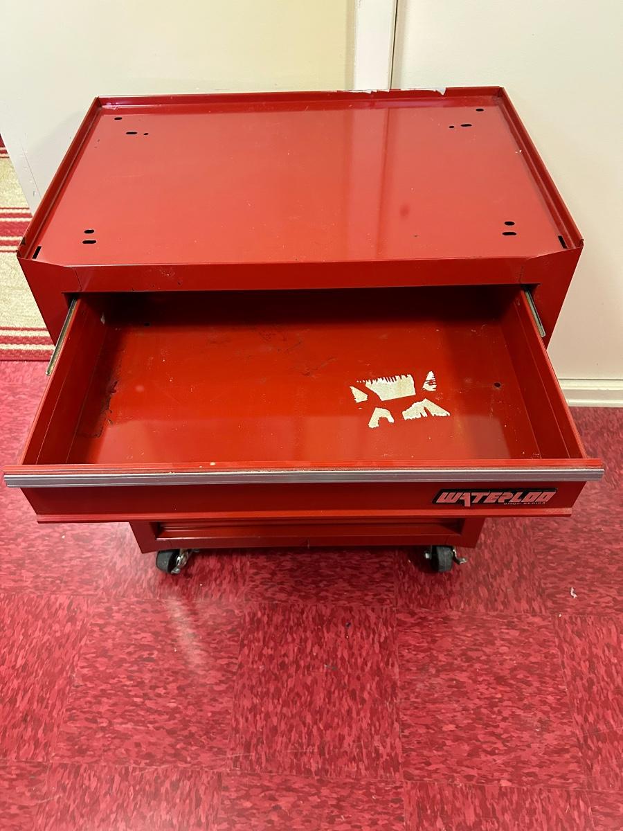 26”x18”x30” Red metal Waterloo tool box on wheels.