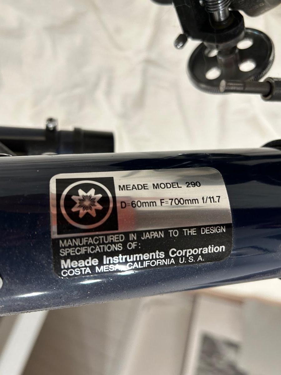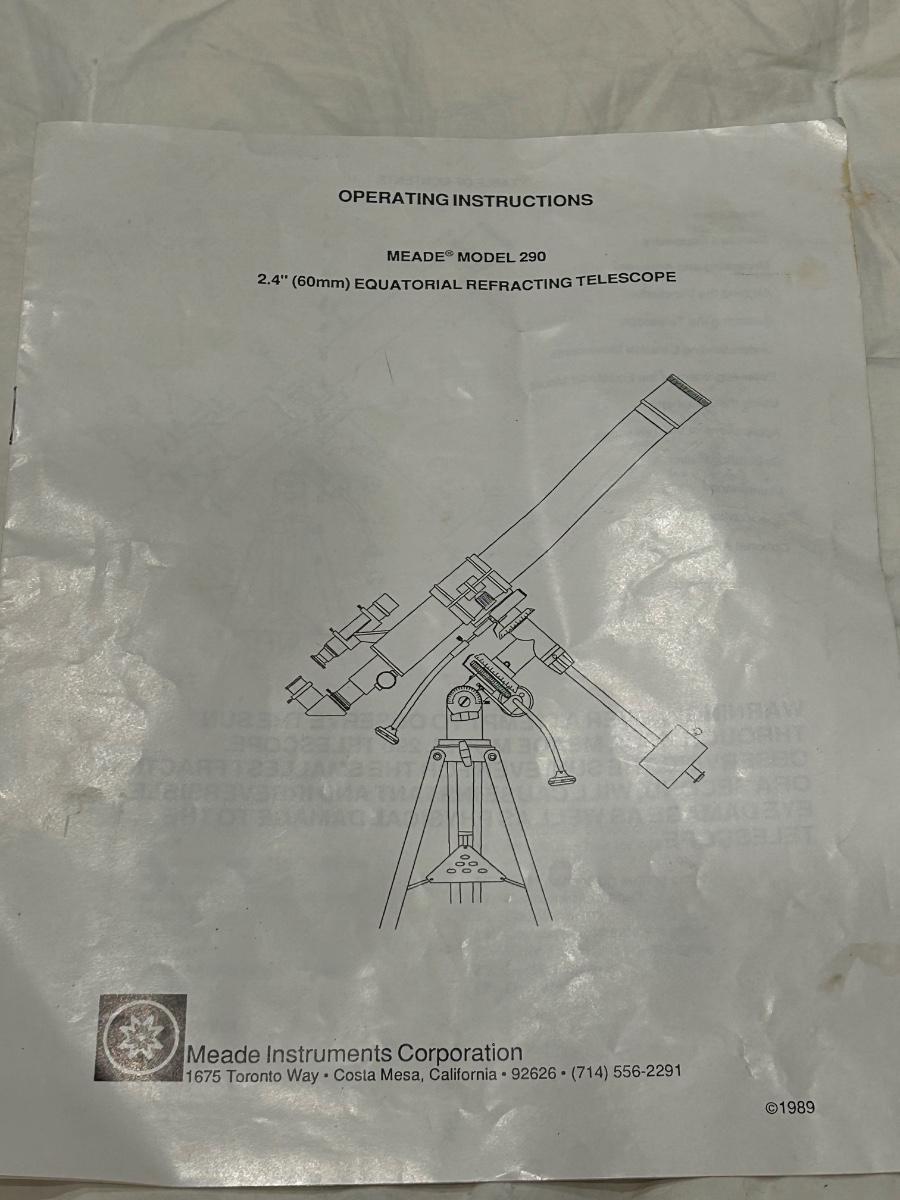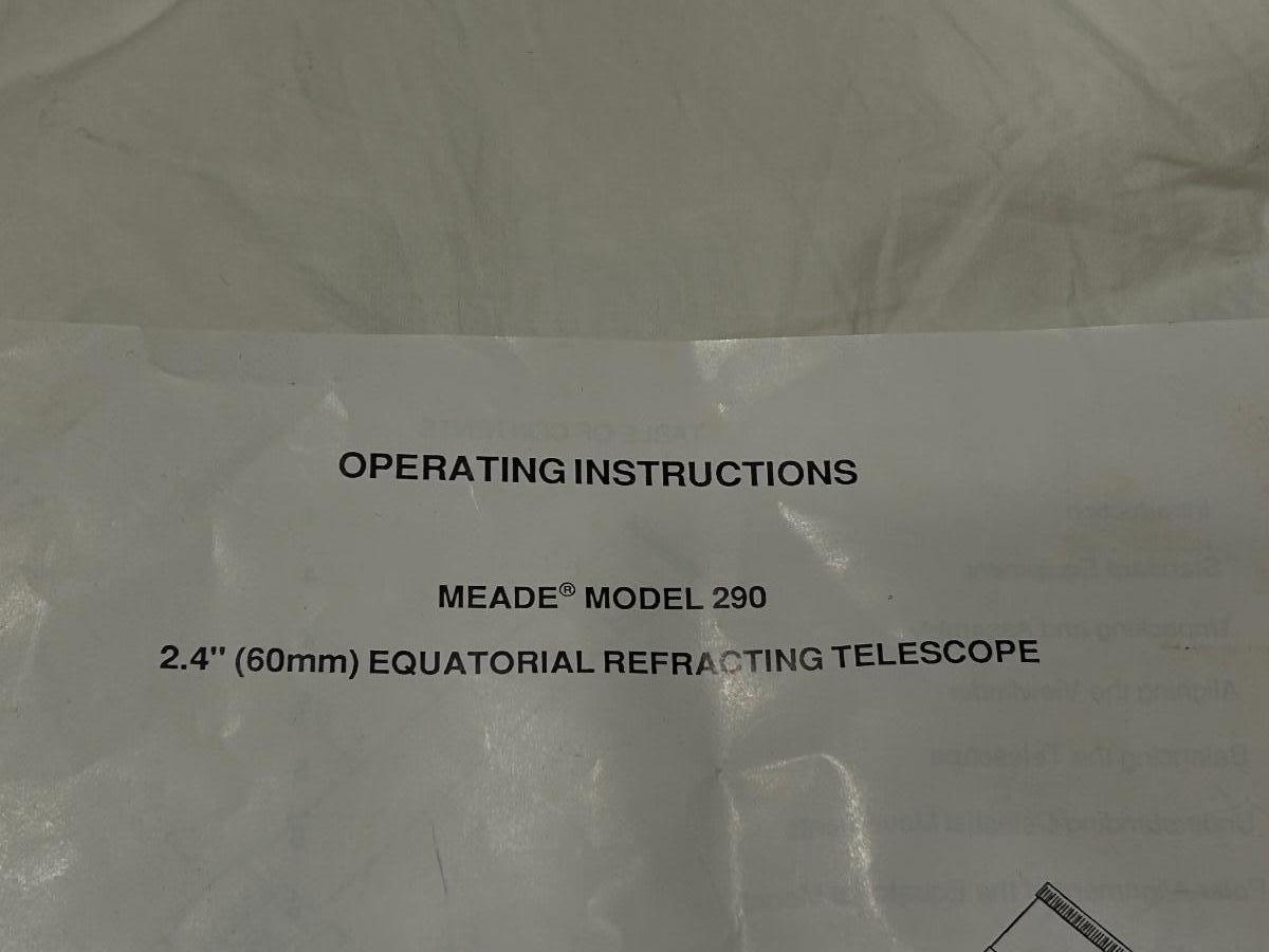 Model number 290. 2.4” (60mm) Mead telescope. Item is complete but does not come put together.