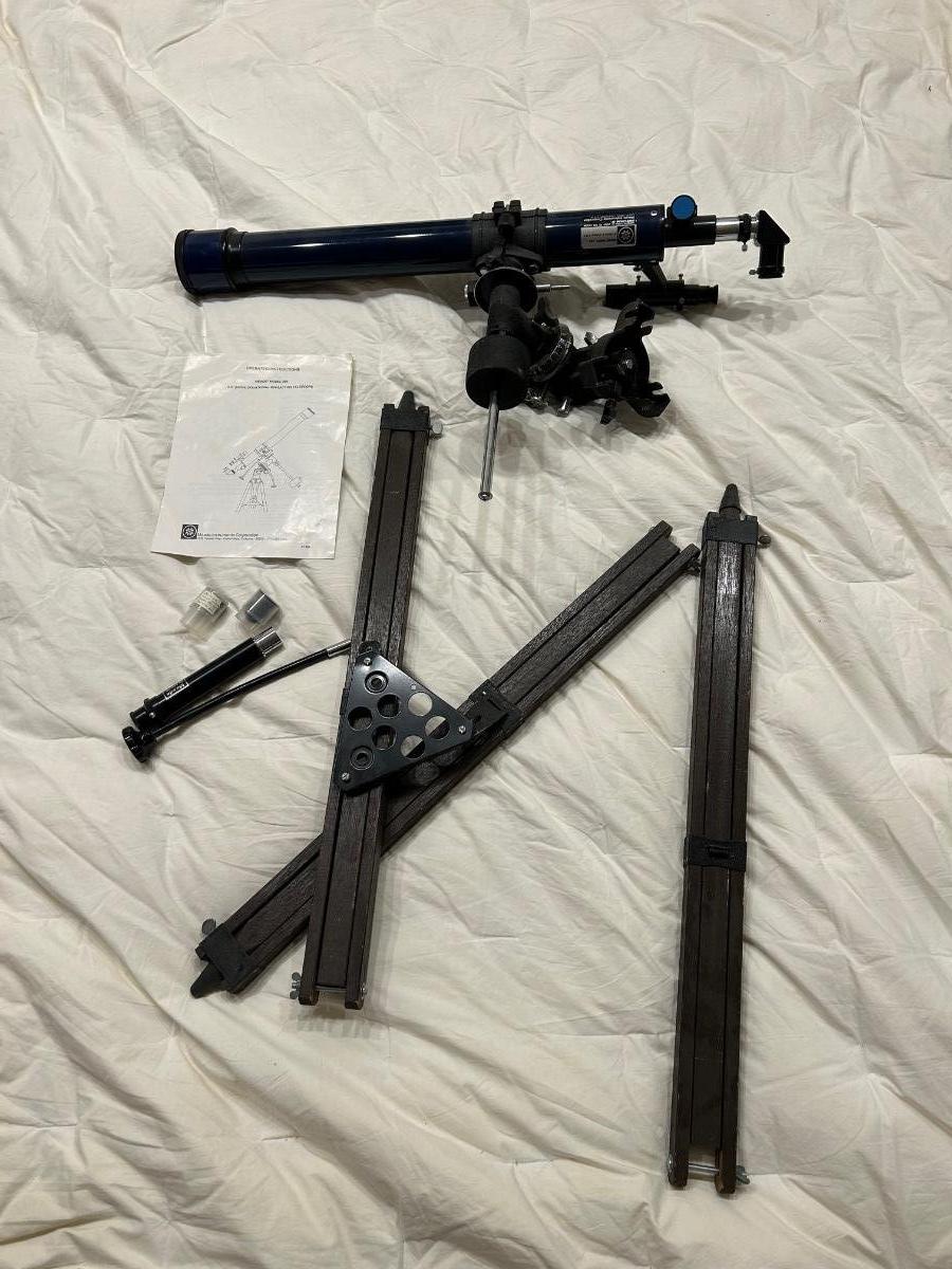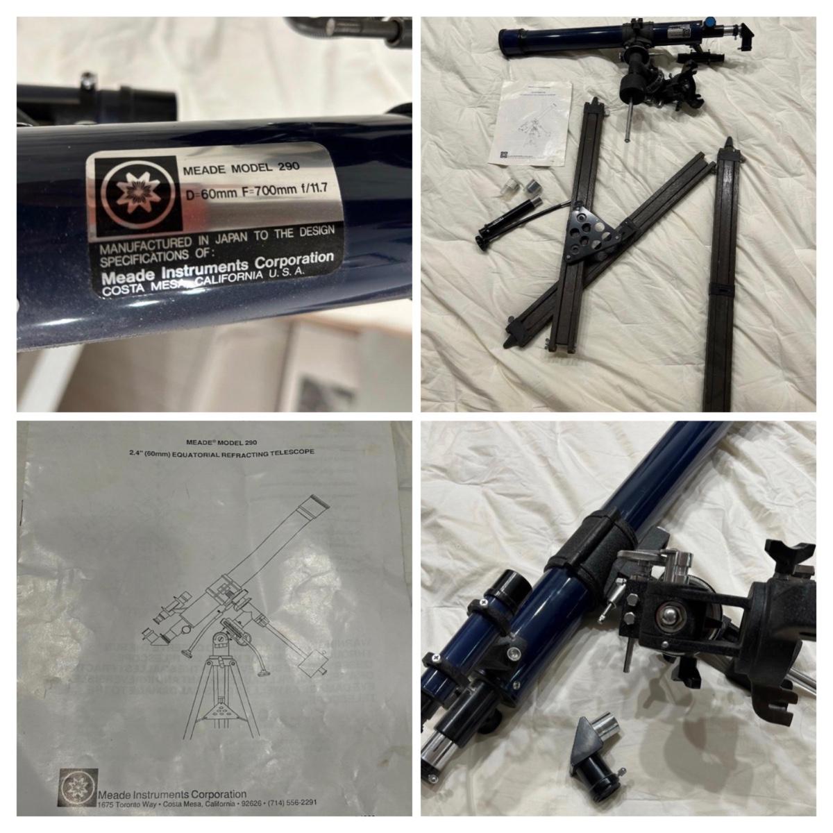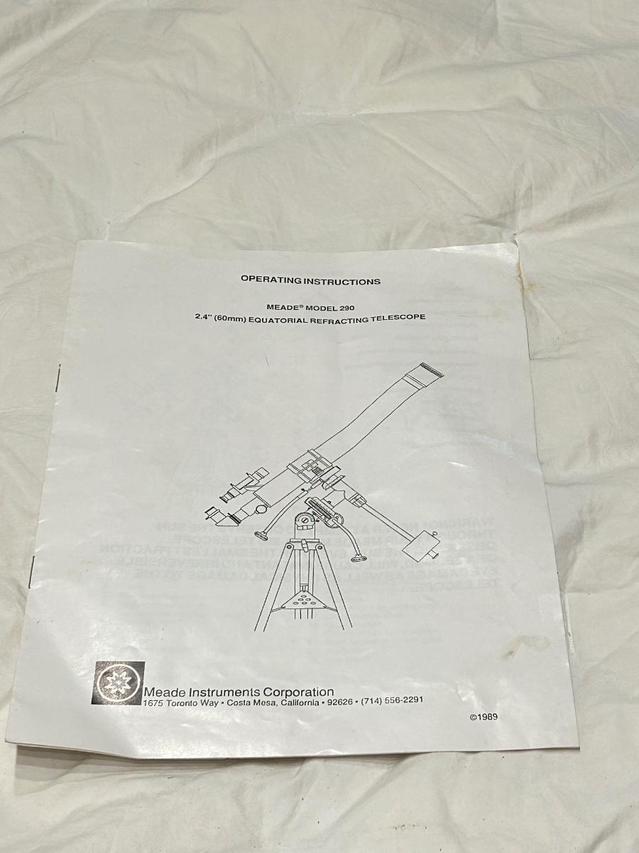 Model number 290. 2.4” (60mm) Mead telescope. Item is complete but does not come put together.