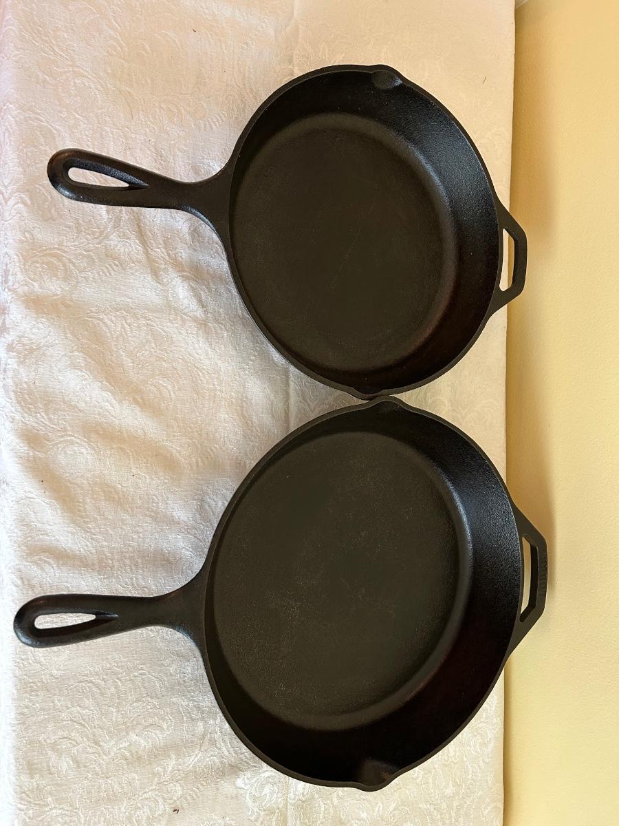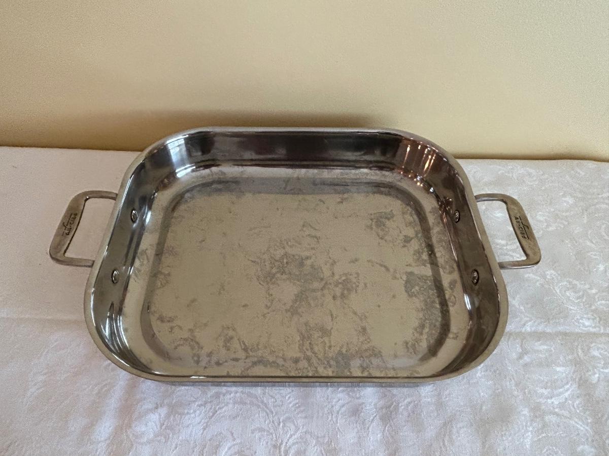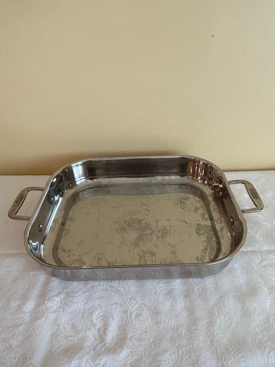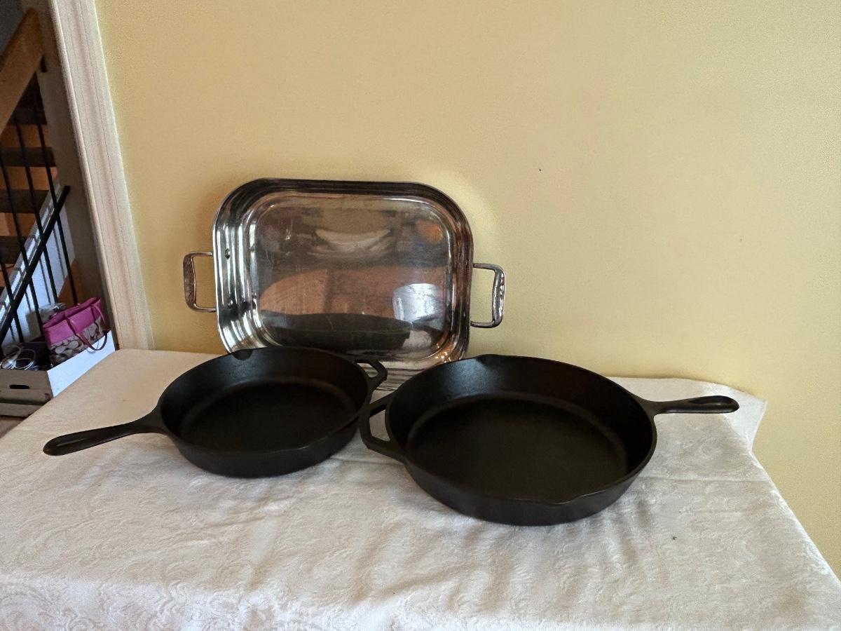Two cast iron pans by Forge and a baking pan by All-Clad.