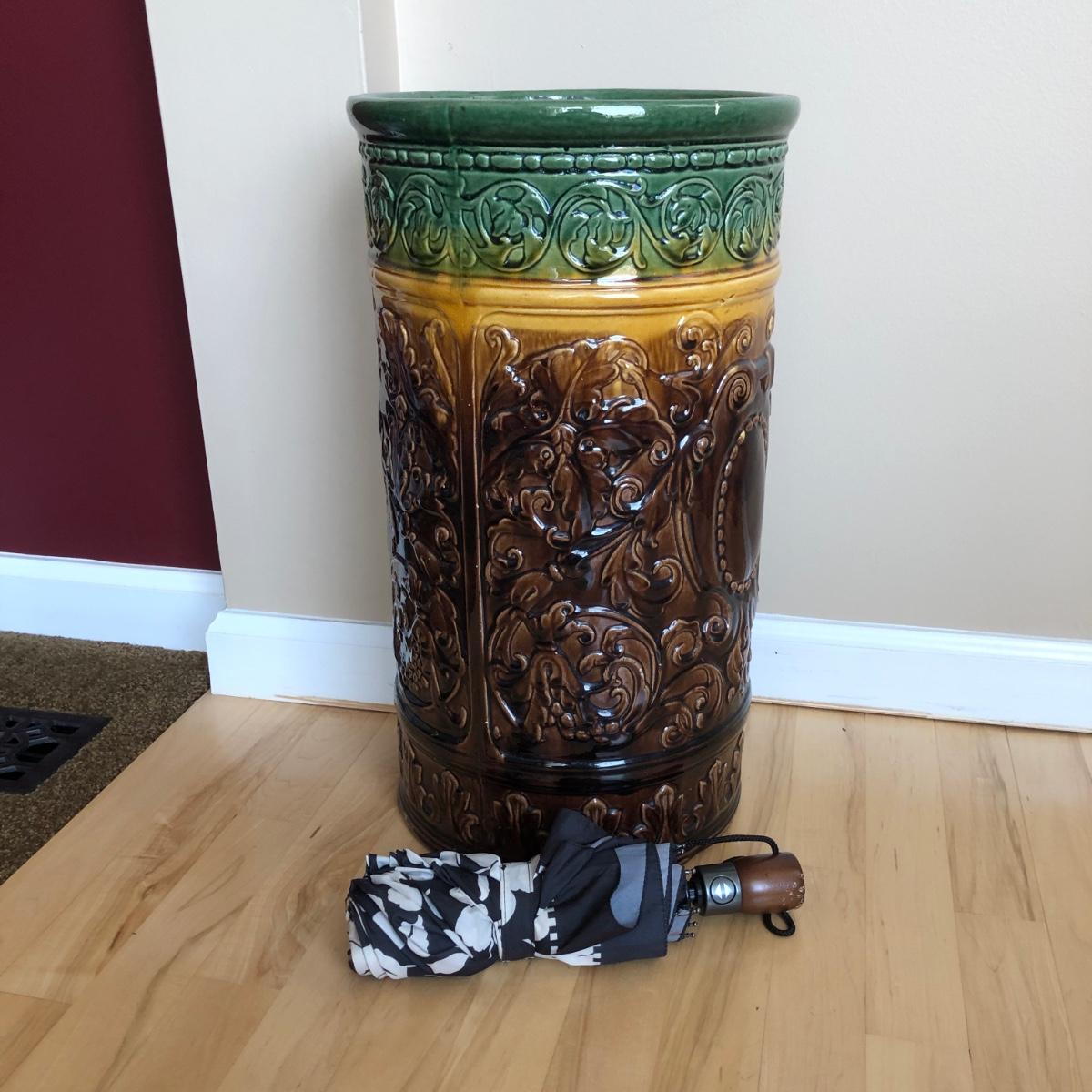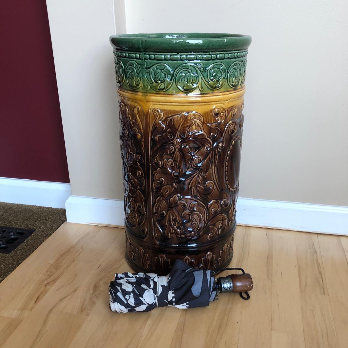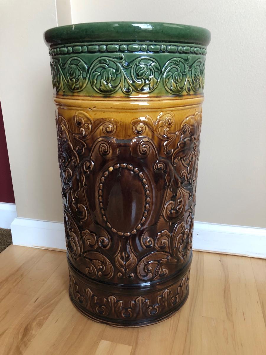 This piece is unmarked, but is thought to be a Weller Majolica pottery umbrella stand. Please see all pictures as they are the best representation of the items. The pictures show condition, measurements if taken, and what is included in the lot. Due to the large amount that we photograph and the time frame, we are not always able to take measurements. All items unless noted, are pre-owned and have been used. If you purchased furniture, you must bring help. We do not allow one person to carry large furniture out on their own. Bring help, tools and a truck for the safety of our client’s homes, and your personal safety. Any damages that result to the property including walls, and floors due to moving of the furniture will be charged to the buyer. Company policy. Thank you.