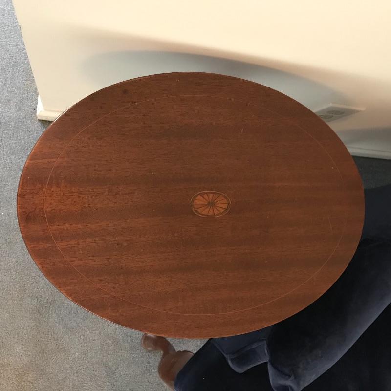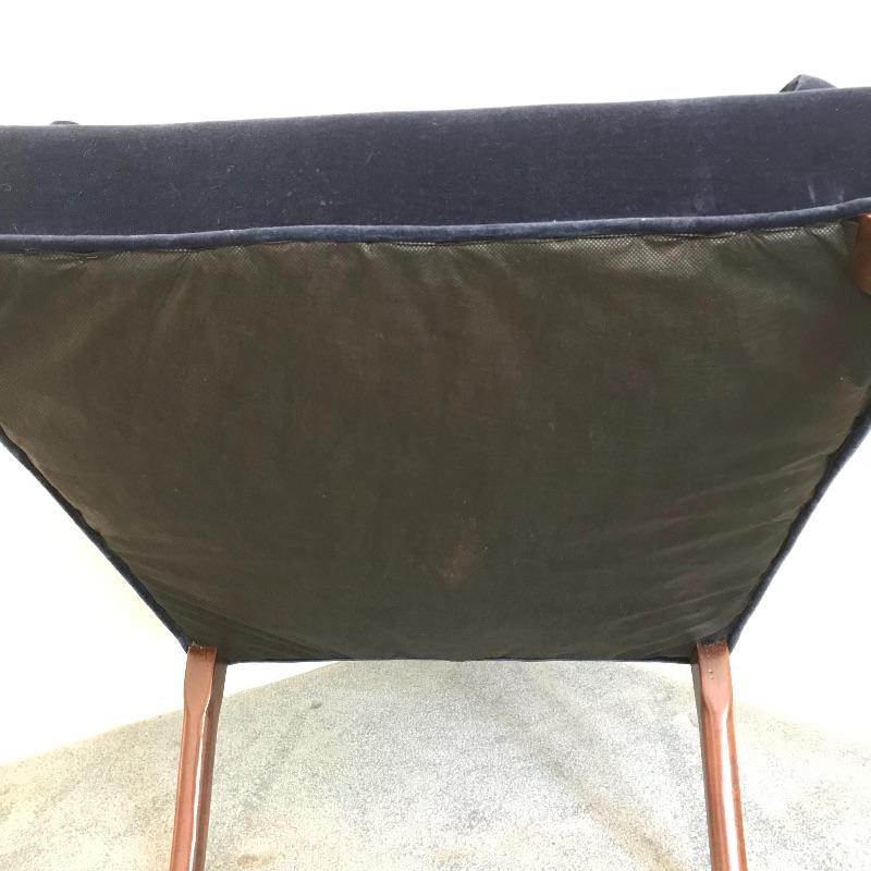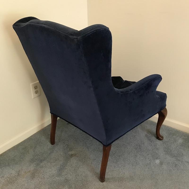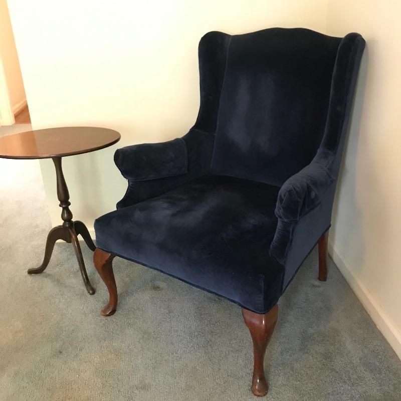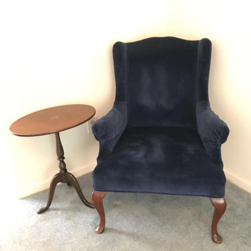 Very charming duo here with a lovely side table with a subtle inlaid flower in its center. Table uniquely can be adjusted, see photos. Accompanying the vintage wooden table is a lovely blue highback chair with wooden legs. Chair is sturdy and appears in fine condition with a few minor blemishes on its legs and feet. Chair measures approximately 25.5” x 28” x 36”. Local Pickup Only.