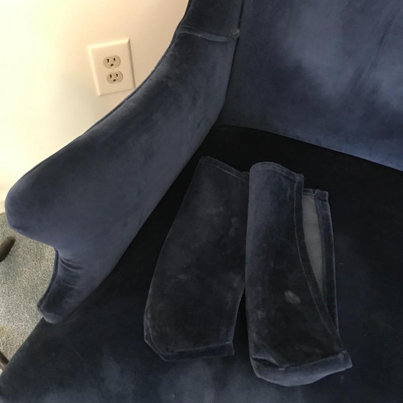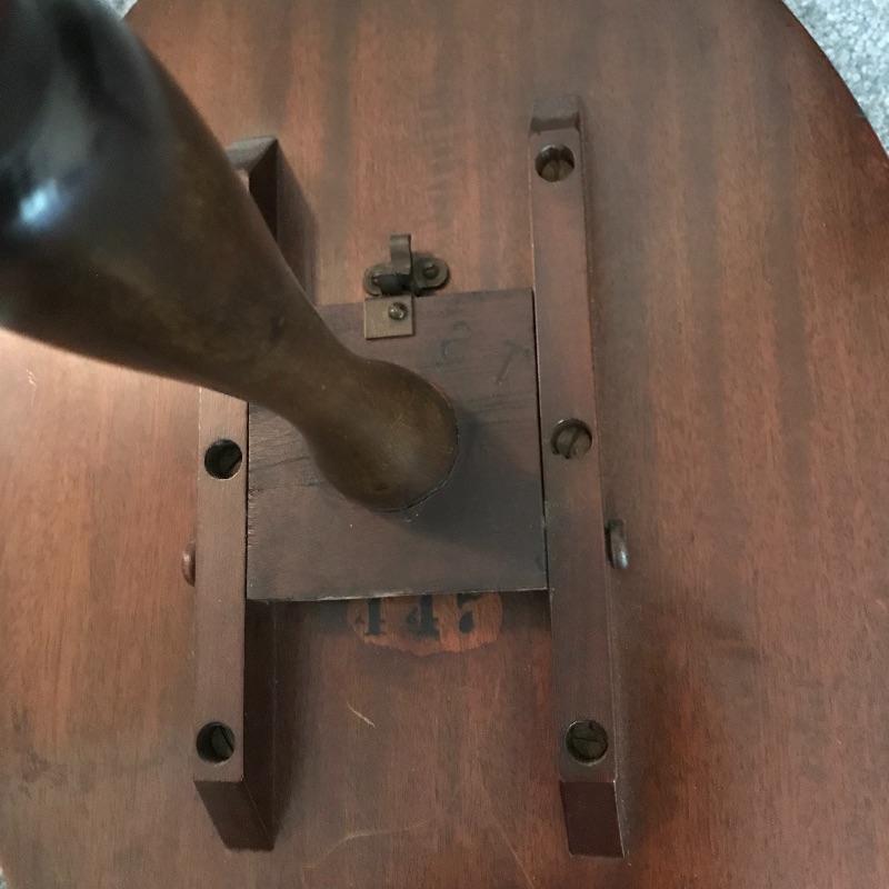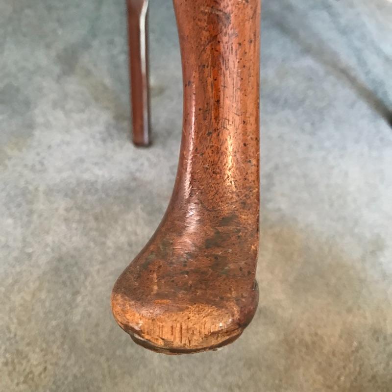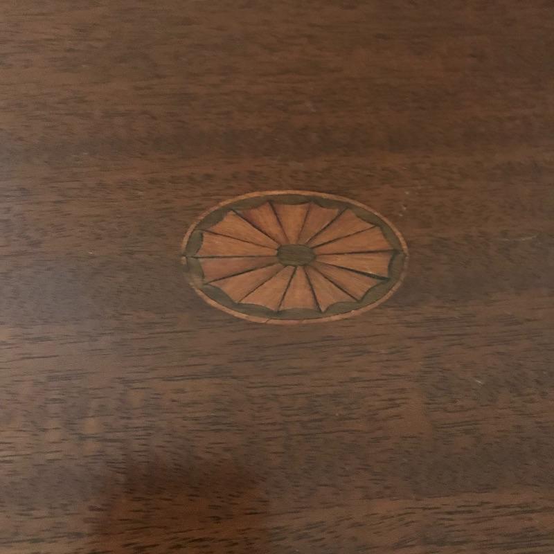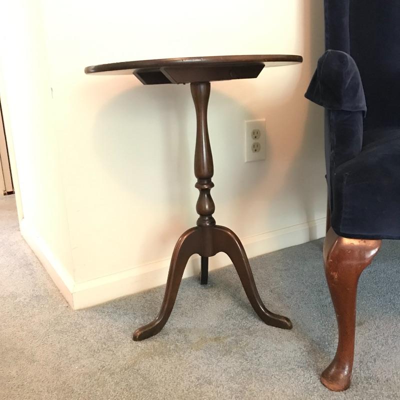 Very charming duo here with a lovely side table with a subtle inlaid flower in its center. Table uniquely can be adjusted, see photos. Accompanying the vintage wooden table is a lovely blue highback chair with wooden legs. Chair is sturdy and appears in fine condition with a few minor blemishes on its legs and feet. Chair measures approximately 25.5” x 28” x 36”. Local Pickup Only.