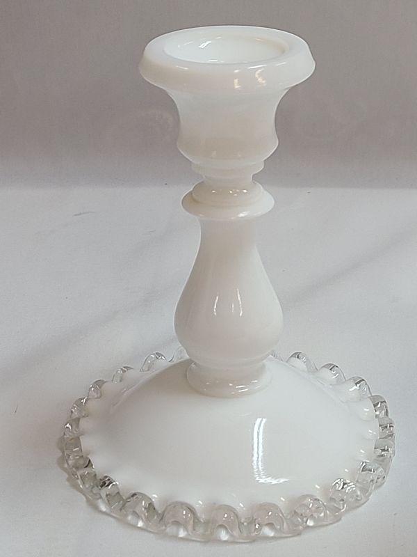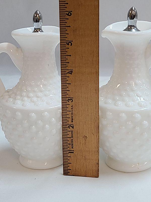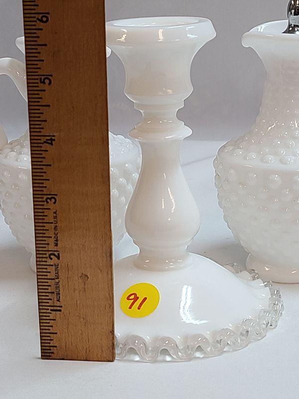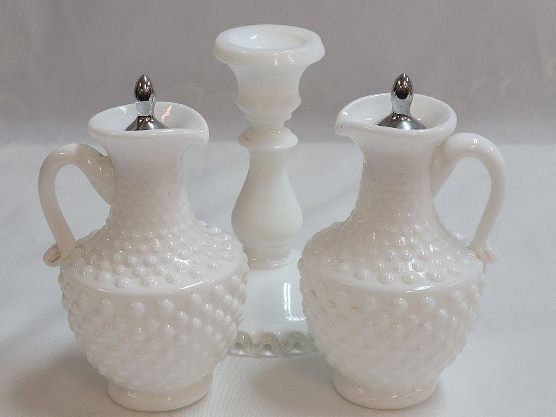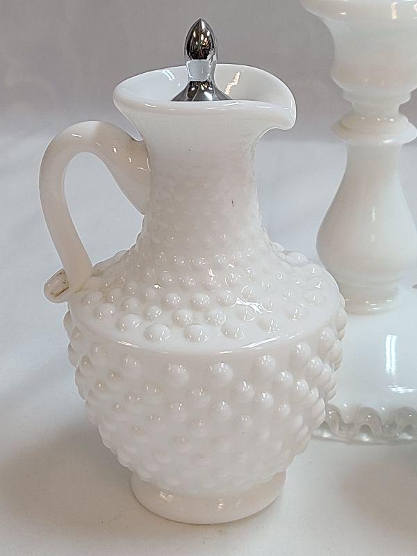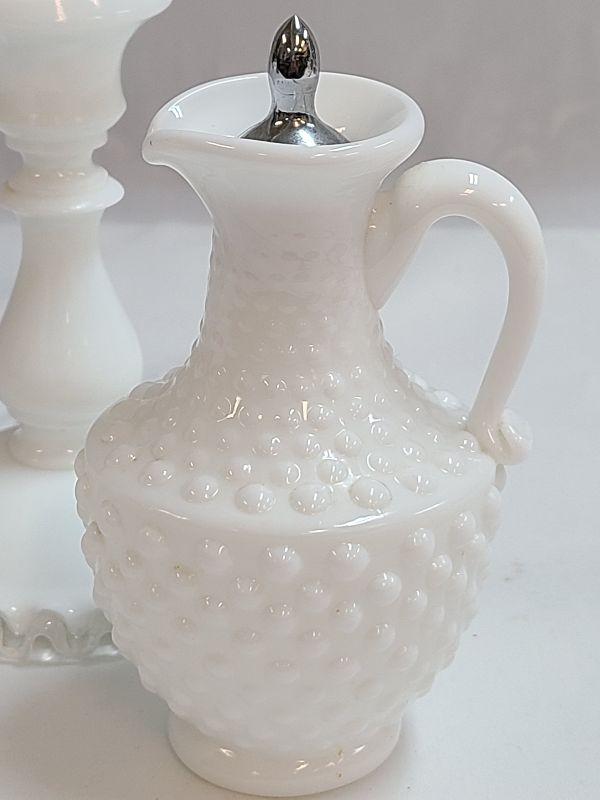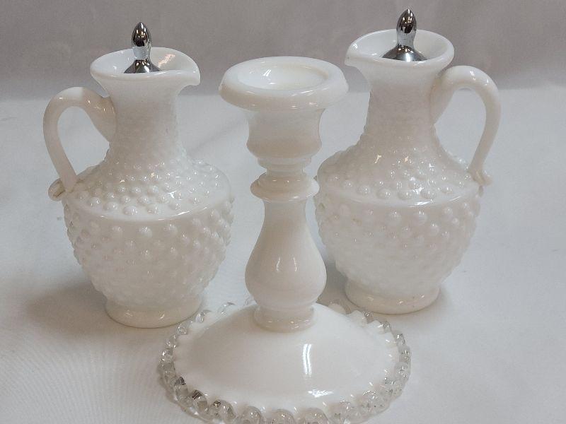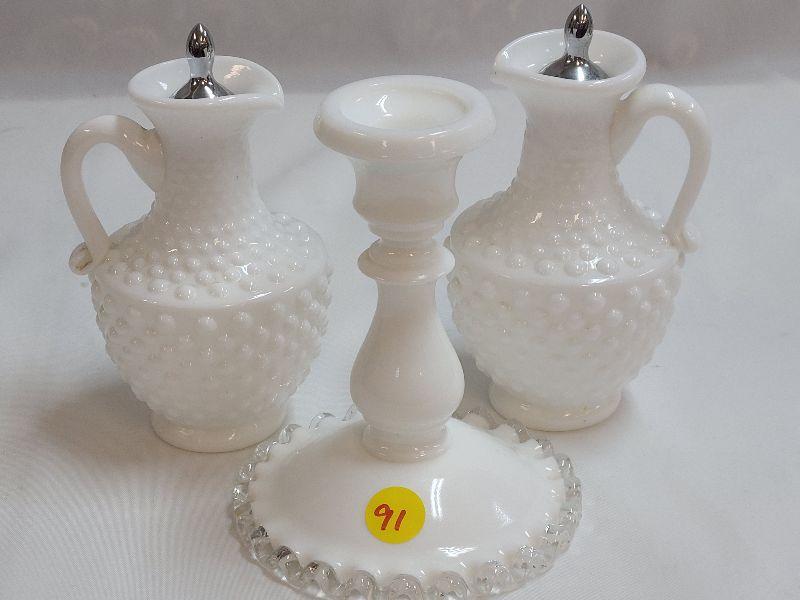 Lot 91: Milk Glass Hobnail Cruet Set and Fenton silvercrest candlestick