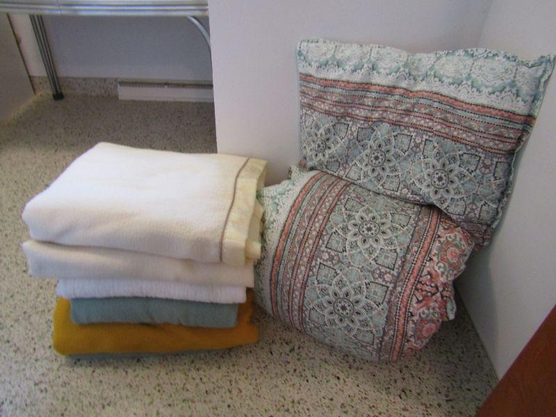 TWIN COMFORTER PILLOW AND MATCHING SHAM, AND SEVERAL BLANKETS
