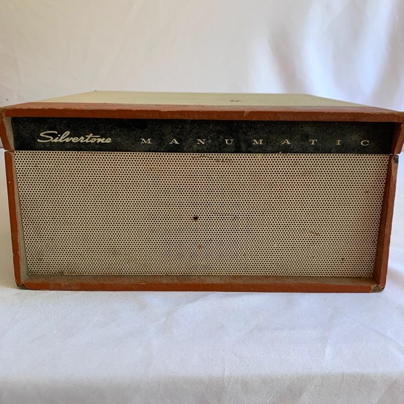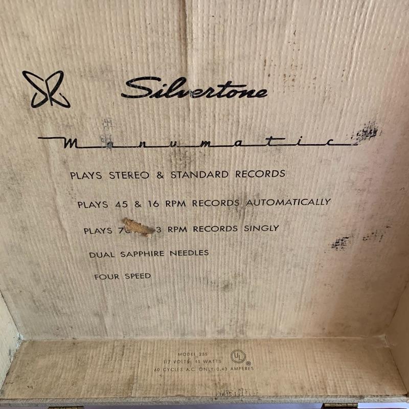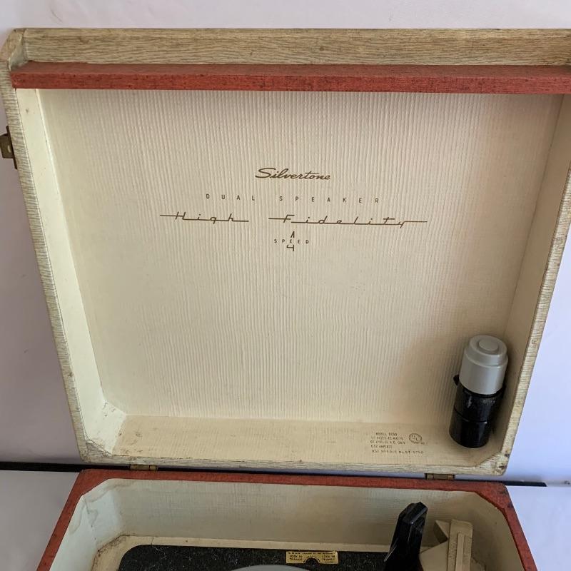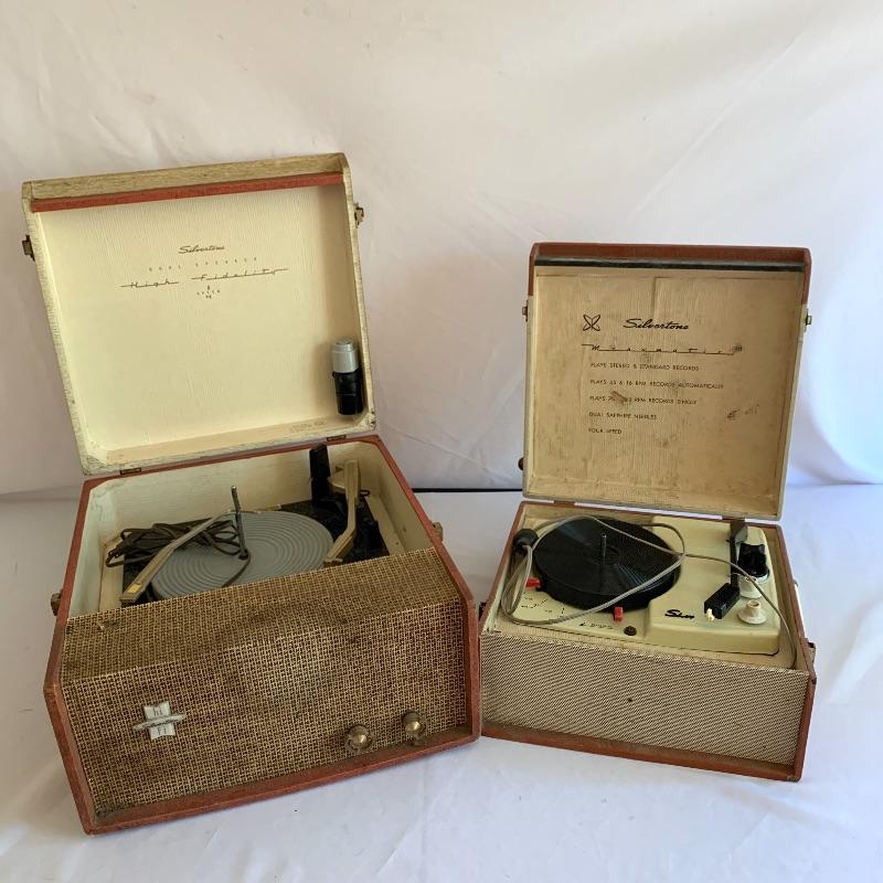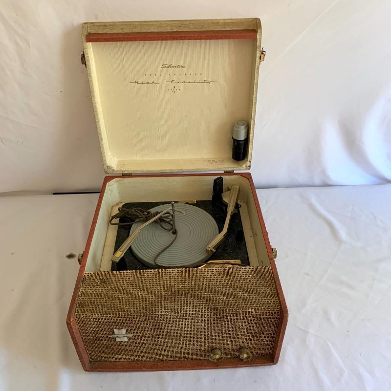 Silvertone Manumatic Model 255 comes in a portable case and is a four-speed unit. It makes a humming sound when plugged in. The Silvertone High Fidelity Syntronic Model 9244 is a four-speed unit that comes in a neat vintage case. It makes a humming sound when plugged in. Case says it has dual speakers. Also included in the lot is a Silvertone turntable that is unable to be plugged in to test functionality.