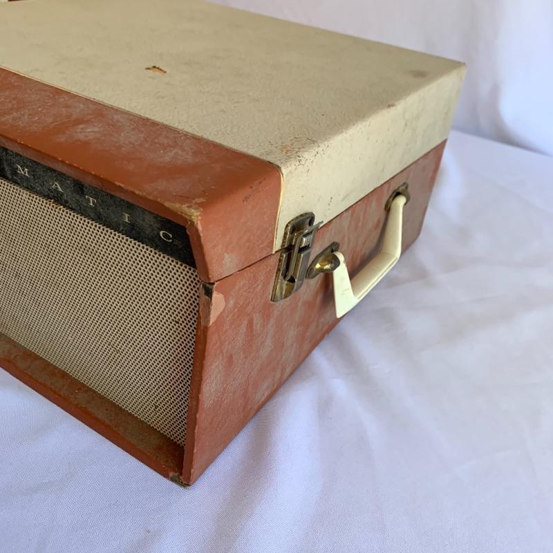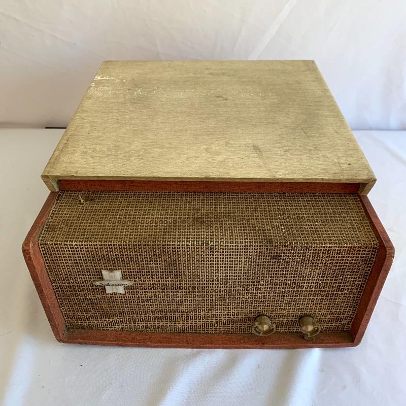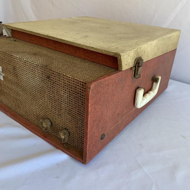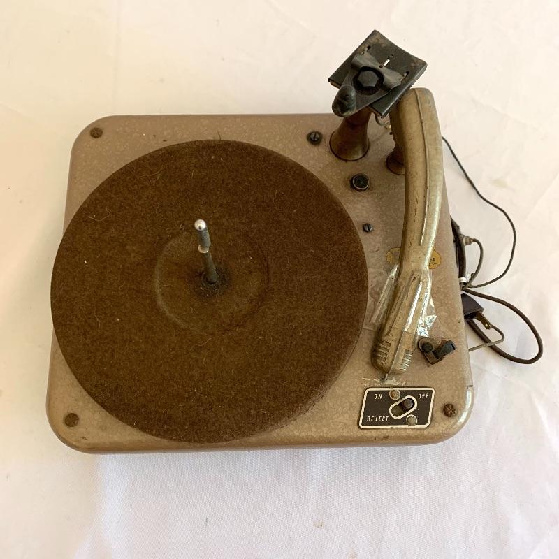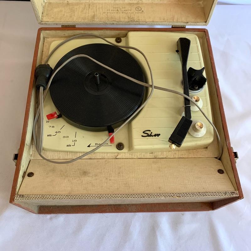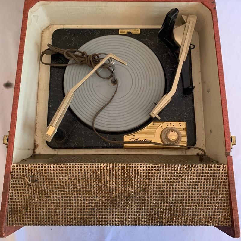 Silvertone Manumatic Model 255 comes in a portable case and is a four-speed unit. It makes a humming sound when plugged in. The Silvertone High Fidelity Syntronic Model 9244 is a four-speed unit that comes in a neat vintage case. It makes a humming sound when plugged in. Case says it has dual speakers. Also included in the lot is a Silvertone turntable that is unable to be plugged in to test functionality.