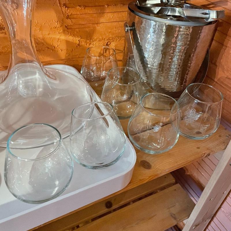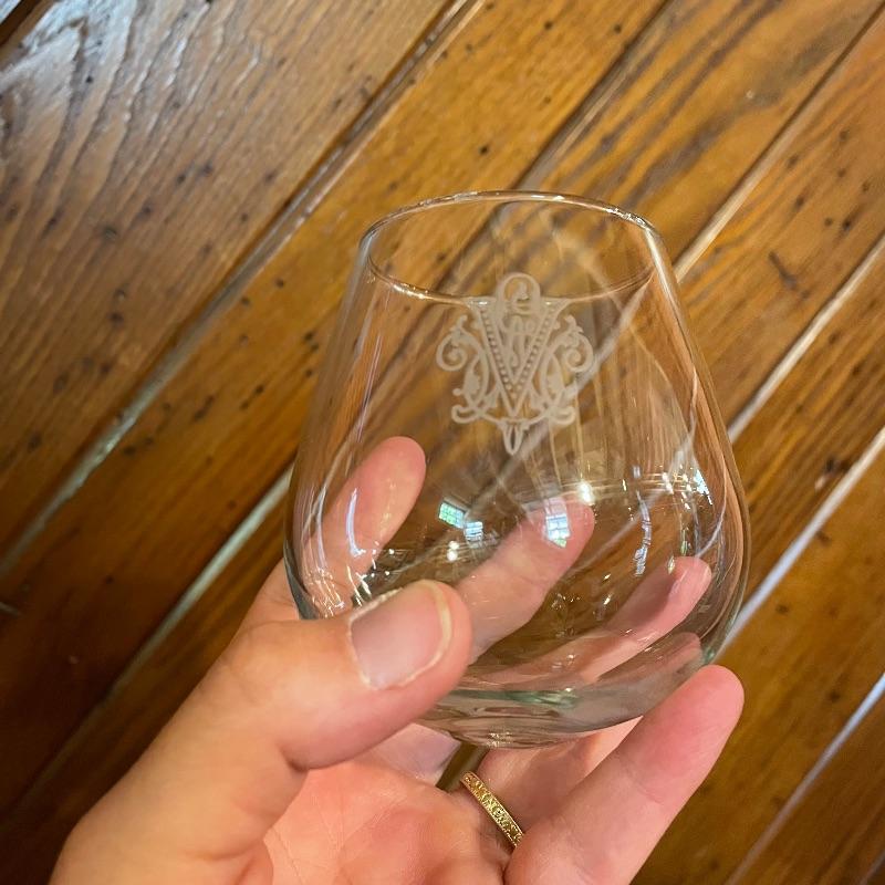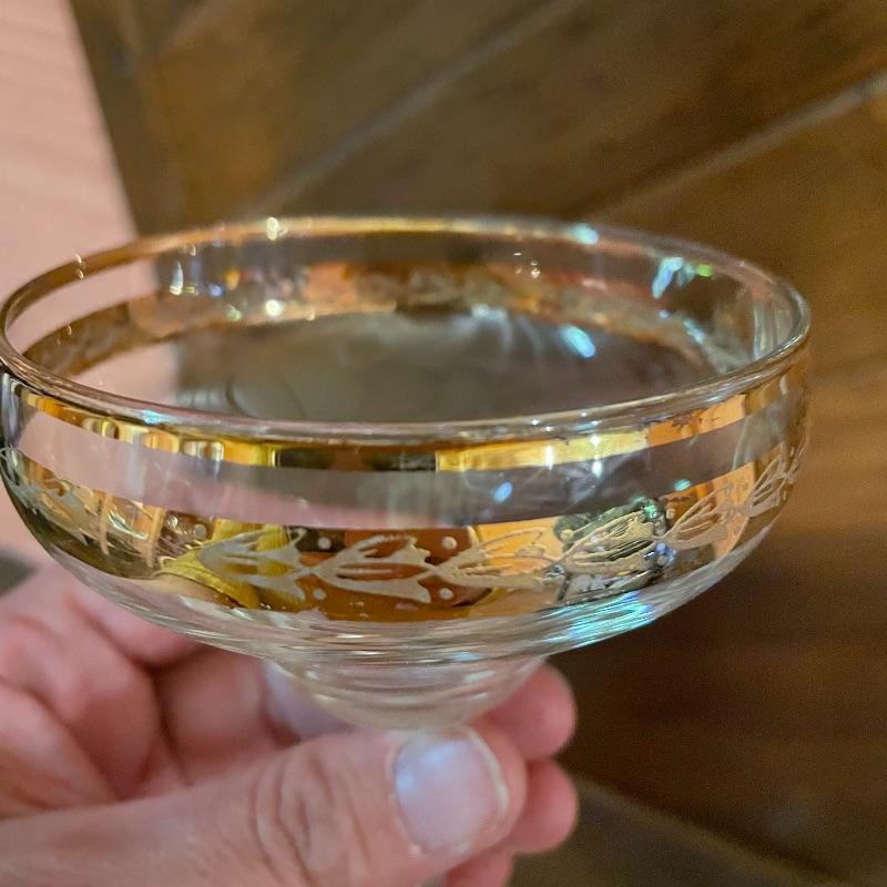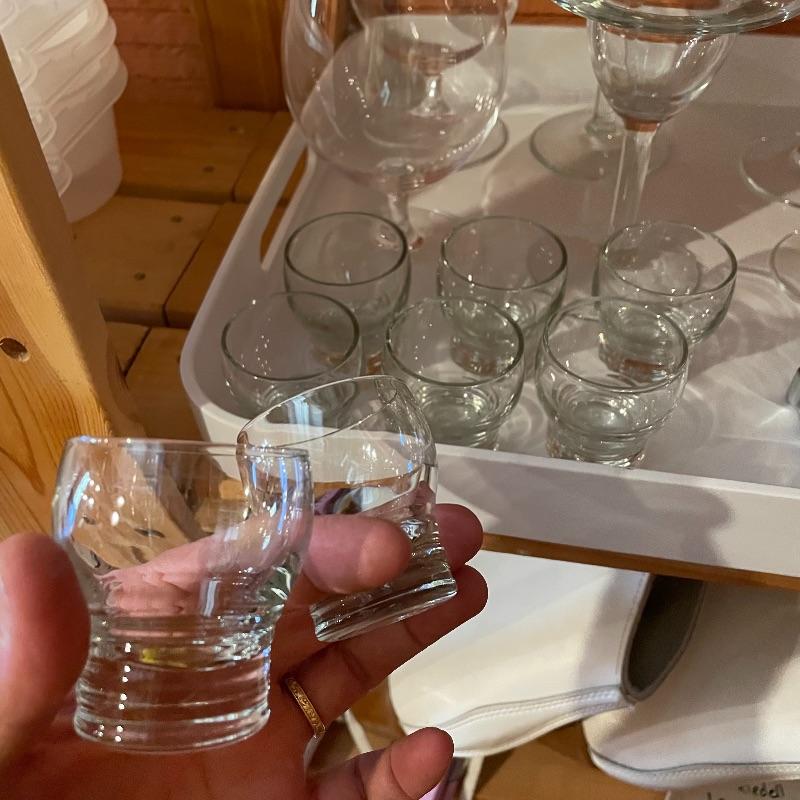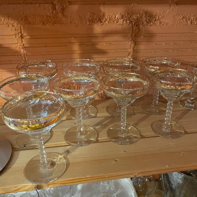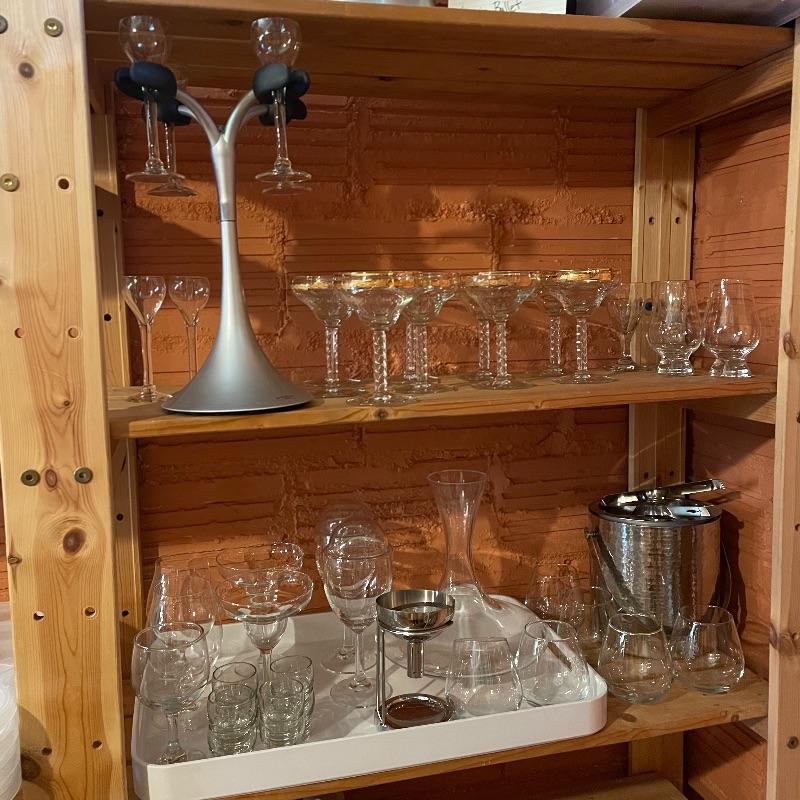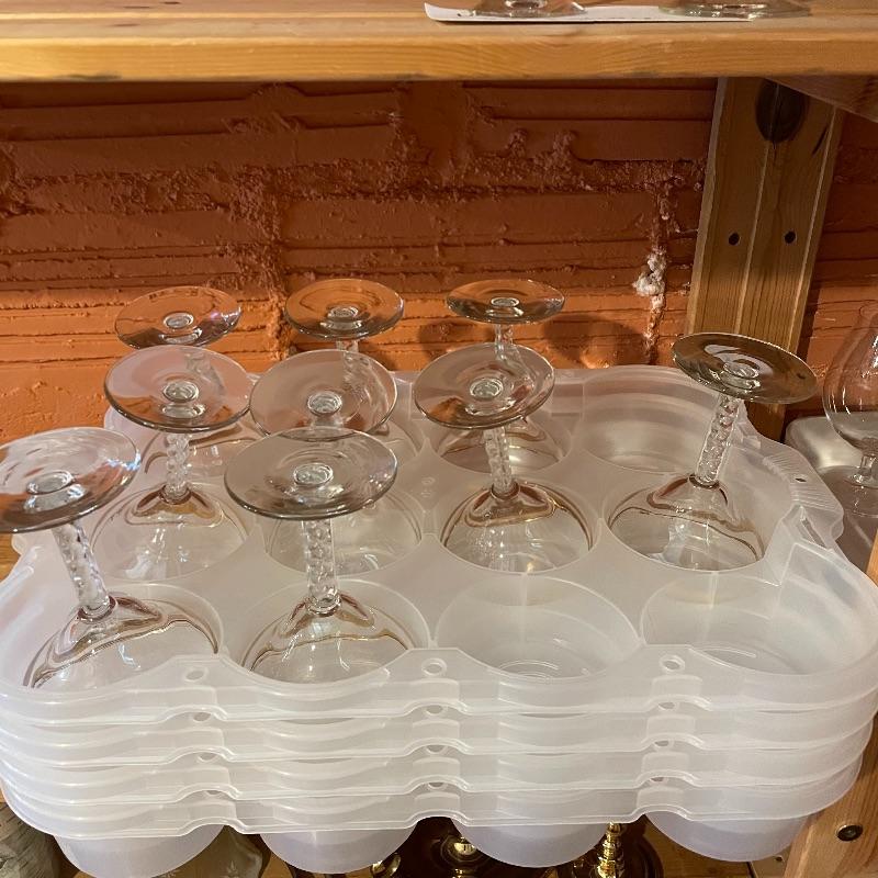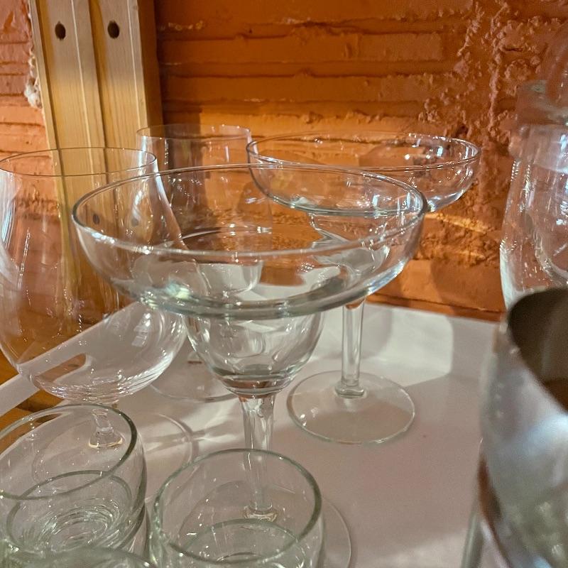 Add or upgrade your bar glassware with this large collection. Eleven 3.5”d x 5.25” champagne coups with a golden floral rim and textured stems. Eight shot glasses, six Biltmore stemless tasting glasses with the famous Vanderbilt V, two wine glasses with glass covers for making drinking outside a little more classy. Lot also includes a silver ice bucket and tongs, modern decanter, shaker lid stand, margarita and cordial glasses and lastly a plastic, sleek glass stand. Lot also contains four 12-glass plastic trays for storage/transportation, 16” x 13” x 2.5”. See images. Local pick up only.