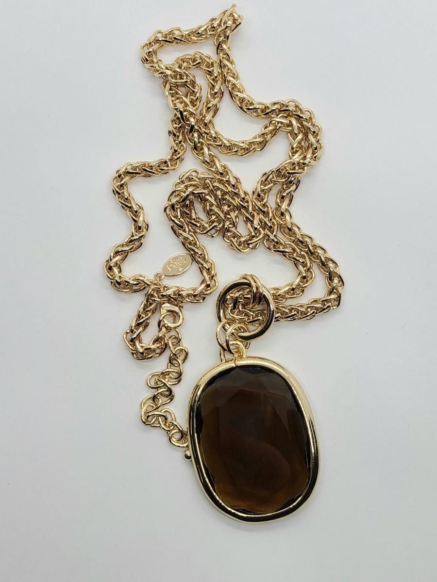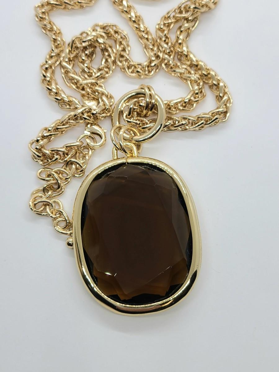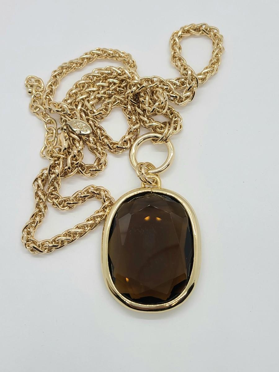 Lovely Joan Rivers large faux "smoky topaz" crystal pendant necklace with goldtone chain.