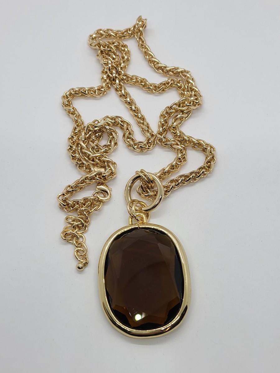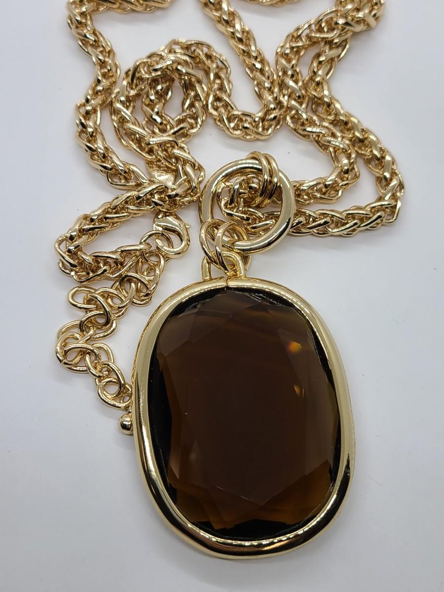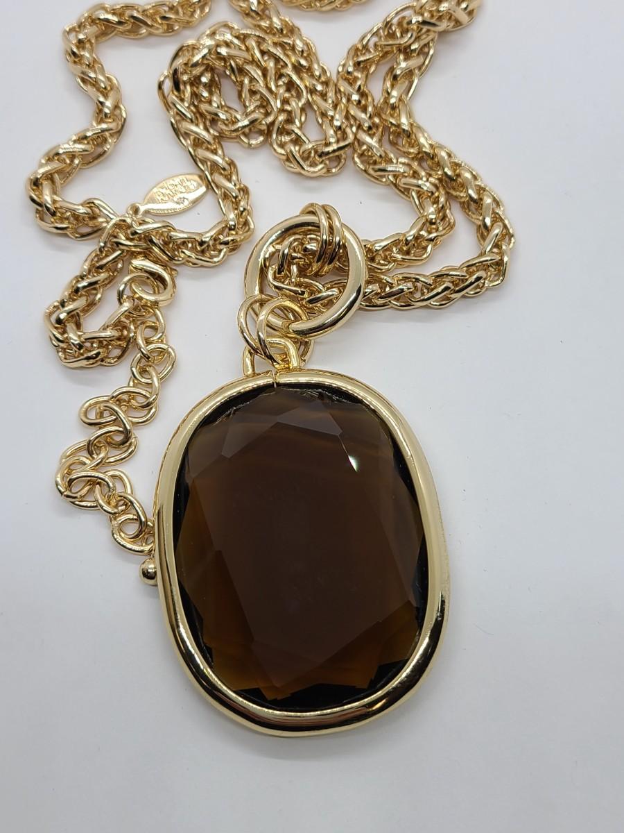 Lovely Joan Rivers large faux "smoky topaz" crystal pendant necklace with goldtone chain.