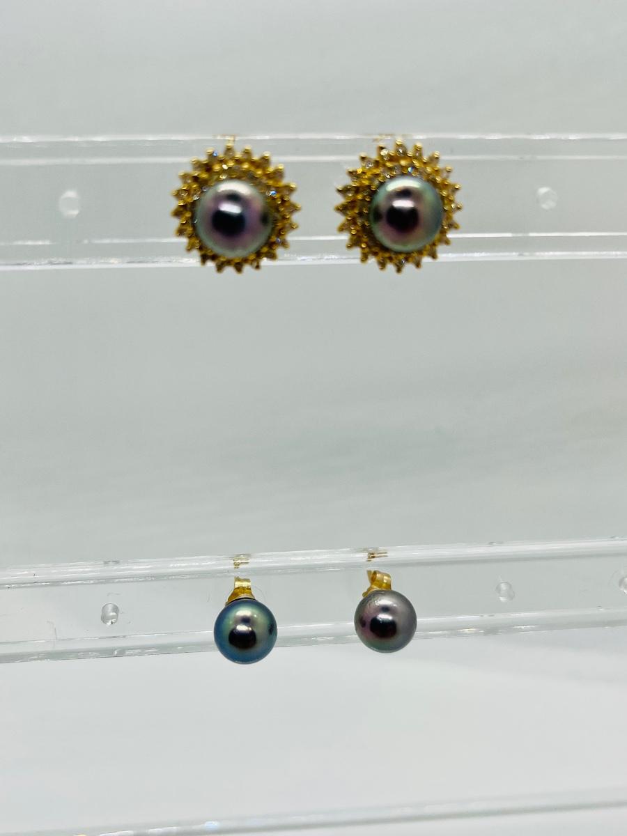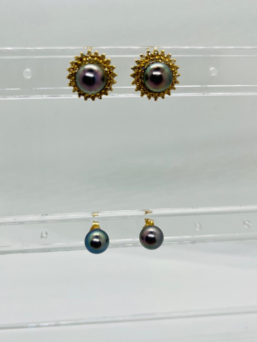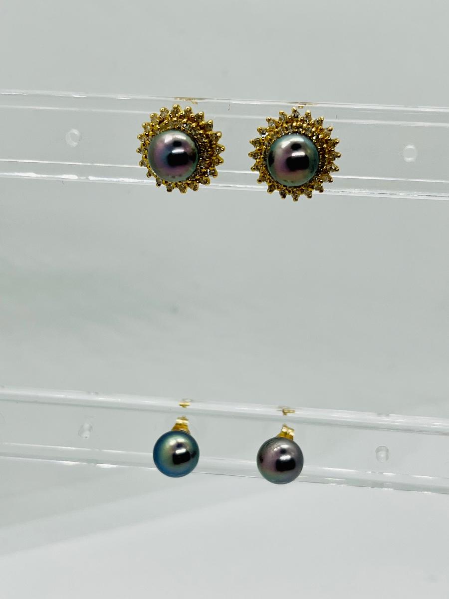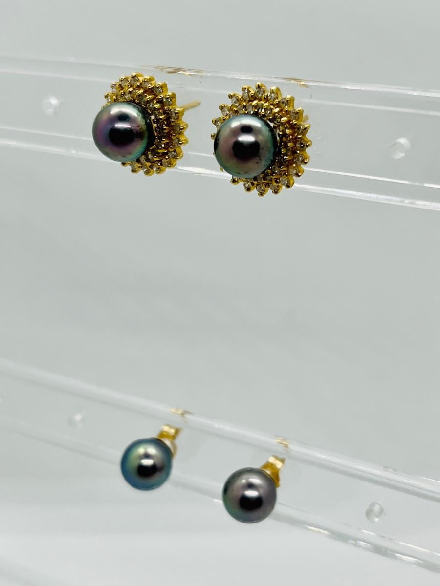 Lot 91: 14k cultured pearl earrings,  one pair surrounded with a halo of Diamond chips